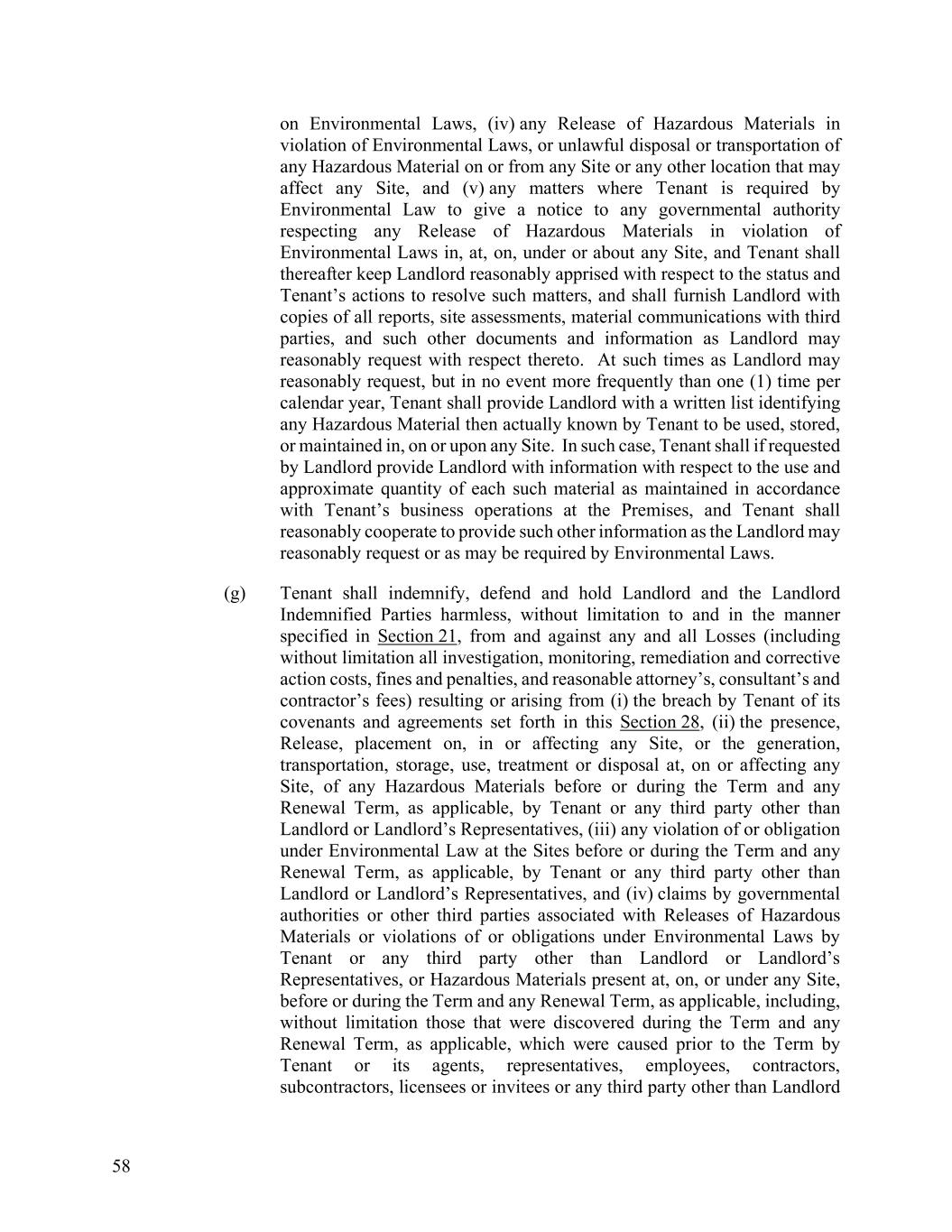 58 on Environmental Laws, (iv) any Release of Hazardous Materials in violation of Environmental Laws, or unlawful disposal or transportation of any Hazardous Material on or from any Site or any other location that may affect any Site, and (v) any matters where Tenant is required by Environmental Law to give a notice to any governmental authority respecting any Release of Hazardous Materials in violation of Environmental Laws in, at, on, under or about any Site, and Tenant shall thereafter keep Landlord reasonably apprised with respect to the status and Tenant’s actions to resolve such matters, and shall furnish Landlord with copies of all reports, site assessments, material communications with third parties, and such other documents and information as Landlord may reasonably request with respect thereto. At such times as Landlord may reasonably request, but in no event more frequently than one (1) time per calendar year, Tenant shall provide Landlord with a written list identifying any Hazardous Material then actually known by Tenant to be used, stored, or maintained in, on or upon any Site. In such case, Tenant shall if requested by Landlord provide Landlord with information with respect to the use and approximate quantity of each such material as maintained in accordance with Tenant’s business operations at the Premises, and Tenant shall reasonably cooperate to provide such other information as the Landlord may reasonably request or as may be required by Environmental Laws. (g) Tenant shall indemnify, defend and hold Landlord and the Landlord Indemnified Parties harmless, without limitation to and in the manner specified in Section 21, from and against any and all Losses (including without limitation all investigation, monitoring, remediation and corrective action costs, fines and penalties, and reasonable attorney’s, consultant’s and contractor’s fees) resulting or arising from (i) the breach by Tenant of its covenants and agreements set forth in this Section 28, (ii) the presence, Release, placement on, in or affecting any Site, or the generation, transportation, storage, use, treatment or disposal at, on or affecting any Site, of any Hazardous Materials before or during the Term and any Renewal Term, as applicable, by Tenant or any third party other than Landlord or Landlord’s Representatives, (iii) any violation of or obligation under Environmental Law at the Sites before or during the Term and any Renewal Term, as applicable, by Tenant or any third party other than Landlord or Landlord’s Representatives, and (iv) claims by governmental authorities or other third parties associated with Releases of Hazardous Materials or violations of or obligations under Environmental Laws by Tenant or any third party other than Landlord or Landlord’s Representatives, or Hazardous Materials present at, on, or under any Site, before or during the Term and any Renewal Term, as applicable, including, without limitation those that were discovered during the Term and any Renewal Term, as applicable, which were caused prior to the Term by Tenant or its agents, representatives, employees, contractors, subcontractors, licensees or invitees or any third party other than Landlord