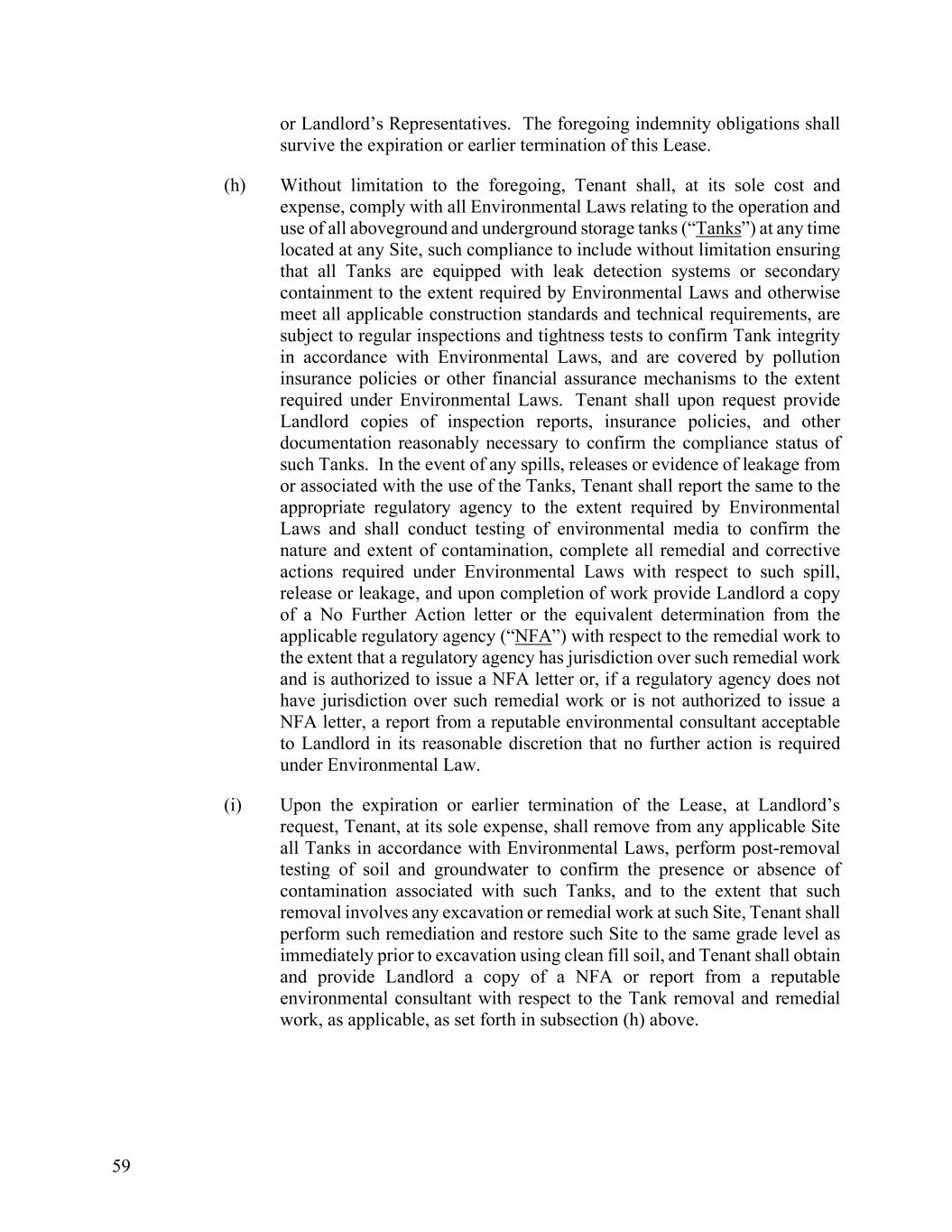 59 or Landlord’s Representatives. The foregoing indemnity obligations shall survive the expiration or earlier termination of this Lease. (h) Without limitation to the foregoing, Tenant shall, at its sole cost and expense, comply with all Environmental Laws relating to the operation and use of all aboveground and underground storage tanks (“Tanks”) at any time located at any Site, such compliance to include without limitation ensuring that all Tanks are equipped with leak detection systems or secondary containment to the extent required by Environmental Laws and otherwise meet all applicable construction standards and technical requirements, are subject to regular inspections and tightness tests to confirm Tank integrity in accordance with Environmental Laws, and are covered by pollution insurance policies or other financial assurance mechanisms to the extent required under Environmental Laws. Tenant shall upon request provide Landlord copies of inspection reports, insurance policies, and other documentation reasonably necessary to confirm the compliance status of such Tanks. In the event of any spills, releases or evidence of leakage from or associated with the use of the Tanks, Tenant shall report the same to the appropriate regulatory agency to the extent required by Environmental Laws and shall conduct testing of environmental media to confirm the nature and extent of contamination, complete all remedial and corrective actions required under Environmental Laws with respect to such spill, release or leakage, and upon completion of work provide Landlord a copy of a No Further Action letter or the equivalent determination from the applicable regulatory agency (“NFA”) with respect to the remedial work to the extent that a regulatory agency has jurisdiction over such remedial work and is authorized to issue a NFA letter or, if a regulatory agency does not have jurisdiction over such remedial work or is not authorized to issue a NFA letter, a report from a reputable environmental consultant acceptable to Landlord in its reasonable discretion that no further action is required under Environmental Law. (i) Upon the expiration or earlier termination of the Lease, at Landlord’s request, Tenant, at its sole expense, shall remove from any applicable Site all Tanks in accordance with Environmental Laws, perform post-removal testing of soil and groundwater to confirm the presence or absence of contamination associated with such Tanks, and to the extent that such removal involves any excavation or remedial work at such Site, Tenant shall perform such remediation and restore such Site to the same grade level as immediately prior to excavation using clean fill soil, and Tenant shall obtain and provide Landlord a copy of a NFA or report from a reputable environmental consultant with respect to the Tank removal and remedial work, as applicable, as set forth in subsection (h) above.