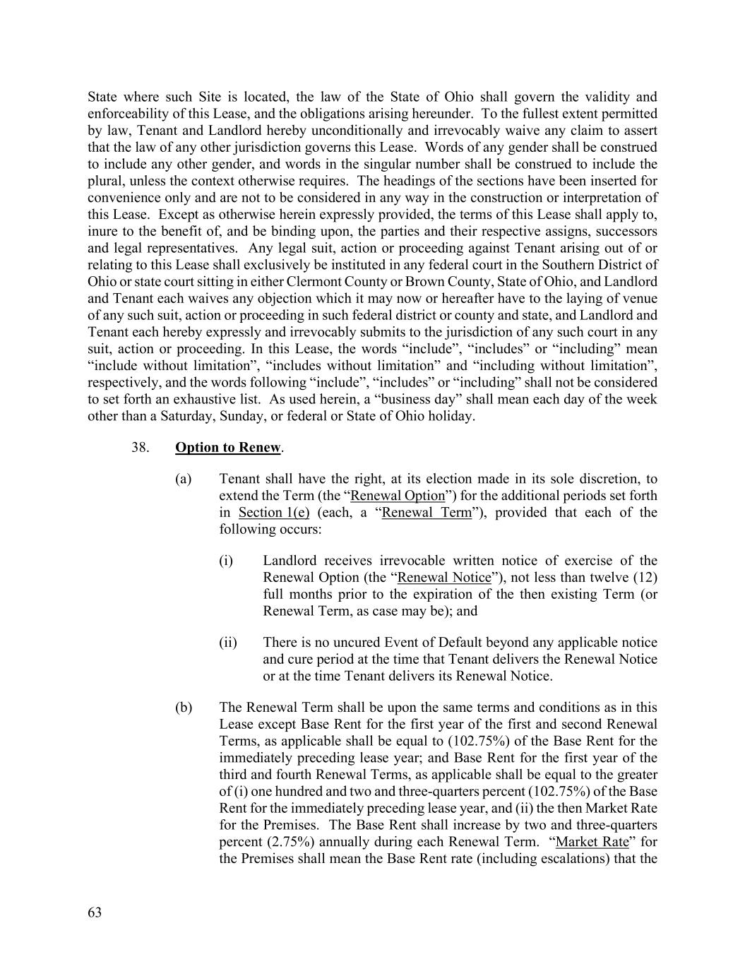 63 State where such Site is located, the law of the State of Ohio shall govern the validity and enforceability of this Lease, and the obligations arising hereunder. To the fullest extent permitted by law, Tenant and Landlord hereby unconditionally and irrevocably waive any claim to assert that the law of any other jurisdiction governs this Lease. Words of any gender shall be construed to include any other gender, and words in the singular number shall be construed to include the plural, unless the context otherwise requires. The headings of the sections have been inserted for convenience only and are not to be considered in any way in the construction or interpretation of this Lease. Except as otherwise herein expressly provided, the terms of this Lease shall apply to, inure to the benefit of, and be binding upon, the parties and their respective assigns, successors and legal representatives. Any legal suit, action or proceeding against Tenant arising out of or relating to this Lease shall exclusively be instituted in any federal court in the Southern District of Ohio or state court sitting in either Clermont County or Brown County, State of Ohio, and Landlord and Tenant each waives any objection which it may now or hereafter have to the laying of venue of any such suit, action or proceeding in such federal district or county and state, and Landlord and Tenant each hereby expressly and irrevocably submits to the jurisdiction of any such court in any suit, action or proceeding. In this Lease, the words “include”, “includes” or “including” mean “include without limitation”, “includes without limitation” and “including without limitation”, respectively, and the words following “include”, “includes” or “including” shall not be considered to set forth an exhaustive list. As used herein, a “business day” shall mean each day of the week other than a Saturday, Sunday, or federal or State of Ohio holiday. 38. Option to Renew. (a) Tenant shall have the right, at its election made in its sole discretion, to extend the Term (the “Renewal Option”) for the additional periods set forth in Section 1(e) (each, a “Renewal Term”), provided that each of the following occurs: (i) Landlord receives irrevocable written notice of exercise of the Renewal Option (the “Renewal Notice”), not less than twelve (12) full months prior to the expiration of the then existing Term (or Renewal Term, as case may be); and (ii) There is no uncured Event of Default beyond any applicable notice and cure period at the time that Tenant delivers the Renewal Notice or at the time Tenant delivers its Renewal Notice. (b) The Renewal Term shall be upon the same terms and conditions as in this Lease except Base Rent for the first year of the first and second Renewal Terms, as applicable shall be equal to (102.75%) of the Base Rent for the immediately preceding lease year; and Base Rent for the first year of the third and fourth Renewal Terms, as applicable shall be equal to the greater of (i) one hundred and two and three-quarters percent (102.75%) of the Base Rent for the immediately preceding lease year, and (ii) the then Market Rate for the Premises. The Base Rent shall increase by two and three-quarters percent (2.75%) annually during each Renewal Term. “Market Rate” for the Premises shall mean the Base Rent rate (including escalations) that the