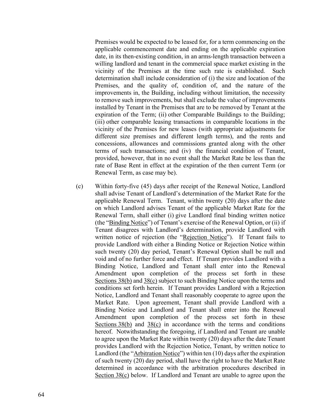 64 Premises would be expected to be leased for, for a term commencing on the applicable commencement date and ending on the applicable expiration date, in its then-existing condition, in an arms-length transaction between a willing landlord and tenant in the commercial space market existing in the vicinity of the Premises at the time such rate is established. Such determination shall include consideration of (i) the size and location of the Premises, and the quality of, condition of, and the nature of the improvements in, the Building, including without limitation, the necessity to remove such improvements, but shall exclude the value of improvements installed by Tenant in the Premises that are to be removed by Tenant at the expiration of the Term; (ii) other Comparable Buildings to the Building; (iii) other comparable leasing transactions in comparable locations in the vicinity of the Premises for new leases (with appropriate adjustments for different size premises and different length terms), and the rents and concessions, allowances and commissions granted along with the other terms of such transactions; and (iv) the financial condition of Tenant, provided, however, that in no event shall the Market Rate be less than the rate of Base Rent in effect at the expiration of the then current Term (or Renewal Term, as case may be). (c) Within forty-five (45) days after receipt of the Renewal Notice, Landlord shall advise Tenant of Landlord’s determination of the Market Rate for the applicable Renewal Term. Tenant, within twenty (20) days after the date on which Landlord advises Tenant of the applicable Market Rate for the Renewal Term, shall either (i) give Landlord final binding written notice (the “Binding Notice”) of Tenant’s exercise of the Renewal Option, or (ii) if Tenant disagrees with Landlord’s determination, provide Landlord with written notice of rejection (the “Rejection Notice”). If Tenant fails to provide Landlord with either a Binding Notice or Rejection Notice within such twenty (20) day period, Tenant’s Renewal Option shall be null and void and of no further force and effect. If Tenant provides Landlord with a Binding Notice, Landlord and Tenant shall enter into the Renewal Amendment upon completion of the process set forth in these Sections 38(b) and 38(c) subject to such Binding Notice upon the terms and conditions set forth herein. If Tenant provides Landlord with a Rejection Notice, Landlord and Tenant shall reasonably cooperate to agree upon the Market Rate. Upon agreement, Tenant shall provide Landlord with a Binding Notice and Landlord and Tenant shall enter into the Renewal Amendment upon completion of the process set forth in these Sections 38(b) and 38(c) in accordance with the terms and conditions hereof. Notwithstanding the foregoing, if Landlord and Tenant are unable to agree upon the Market Rate within twenty (20) days after the date Tenant provides Landlord with the Rejection Notice, Tenant, by written notice to Landlord (the “Arbitration Notice”) within ten (10) days after the expiration of such twenty (20) day period, shall have the right to have the Market Rate determined in accordance with the arbitration procedures described in Section 38(c) below. If Landlord and Tenant are unable to agree upon the