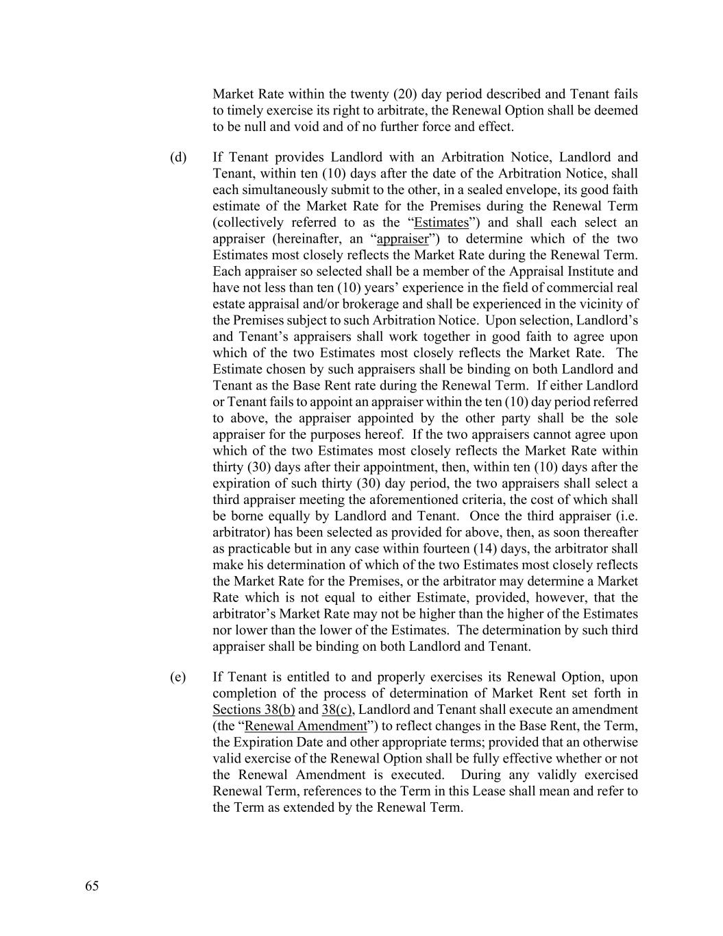 65 Market Rate within the twenty (20) day period described and Tenant fails to timely exercise its right to arbitrate, the Renewal Option shall be deemed to be null and void and of no further force and effect. (d) If Tenant provides Landlord with an Arbitration Notice, Landlord and Tenant, within ten (10) days after the date of the Arbitration Notice, shall each simultaneously submit to the other, in a sealed envelope, its good faith estimate of the Market Rate for the Premises during the Renewal Term (collectively referred to as the “Estimates”) and shall each select an appraiser (hereinafter, an “appraiser”) to determine which of the two Estimates most closely reflects the Market Rate during the Renewal Term. Each appraiser so selected shall be a member of the Appraisal Institute and have not less than ten (10) years’ experience in the field of commercial real estate appraisal and/or brokerage and shall be experienced in the vicinity of the Premises subject to such Arbitration Notice. Upon selection, Landlord’s and Tenant’s appraisers shall work together in good faith to agree upon which of the two Estimates most closely reflects the Market Rate. The Estimate chosen by such appraisers shall be binding on both Landlord and Tenant as the Base Rent rate during the Renewal Term. If either Landlord or Tenant fails to appoint an appraiser within the ten (10) day period referred to above, the appraiser appointed by the other party shall be the sole appraiser for the purposes hereof. If the two appraisers cannot agree upon which of the two Estimates most closely reflects the Market Rate within thirty (30) days after their appointment, then, within ten (10) days after the expiration of such thirty (30) day period, the two appraisers shall select a third appraiser meeting the aforementioned criteria, the cost of which shall be borne equally by Landlord and Tenant. Once the third appraiser (i.e. arbitrator) has been selected as provided for above, then, as soon thereafter as practicable but in any case within fourteen (14) days, the arbitrator shall make his determination of which of the two Estimates most closely reflects the Market Rate for the Premises, or the arbitrator may determine a Market Rate which is not equal to either Estimate, provided, however, that the arbitrator’s Market Rate may not be higher than the higher of the Estimates nor lower than the lower of the Estimates. The determination by such third appraiser shall be binding on both Landlord and Tenant. (e) If Tenant is entitled to and properly exercises its Renewal Option, upon completion of the process of determination of Market Rent set forth in Sections 38(b) and 38(c), Landlord and Tenant shall execute an amendment (the “Renewal Amendment”) to reflect changes in the Base Rent, the Term, the Expiration Date and other appropriate terms; provided that an otherwise valid exercise of the Renewal Option shall be fully effective whether or not the Renewal Amendment is executed. During any validly exercised Renewal Term, references to the Term in this Lease shall mean and refer to the Term as extended by the Renewal Term.