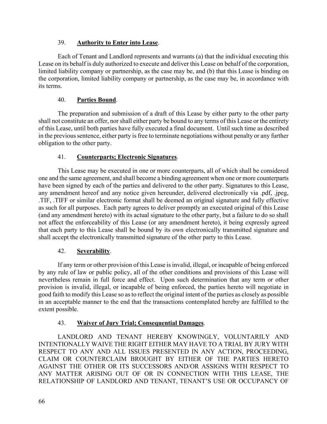 66 39. Authority to Enter into Lease. Each of Tenant and Landlord represents and warrants (a) that the individual executing this Lease on its behalf is duly authorized to execute and deliver this Lease on behalf of the corporation, limited liability company or partnership, as the case may be, and (b) that this Lease is binding on the corporation, limited liability company or partnership, as the case may be, in accordance with its terms. 40. Parties Bound. The preparation and submission of a draft of this Lease by either party to the other party shall not constitute an offer, nor shall either party be bound to any terms of this Lease or the entirety of this Lease, until both parties have fully executed a final document. Until such time as described in the previous sentence, either party is free to terminate negotiations without penalty or any further obligation to the other party. 41. Counterparts; Electronic Signatures. This Lease may be executed in one or more counterparts, all of which shall be considered one and the same agreement, and shall become a binding agreement when one or more counterparts have been signed by each of the parties and delivered to the other party. Signatures to this Lease, any amendment hereof and any notice given hereunder, delivered electronically via .pdf, .jpeg, .TIF, .TIFF or similar electronic format shall be deemed an original signature and fully effective as such for all purposes. Each party agrees to deliver promptly an executed original of this Lease (and any amendment hereto) with its actual signature to the other party, but a failure to do so shall not affect the enforceability of this Lease (or any amendment hereto), it being expressly agreed that each party to this Lease shall be bound by its own electronically transmitted signature and shall accept the electronically transmitted signature of the other party to this Lease. 42. Severability. If any term or other provision of this Lease is invalid, illegal, or incapable of being enforced by any rule of law or public policy, all of the other conditions and provisions of this Lease will nevertheless remain in full force and effect. Upon such determination that any term or other provision is invalid, illegal, or incapable of being enforced, the parties hereto will negotiate in good faith to modify this Lease so as to reflect the original intent of the parties as closely as possible in an acceptable manner to the end that the transactions contemplated hereby are fulfilled to the extent possible. 43. Waiver of Jury Trial; Consequential Damages. LANDLORD AND TENANT HEREBY KNOWINGLY, VOLUNTARILY AND INTENTIONALLY WAIVE THE RIGHT EITHER MAY HAVE TO A TRIAL BY JURY WITH RESPECT TO ANY AND ALL ISSUES PRESENTED IN ANY ACTION, PROCEEDING, CLAIM OR COUNTERCLAIM BROUGHT BY EITHER OF THE PARTIES HERETO AGAINST THE OTHER OR ITS SUCCESSORS AND/OR ASSIGNS WITH RESPECT TO ANY MATTER ARISING OUT OF OR IN CONNECTION WITH THIS LEASE, THE RELATIONSHIP OF LANDLORD AND TENANT, TENANT’S USE OR OCCUPANCY OF