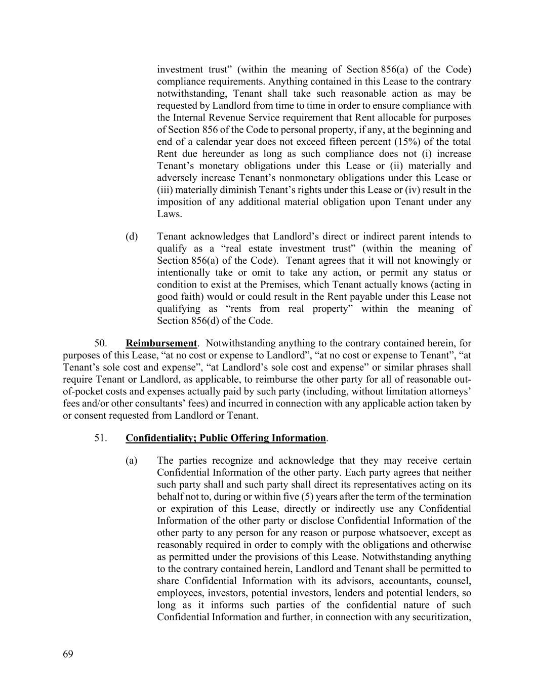 69 investment trust” (within the meaning of Section 856(a) of the Code) compliance requirements. Anything contained in this Lease to the contrary notwithstanding, Tenant shall take such reasonable action as may be requested by Landlord from time to time in order to ensure compliance with the Internal Revenue Service requirement that Rent allocable for purposes of Section 856 of the Code to personal property, if any, at the beginning and end of a calendar year does not exceed fifteen percent (15%) of the total Rent due hereunder as long as such compliance does not (i) increase Tenant’s monetary obligations under this Lease or (ii) materially and adversely increase Tenant’s nonmonetary obligations under this Lease or (iii) materially diminish Tenant’s rights under this Lease or (iv) result in the imposition of any additional material obligation upon Tenant under any Laws. (d) Tenant acknowledges that Landlord’s direct or indirect parent intends to qualify as a “real estate investment trust” (within the meaning of Section 856(a) of the Code). Tenant agrees that it will not knowingly or intentionally take or omit to take any action, or permit any status or condition to exist at the Premises, which Tenant actually knows (acting in good faith) would or could result in the Rent payable under this Lease not qualifying as “rents from real property” within the meaning of Section 856(d) of the Code. 50. Reimbursement. Notwithstanding anything to the contrary contained herein, for purposes of this Lease, “at no cost or expense to Landlord”, “at no cost or expense to Tenant”, “at Tenant’s sole cost and expense”, “at Landlord’s sole cost and expense” or similar phrases shall require Tenant or Landlord, as applicable, to reimburse the other party for all of reasonable out- of-pocket costs and expenses actually paid by such party (including, without limitation attorneys’ fees and/or other consultants’ fees) and incurred in connection with any applicable action taken by or consent requested from Landlord or Tenant. 51. Confidentiality; Public Offering Information. (a) The parties recognize and acknowledge that they may receive certain Confidential Information of the other party. Each party agrees that neither such party shall and such party shall direct its representatives acting on its behalf not to, during or within five (5) years after the term of the termination or expiration of this Lease, directly or indirectly use any Confidential Information of the other party or disclose Confidential Information of the other party to any person for any reason or purpose whatsoever, except as reasonably required in order to comply with the obligations and otherwise as permitted under the provisions of this Lease. Notwithstanding anything to the contrary contained herein, Landlord and Tenant shall be permitted to share Confidential Information with its advisors, accountants, counsel, employees, investors, potential investors, lenders and potential lenders, so long as it informs such parties of the confidential nature of such Confidential Information and further, in connection with any securitization,