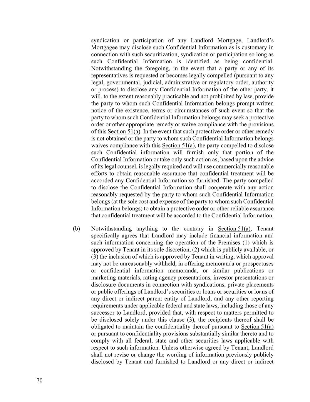 70 syndication or participation of any Landlord Mortgage, Landlord’s Mortgagee may disclose such Confidential Information as is customary in connection with such securitization, syndication or participation so long as such Confidential Information is identified as being confidential. Notwithstanding the foregoing, in the event that a party or any of its representatives is requested or becomes legally compelled (pursuant to any legal, governmental, judicial, administrative or regulatory order, authority or process) to disclose any Confidential Information of the other party, it will, to the extent reasonably practicable and not prohibited by law, provide the party to whom such Confidential Information belongs prompt written notice of the existence, terms or circumstances of such event so that the party to whom such Confidential Information belongs may seek a protective order or other appropriate remedy or waive compliance with the provisions of this Section 51(a). In the event that such protective order or other remedy is not obtained or the party to whom such Confidential Information belongs waives compliance with this Section 51(a), the party compelled to disclose such Confidential information will furnish only that portion of the Confidential Information or take only such action as, based upon the advice of its legal counsel, is legally required and will use commercially reasonable efforts to obtain reasonable assurance that confidential treatment will be accorded any Confidential Information so furnished. The party compelled to disclose the Confidential Information shall cooperate with any action reasonably requested by the party to whom such Confidential Information belongs (at the sole cost and expense of the party to whom such Confidential Information belongs) to obtain a protective order or other reliable assurance that confidential treatment will be accorded to the Confidential Information. (b) Notwithstanding anything to the contrary in Section 51(a), Tenant specifically agrees that Landlord may include financial information and such information concerning the operation of the Premises (1) which is approved by Tenant in its sole discretion, (2) which is publicly available, or (3) the inclusion of which is approved by Tenant in writing, which approval may not be unreasonably withheld, in offering memoranda or prospectuses or confidential information memoranda, or similar publications or marketing materials, rating agency presentations, investor presentations or disclosure documents in connection with syndications, private placements or public offerings of Landlord’s securities or loans or securities or loans of any direct or indirect parent entity of Landlord, and any other reporting requirements under applicable federal and state laws, including those of any successor to Landlord, provided that, with respect to matters permitted to be disclosed solely under this clause (3), the recipients thereof shall be obligated to maintain the confidentiality thereof pursuant to Section 51(a) or pursuant to confidentiality provisions substantially similar thereto and to comply with all federal, state and other securities laws applicable with respect to such information. Unless otherwise agreed by Tenant, Landlord shall not revise or change the wording of information previously publicly disclosed by Tenant and furnished to Landlord or any direct or indirect