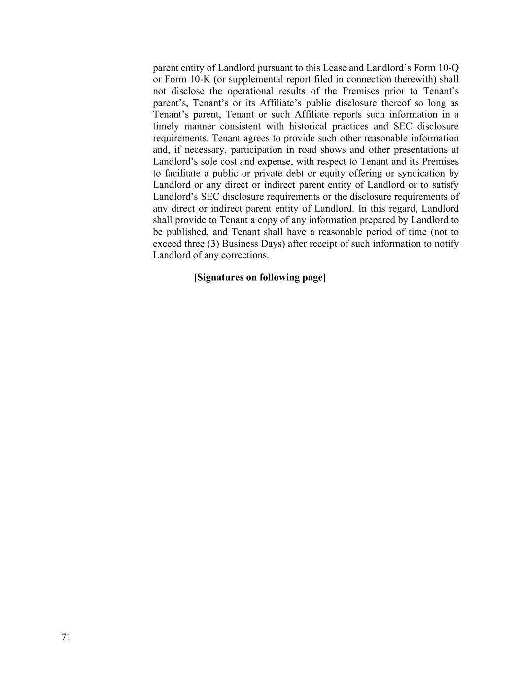 71 parent entity of Landlord pursuant to this Lease and Landlord’s Form 10-Q or Form 10-K (or supplemental report filed in connection therewith) shall not disclose the operational results of the Premises prior to Tenant’s parent’s, Tenant’s or its Affiliate’s public disclosure thereof so long as Tenant’s parent, Tenant or such Affiliate reports such information in a timely manner consistent with historical practices and SEC disclosure requirements. Tenant agrees to provide such other reasonable information and, if necessary, participation in road shows and other presentations at Landlord’s sole cost and expense, with respect to Tenant and its Premises to facilitate a public or private debt or equity offering or syndication by Landlord or any direct or indirect parent entity of Landlord or to satisfy Landlord’s SEC disclosure requirements or the disclosure requirements of any direct or indirect parent entity of Landlord. In this regard, Landlord shall provide to Tenant a copy of any information prepared by Landlord to be published, and Tenant shall have a reasonable period of time (not to exceed three (3) Business Days) after receipt of such information to notify Landlord of any corrections. [Signatures on following page]