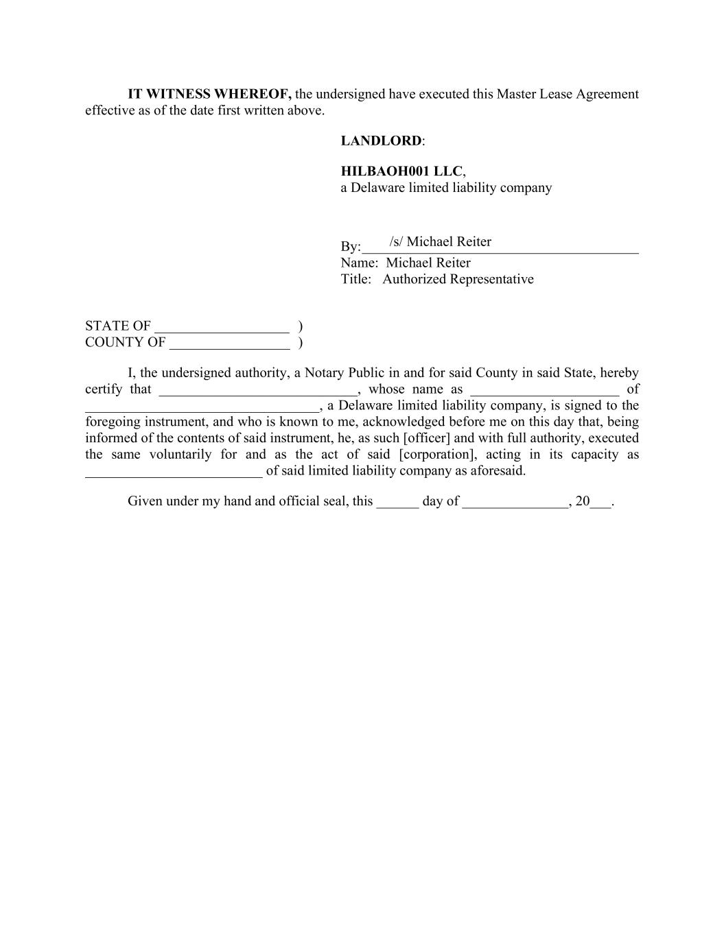 IT WITNESS WHEREOF, the undersigned have executed this Master Lease Agreement effective as of the date first written above. LANDLORD: HILBAOH001 LLC, a Delaware limited liability company By: _______________________________________ Name: Michael Reiter Title: Authorized Representative STATE OF ___________________ ) COUNTY OF _________________ ) I, the undersigned authority, a Notary Public in and for said County in said State, hereby certify that ____________________________, whose name as _____________________ of _________________________________, a Delaware limited liability company, is signed to the foregoing instrument, and who is known to me, acknowledged before me on this day that, being informed of the contents of said instrument, he, as such [officer] and with full authority, executed the same voluntarily for and as the act of said [corporation], acting in its capacity as _________________________ of said limited liability company as aforesaid. Given under my hand and official seal, this ______ day of _______________, 20___. /s/ Michael Reiter