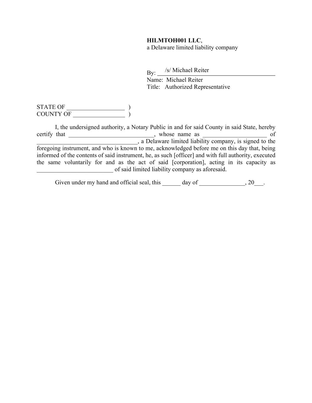 HILMTOH001 LLC, a Delaware limited liability company By: Name: Michael Reiter Title: Authorized Representative STATE OF ___________________ ) COUNTY OF _________________ ) I, the undersigned authority, a Notary Public in and for said County in said State, hereby certify that ____________________________, whose name as _____________________ of _________________________________, a Delaware limited liability company, is signed to the foregoing instrument, and who is known to me, acknowledged before me on this day that, being informed of the contents of said instrument, he, as such [officer] and with full authority, executed the same voluntarily for and as the act of said [corporation], acting in its capacity as _________________________ of said limited liability company as aforesaid. Given under my hand and official seal, this ______ day of _______________, 20___. /s/ Michael Reiter