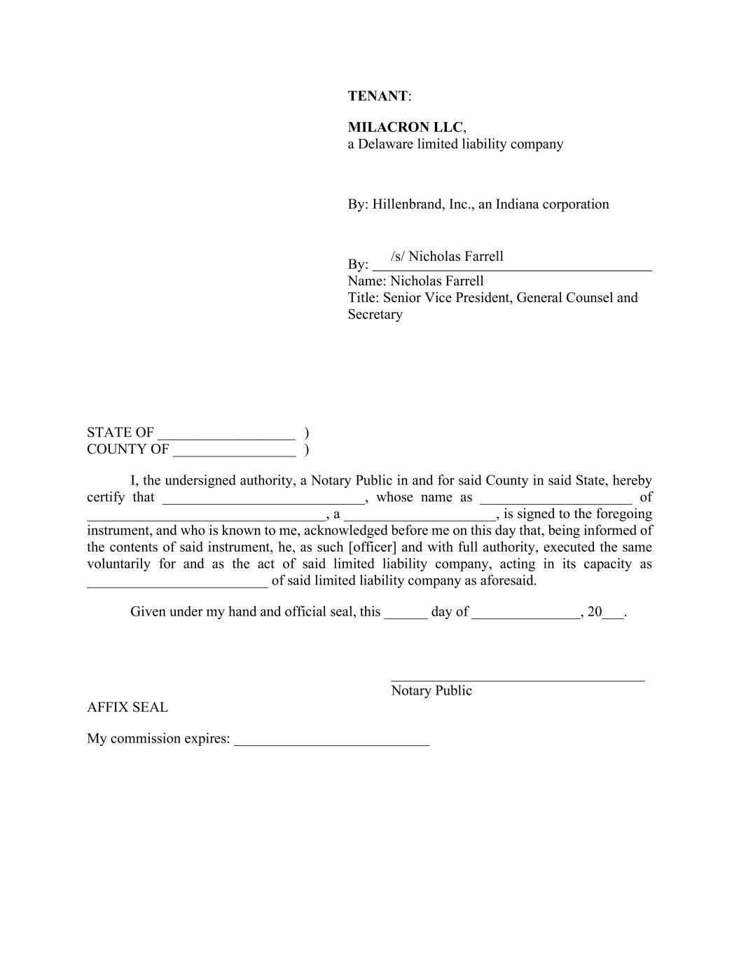 TENANT: MILACRON LLC, a Delaware limited liability company By: Hillenbrand, Inc., an Indiana corporation By: Name: Nicholas Farrell Title: Senior Vice President, General Counsel and Secretary STATE OF ___________________ ) COUNTY OF _________________ ) I, the undersigned authority, a Notary Public in and for said County in said State, hereby certify that ____________________________, whose name as _____________________ of _________________________________, a _____________________, is signed to the foregoing instrument, and who is known to me, acknowledged before me on this day that, being informed of the contents of said instrument, he, as such [officer] and with full authority, executed the same voluntarily for and as the act of said limited liability company, acting in its capacity as _________________________ of said limited liability company as aforesaid. Given under my hand and official seal, this ______ day of _______________, 20___. ___________________________________ Notary Public AFFIX SEAL My commission expires: ___________________________ /s/ Nicholas Farrell