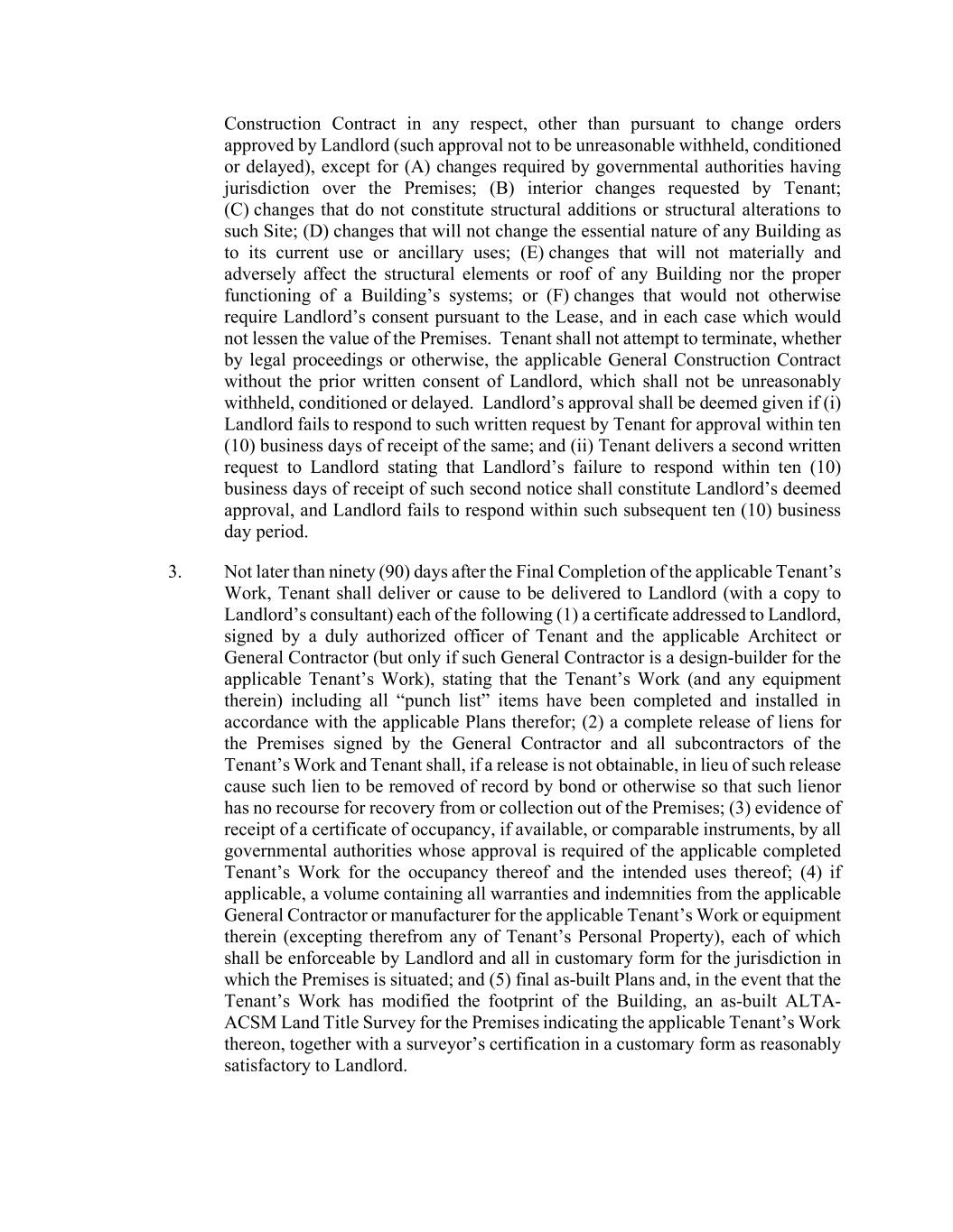 Construction Contract in any respect, other than pursuant to change orders approved by Landlord (such approval not to be unreasonable withheld, conditioned or delayed), except for (A) changes required by governmental authorities having jurisdiction over the Premises; (B) interior changes requested by Tenant; (C) changes that do not constitute structural additions or structural alterations to such Site; (D) changes that will not change the essential nature of any Building as to its current use or ancillary uses; (E) changes that will not materially and adversely affect the structural elements or roof of any Building nor the proper functioning of a Building’s systems; or (F) changes that would not otherwise require Landlord’s consent pursuant to the Lease, and in each case which would not lessen the value of the Premises. Tenant shall not attempt to terminate, whether by legal proceedings or otherwise, the applicable General Construction Contract without the prior written consent of Landlord, which shall not be unreasonably withheld, conditioned or delayed. Landlord’s approval shall be deemed given if (i) Landlord fails to respond to such written request by Tenant for approval within ten (10) business days of receipt of the same; and (ii) Tenant delivers a second written request to Landlord stating that Landlord’s failure to respond within ten (10) business days of receipt of such second notice shall constitute Landlord’s deemed approval, and Landlord fails to respond within such subsequent ten (10) business day period. 3. Not later than ninety (90) days after the Final Completion of the applicable Tenant’s Work, Tenant shall deliver or cause to be delivered to Landlord (with a copy to Landlord’s consultant) each of the following (1) a certificate addressed to Landlord, signed by a duly authorized officer of Tenant and the applicable Architect or General Contractor (but only if such General Contractor is a design-builder for the applicable Tenant’s Work), stating that the Tenant’s Work (and any equipment therein) including all “punch list” items have been completed and installed in accordance with the applicable Plans therefor; (2) a complete release of liens for the Premises signed by the General Contractor and all subcontractors of the Tenant’s Work and Tenant shall, if a release is not obtainable, in lieu of such release cause such lien to be removed of record by bond or otherwise so that such lienor has no recourse for recovery from or collection out of the Premises; (3) evidence of receipt of a certificate of occupancy, if available, or comparable instruments, by all governmental authorities whose approval is required of the applicable completed Tenant’s Work for the occupancy thereof and the intended uses thereof; (4) if applicable, a volume containing all warranties and indemnities from the applicable General Contractor or manufacturer for the applicable Tenant’s Work or equipment therein (excepting therefrom any of Tenant’s Personal Property), each of which shall be enforceable by Landlord and all in customary form for the jurisdiction in which the Premises is situated; and (5) final as-built Plans and, in the event that the Tenant’s Work has modified the footprint of the Building, an as-built ALTA- ACSM Land Title Survey for the Premises indicating the applicable Tenant’s Work thereon, together with a surveyor’s certification in a customary form as reasonably satisfactory to Landlord.