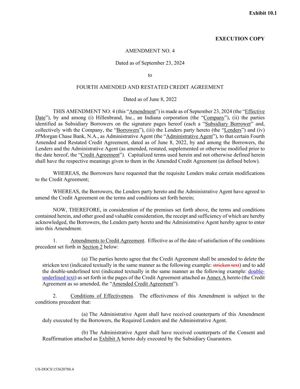 US-DOCS\153620788.4 EXECUTION COPY AMENDMENT NO. 4 Dated as of September 23, 2024 to FOURTH AMENDED AND RESTATED CREDIT AGREEMENT Dated as of June 8, 2022 THIS AMENDMENT NO. 4 (this “Amendment”) is made as of September 23, 2024 (the “Effective Date”), by and among (i) Hillenbrand, Inc., an Indiana corporation (the “Company”), (ii) the parties identified as Subsidiary Borrowers on the signature pages hereof (each a “Subsidiary Borrower” and, collectively with the Company, the “Borrowers”), (iii) the Lenders party hereto (the “Lenders”) and (iv) JPMorgan Chase Bank, N.A., as Administrative Agent (the “Administrative Agent”), to that certain Fourth Amended and Restated Credit Agreement, dated as of June 8, 2022, by and among the Borrowers, the Lenders and the Administrative Agent (as amended, restated, supplemented or otherwise modified prior to the date hereof, the “Credit Agreement”). Capitalized terms used herein and not otherwise defined herein shall have the respective meanings given to them in the Amended Credit Agreement (as defined below). WHEREAS, the Borrowers have requested that the requisite Lenders make certain modifications to the Credit Agreement; WHEREAS, the Borrowers, the Lenders party hereto and the Administrative Agent have agreed to amend the Credit Agreement on the terms and conditions set forth herein; NOW, THEREFORE, in consideration of the premises set forth above, the terms and conditions contained herein, and other good and valuable consideration, the receipt and sufficiency of which are hereby acknowledged, the Borrowers, the Lenders party hereto and the Administrative Agent hereby agree to enter into this Amendment. 1. Amendments to Credit Agreement. Effective as of the date of satisfaction of the conditions precedent set forth in Section 2 below: (a) The parties hereto agree that the Credit Agreement shall be amended to delete the stricken text (indicated textually in the same manner as the following example: stricken text) and to add the double-underlined text (indicated textually in the same manner as the following example: double- underlined text) as set forth in the pages of the Credit Agreement attached as Annex A hereto (the Credit Agreement as so amended, the “Amended Credit Agreement”). 2. Conditions of Effectiveness. The effectiveness of this Amendment is subject to the conditions precedent that: (a) The Administrative Agent shall have received counterparts of this Amendment duly executed by the Borrowers, the Required Lenders and the Administrative Agent. (b) The Administrative Agent shall have received counterparts of the Consent and Reaffirmation attached as Exhibit A hereto duly executed by the Subsidiary Guarantors. Exhibit 10.1