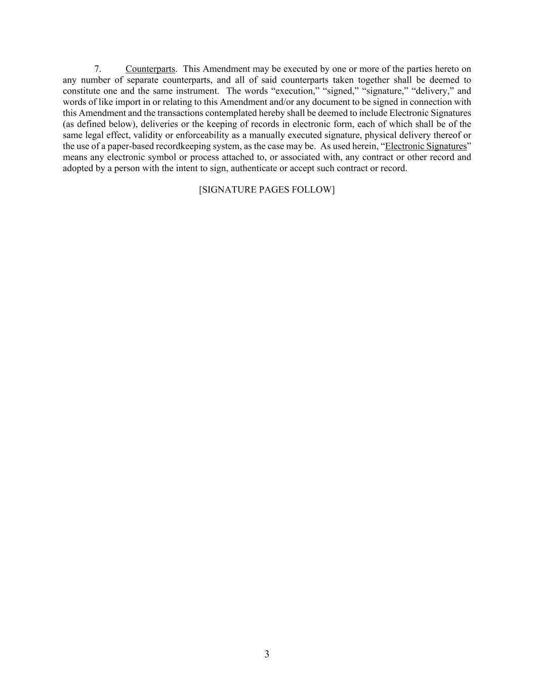 3 7. Counterparts. This Amendment may be executed by one or more of the parties hereto on any number of separate counterparts, and all of said counterparts taken together shall be deemed to constitute one and the same instrument. The words “execution,” “signed,” “signature,” “delivery,” and words of like import in or relating to this Amendment and/or any document to be signed in connection with this Amendment and the transactions contemplated hereby shall be deemed to include Electronic Signatures (as defined below), deliveries or the keeping of records in electronic form, each of which shall be of the same legal effect, validity or enforceability as a manually executed signature, physical delivery thereof or the use of a paper-based recordkeeping system, as the case may be. As used herein, “Electronic Signatures” means any electronic symbol or process attached to, or associated with, any contract or other record and adopted by a person with the intent to sign, authenticate or accept such contract or record. [SIGNATURE PAGES FOLLOW]