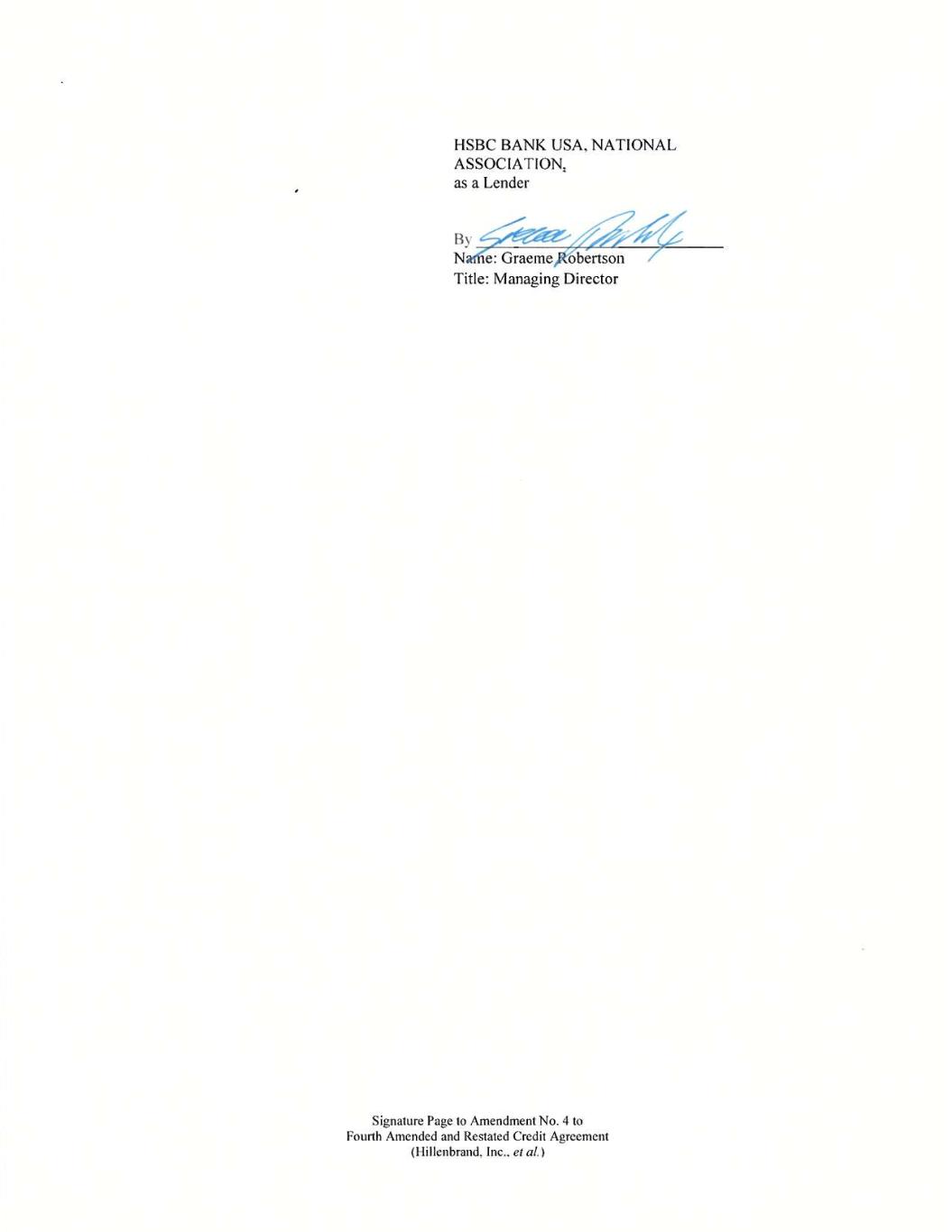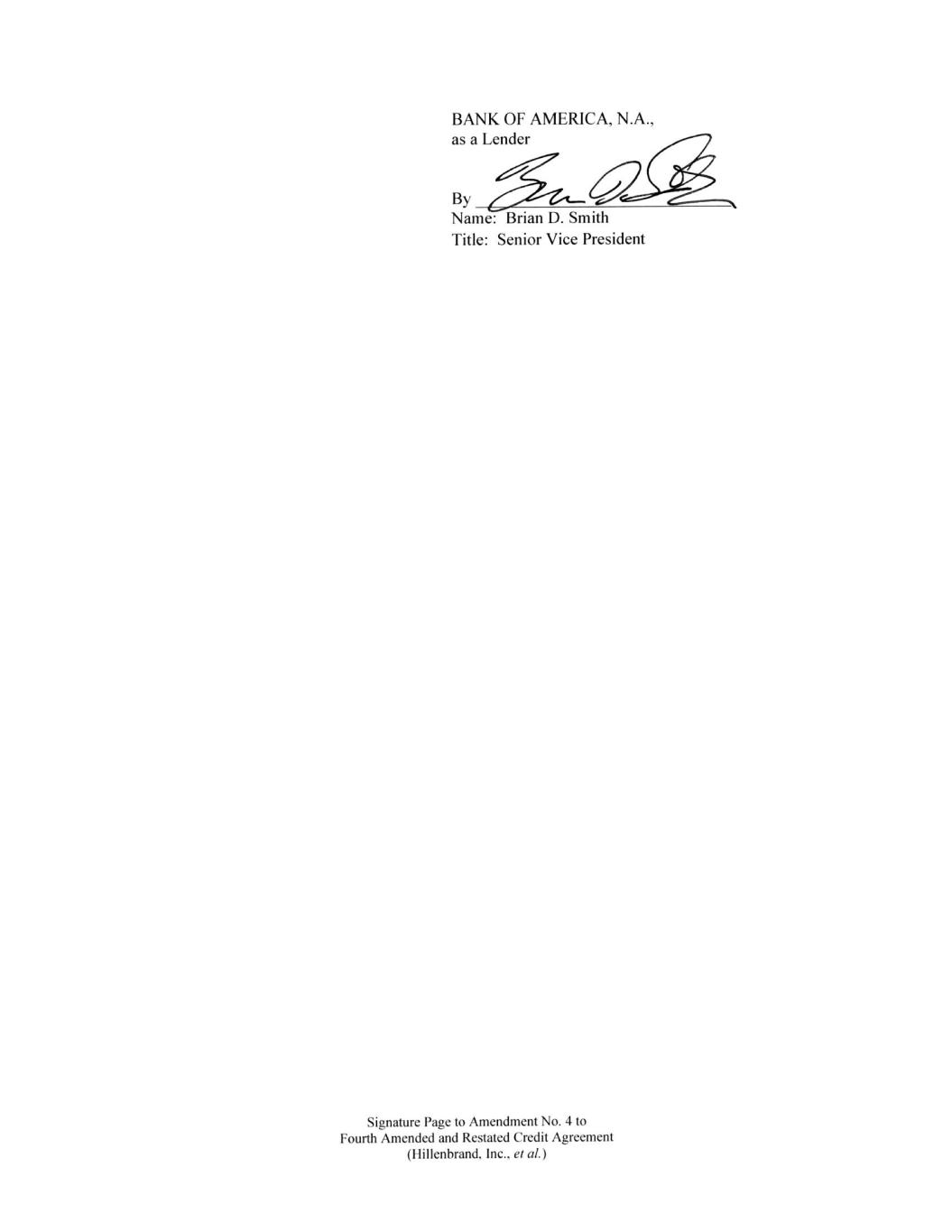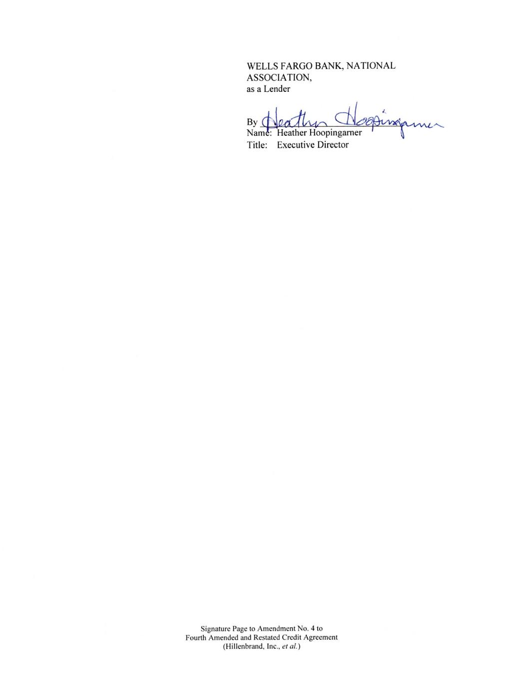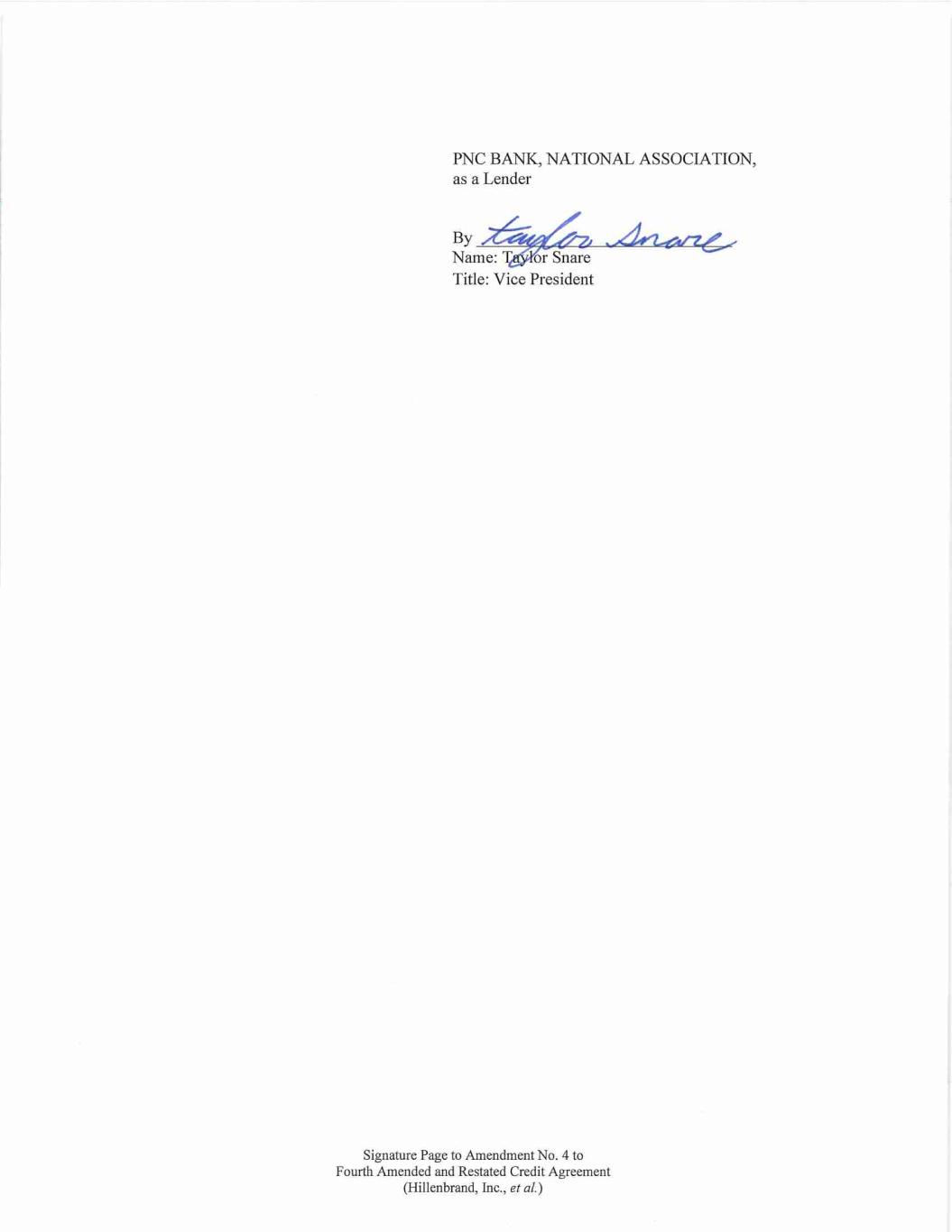 Signature Page to Amendment No. 4 to Fourth Amended and Restated Credit Agreement (Hillenbrand, Inc., et al.) IN WITNESS WHEREOF, this Amendment has been duly executed as of the day and year first above written. HILLENBRAND, INC., as the Company By ______________________________________ Name: Wei Gu Title: Vice President and Treasurer
