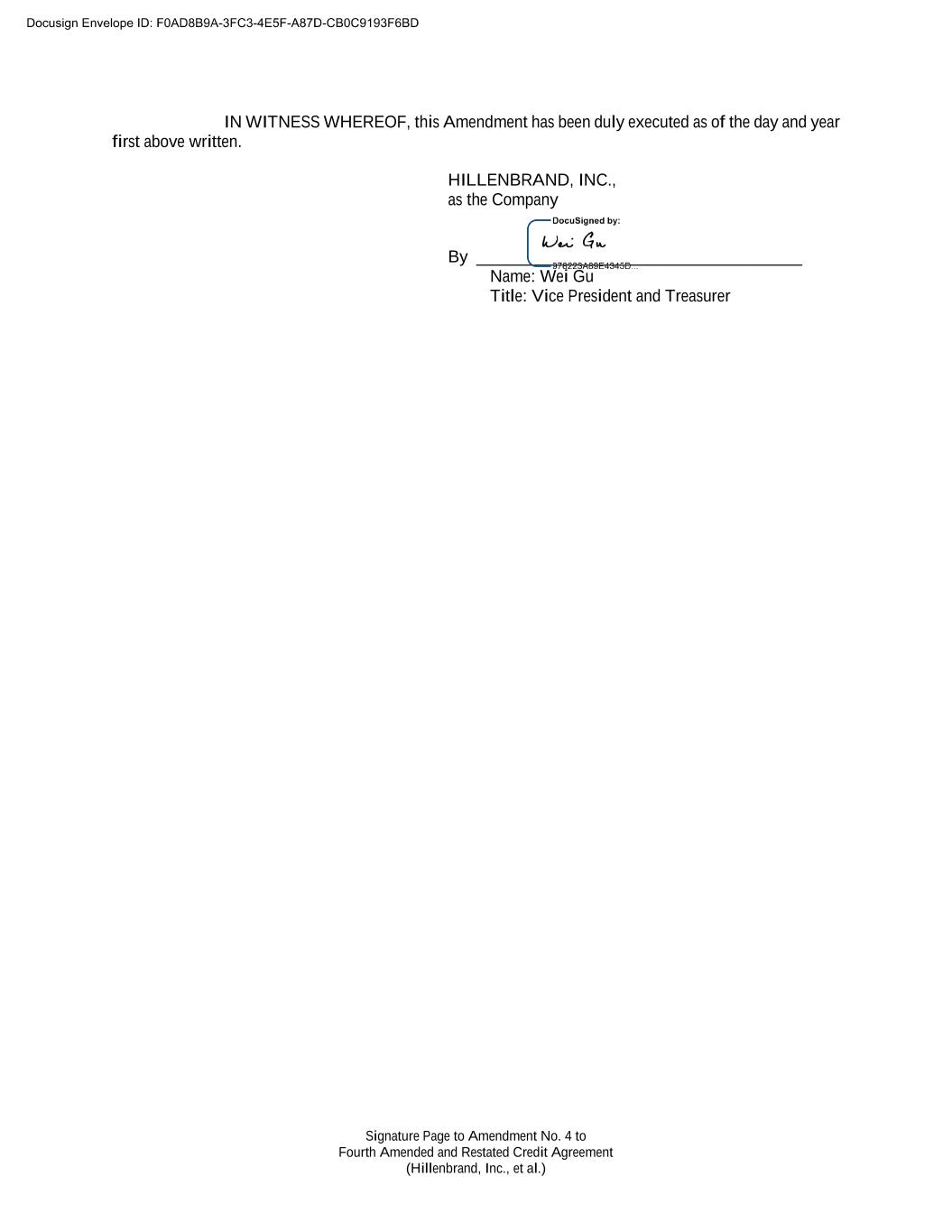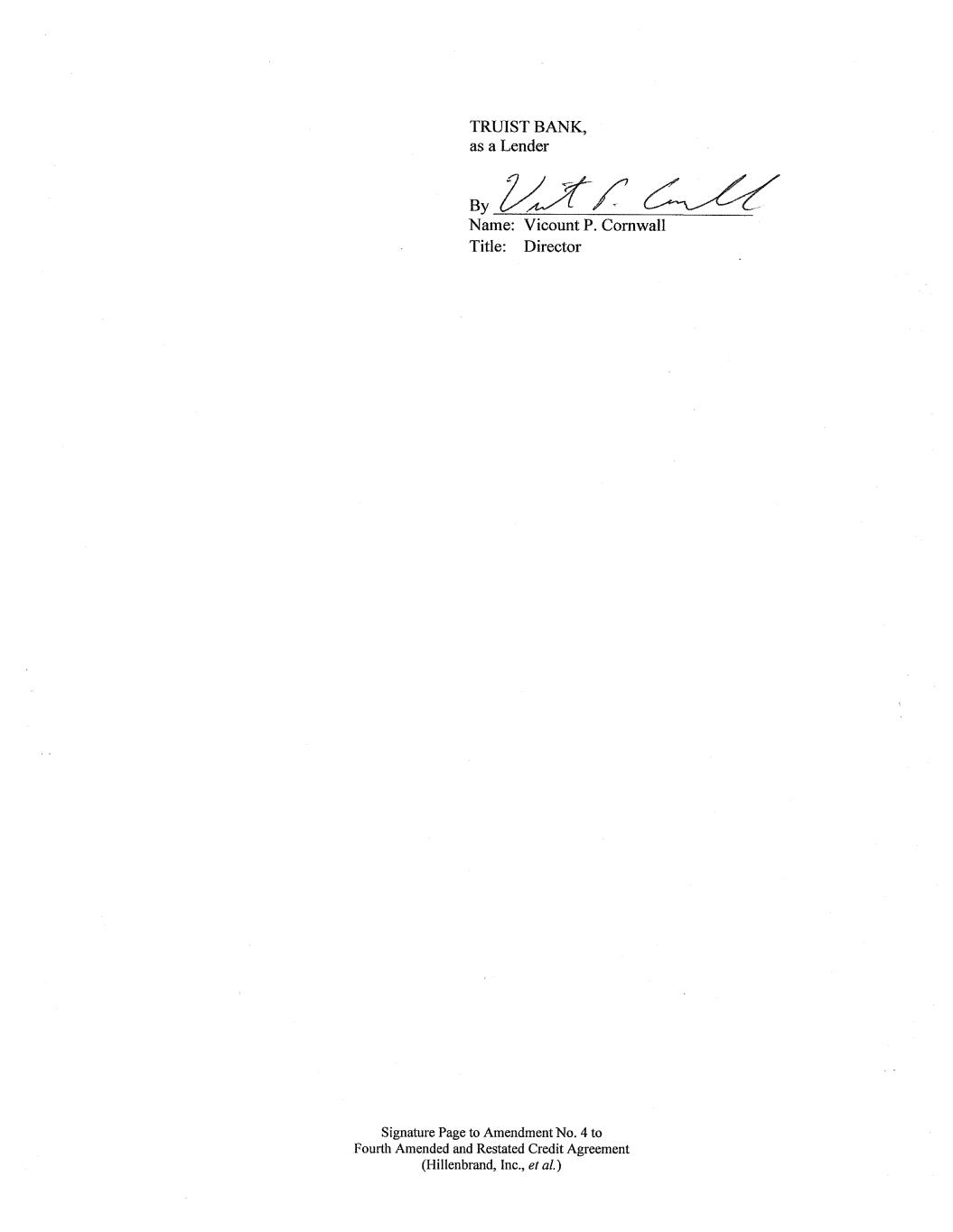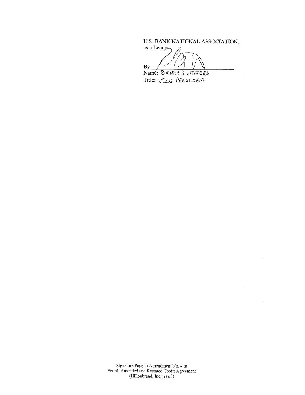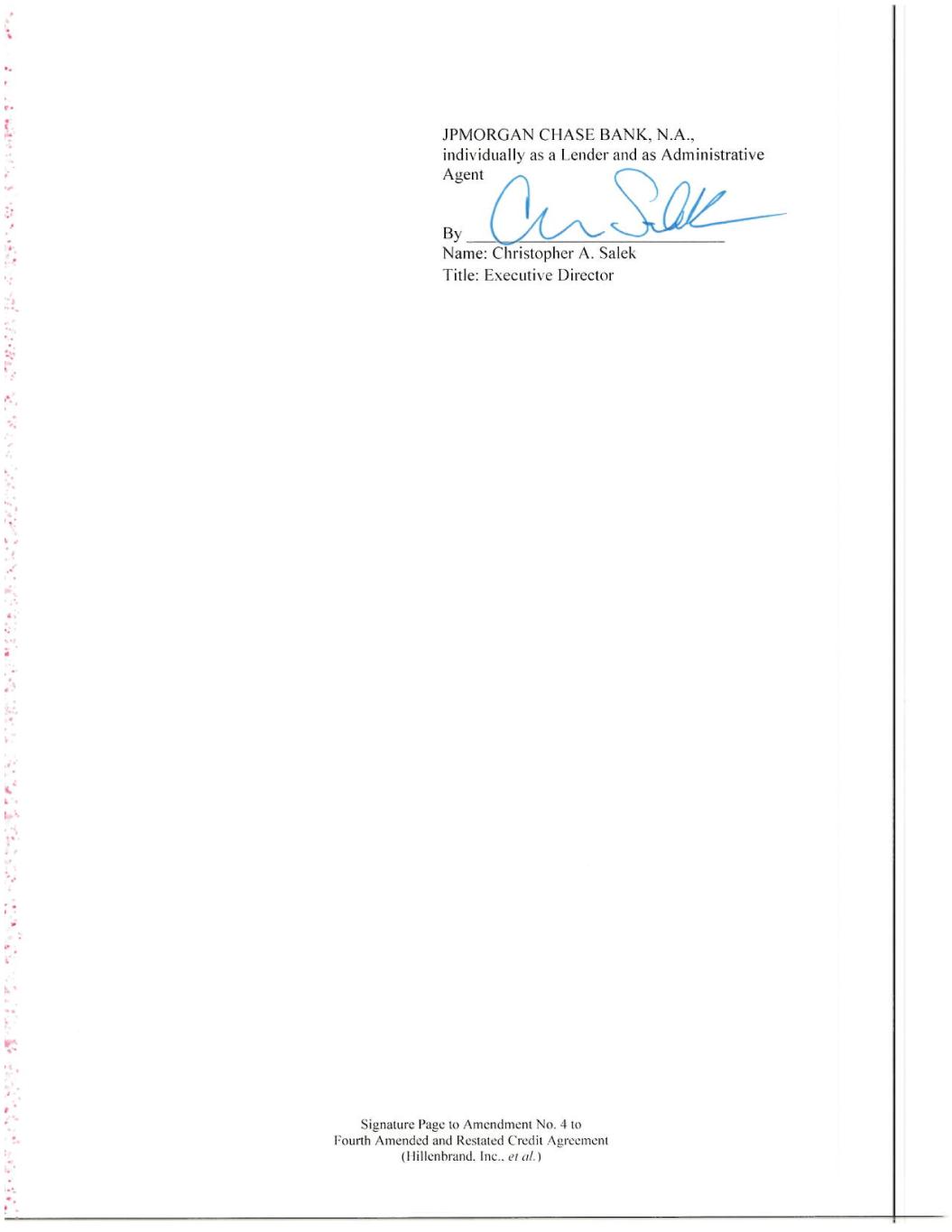 Signature Page to Amendment No. 4 to Fourth Amended and Restated Credit Agreement (Hillenbrand, Inc., et al.) IN WITNESS WHEREOF, this Amendment has been duly executed as of the day and year first above written. HILLENBRAND, INC., as the Company By ______________________________________ Name: Wei Gu Title: Vice President and Treasurer