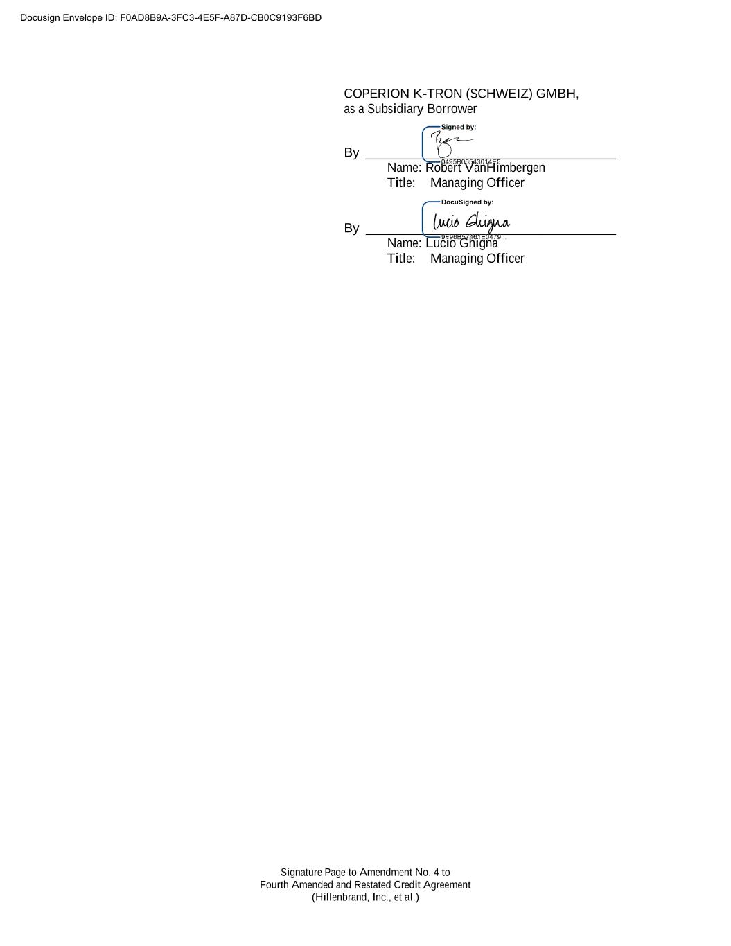 Signature Page to Amendment No. 4 to Fourth Amended and Restated Credit Agreement (Hillenbrand, Inc., et al.) COPERION K-TRON (SCHWEIZ) GMBH, as a Subsidiary Borrower By ______________________________________ Name: Robert VanHimbergen Title: Managing Officer By ______________________________________ Name: Lucio Ghigna Title: Managing Officer