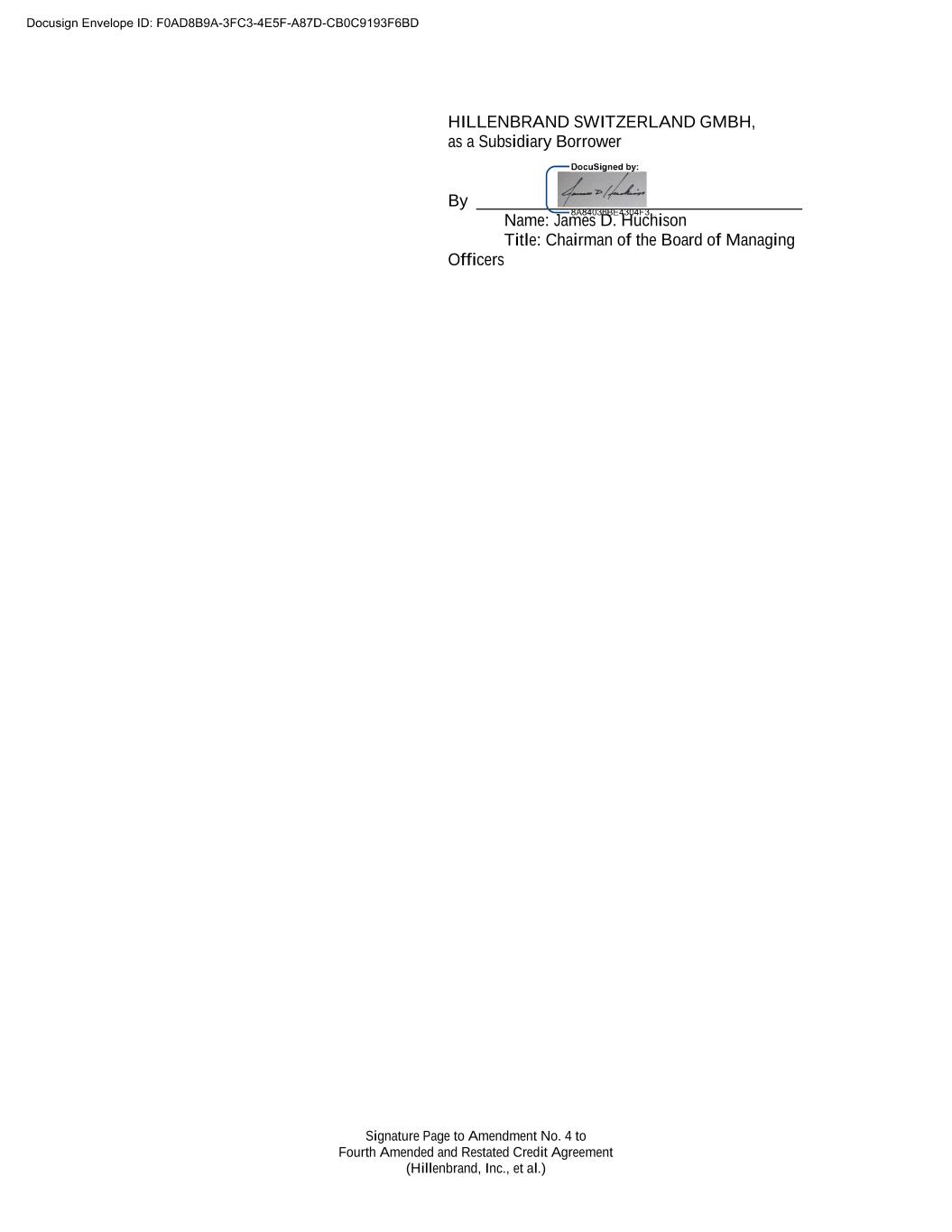Signature Page to Amendment No. 4 to Fourth Amended and Restated Credit Agreement (Hillenbrand, Inc., et al.) HILLENBRAND SWITZERLAND GMBH, as a Subsidiary Borrower By ______________________________________ Name: James D. Huchison Title: Chairman of the Board of Managing Officers