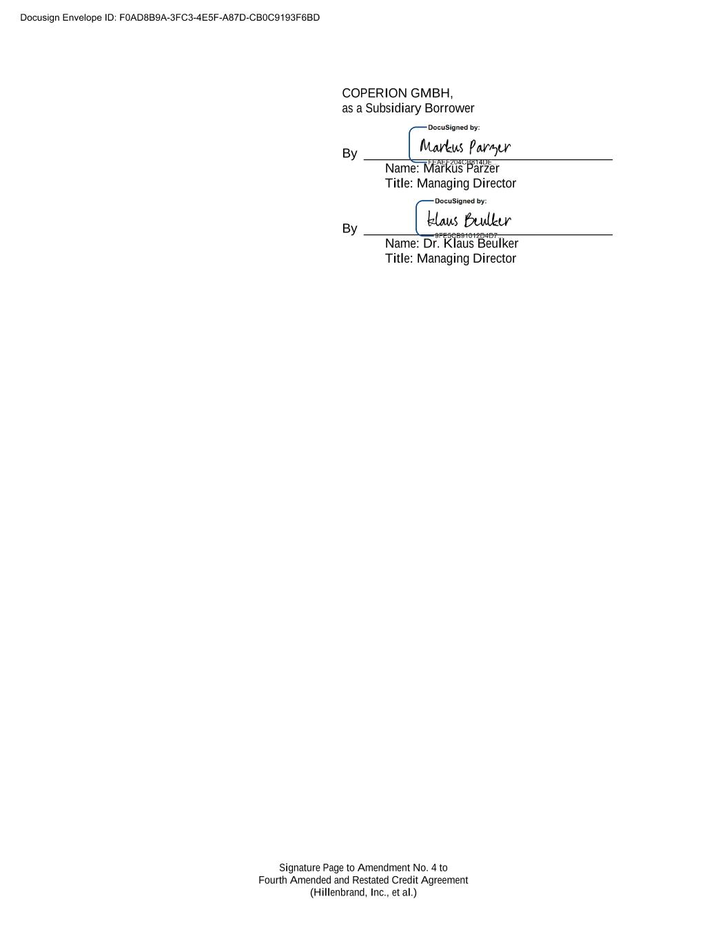 Signature Page to Amendment No. 4 to Fourth Amended and Restated Credit Agreement (Hillenbrand, Inc., et al.) COPERION GMBH, as a Subsidiary Borrower By ______________________________________ Name: Markus Parzer Title: Managing Director By ______________________________________ Name: Dr. Klaus Beulker Title: Managing Director