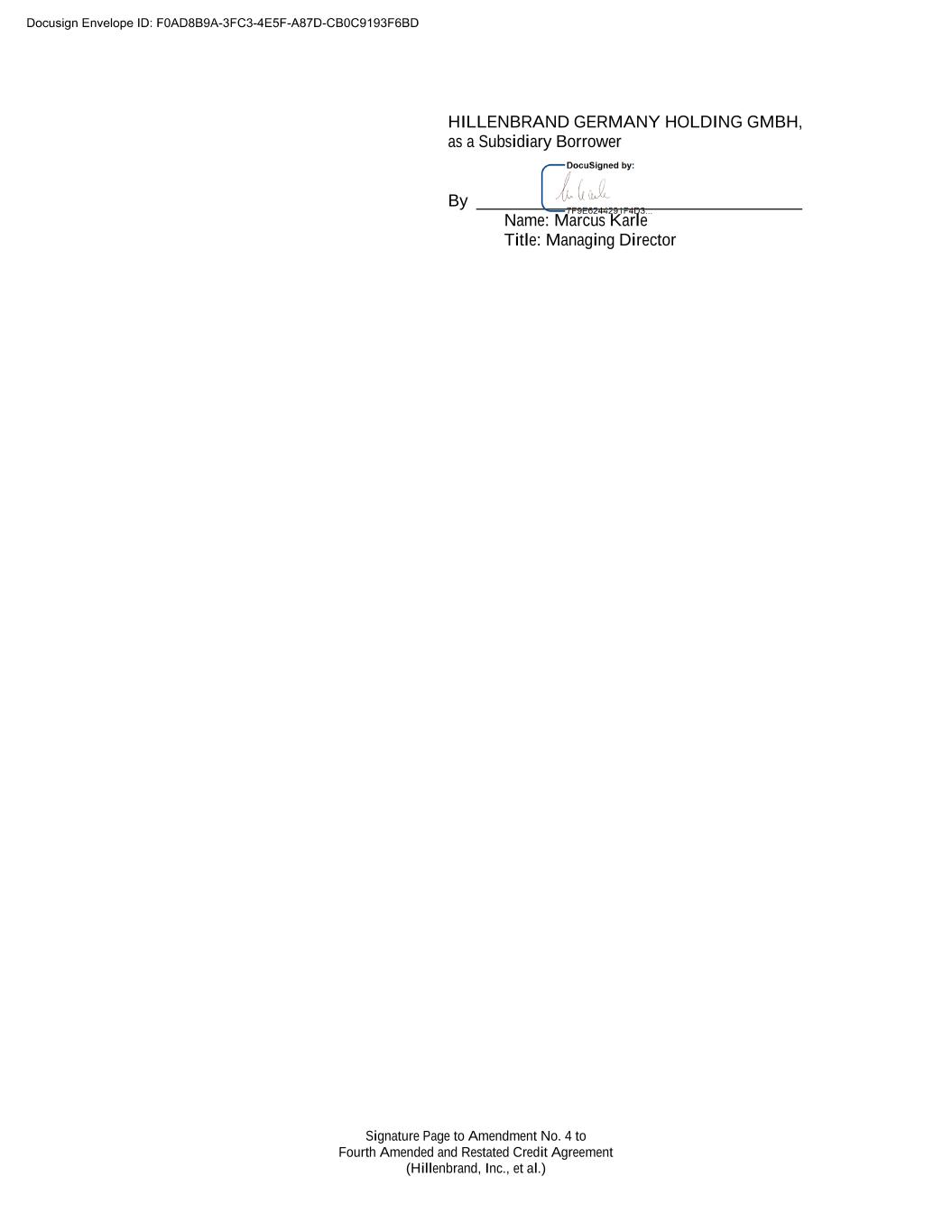 Signature Page to Amendment No. 4 to Fourth Amended and Restated Credit Agreement (Hillenbrand, Inc., et al.) HILLENBRAND GERMANY HOLDING GMBH, as a Subsidiary Borrower By ______________________________________ Name: Marcus Karle Title: Managing Director