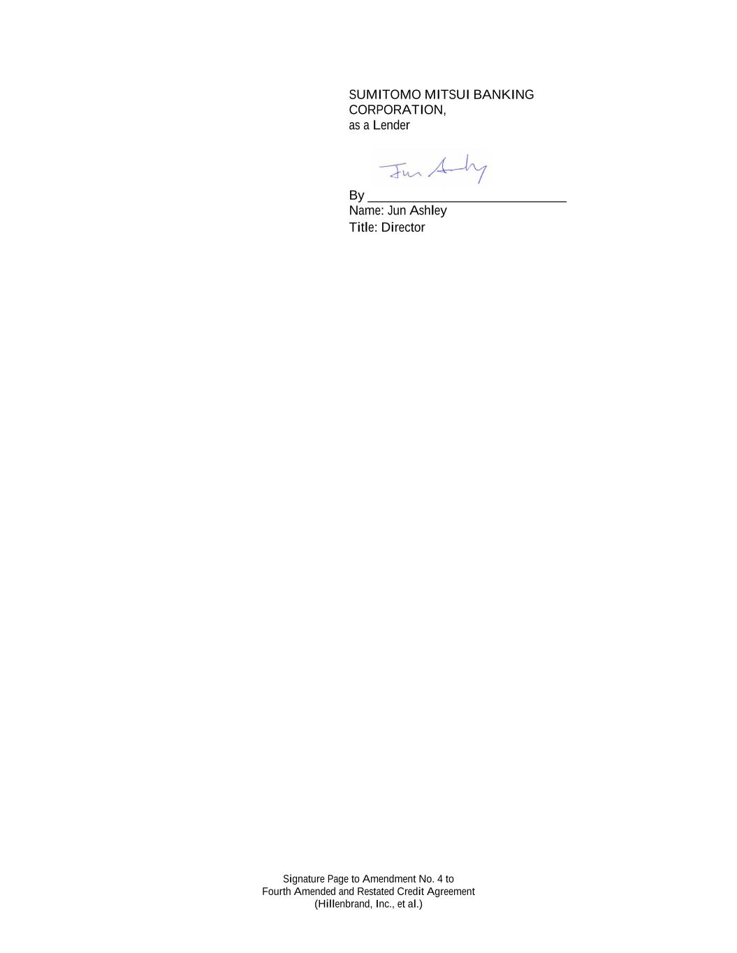 Signature Page to Amendment No. 4 to Fourth Amended and Restated Credit Agreement (Hillenbrand, Inc., et al.) SUMITOMO MITSUI BANKING CORPORATION, as a Lender By ______________________________ Name: Jun Ashley Title: Director