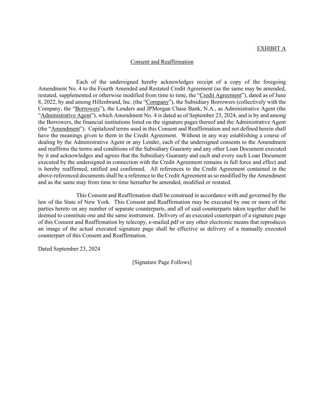 EXHIBIT A Consent and Reaffirmation Each of the undersigned hereby acknowledges receipt of a copy of the foregoing Amendment No. 4 to the Fourth Amended and Restated Credit Agreement (as the same may be amended, restated, supplemented or otherwise modified from time to time, the “Credit Agreement”), dated as of June 8, 2022, by and among Hillenbrand, Inc. (the “Company”), the Subsidiary Borrowers (collectively with the Company, the “Borrowers”), the Lenders and JPMorgan Chase Bank, N.A., as Administrative Agent (the “Administrative Agent”), which Amendment No. 4 is dated as of September 23, 2024, and is by and among the Borrowers, the financial institutions listed on the signature pages thereof and the Administrative Agent (the “Amendment”). Capitalized terms used in this Consent and Reaffirmation and not defined herein shall have the meanings given to them in the Credit Agreement. Without in any way establishing a course of dealing by the Administrative Agent or any Lender, each of the undersigned consents to the Amendment and reaffirms the terms and conditions of the Subsidiary Guaranty and any other Loan Document executed by it and acknowledges and agrees that the Subsidiary Guaranty and each and every such Loan Document executed by the undersigned in connection with the Credit Agreement remains in full force and effect and is hereby reaffirmed, ratified and confirmed. All references to the Credit Agreement contained in the above-referenced documents shall be a reference to the Credit Agreement as so modified by the Amendment and as the same may from time to time hereafter be amended, modified or restated. This Consent and Reaffirmation shall be construed in accordance with and governed by the law of the State of New York. This Consent and Reaffirmation may be executed by one or more of the parties hereto on any number of separate counterparts, and all of said counterparts taken together shall be deemed to constitute one and the same instrument. Delivery of an executed counterpart of a signature page of this Consent and Reaffirmation by telecopy, e-mailed.pdf or any other electronic means that reproduces an image of the actual executed signature page shall be effective as delivery of a manually executed counterpart of this Consent and Reaffirmation. Dated September 23, 2024 [Signature Page Follows]