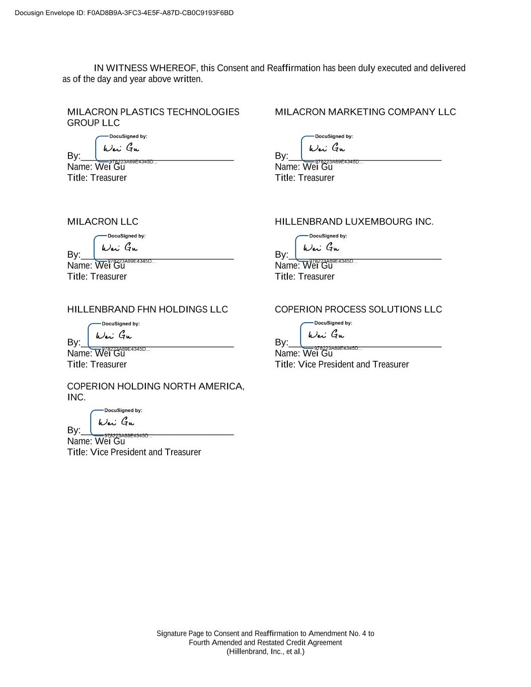 Signature Page to Consent and Reaffirmation to Amendment No. 4 to Fourth Amended and Restated Credit Agreement (Hillenbrand, Inc., et al.) IN WITNESS WHEREOF, this Consent and Reaffirmation has been duly executed and delivered as of the day and year above written. MILACRON PLASTICS TECHNOLOGIES GROUP LLC By:________________________________ Name: Wei Gu Title: Treasurer MILACRON MARKETING COMPANY LLC By:________________________________ Name: Wei Gu Title: Treasurer MILACRON LLC By:________________________________ Name: Wei Gu Title: Treasurer HILLENBRAND LUXEMBOURG INC. By:________________________________ Name: Wei Gu Title: Treasurer HILLENBRAND FHN HOLDINGS LLC By:________________________________ Name: Wei Gu Title: Treasurer COPERION PROCESS SOLUTIONS LLC By:________________________________ Name: Wei Gu Title: Vice President and Treasurer COPERION HOLDING NORTH AMERICA, INC. By:________________________________ Name: Wei Gu Title: Vice President and Treasurer