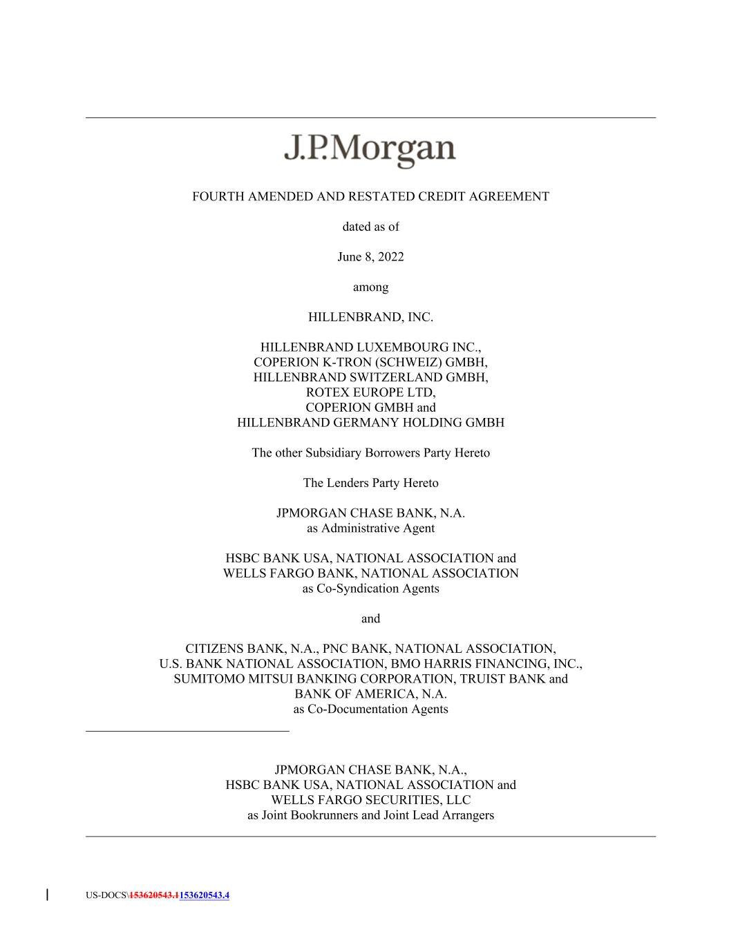 US-DOCS\153620543.1153620543.4 FOURTH AMENDED AND RESTATED CREDIT AGREEMENT dated as of June 8, 2022 among HILLENBRAND, INC. HILLENBRAND LUXEMBOURG INC., COPERION K-TRON (SCHWEIZ) GMBH, HILLENBRAND SWITZERLAND GMBH, ROTEX EUROPE LTD, COPERION GMBH and HILLENBRAND GERMANY HOLDING GMBH The other Subsidiary Borrowers Party Hereto The Lenders Party Hereto JPMORGAN CHASE BANK, N.A. as Administrative Agent HSBC BANK USA, NATIONAL ASSOCIATION and WELLS FARGO BANK, NATIONAL ASSOCIATION as Co-Syndication Agents and CITIZENS BANK, N.A., PNC BANK, NATIONAL ASSOCIATION, U.S. BANK NATIONAL ASSOCIATION, BMO HARRIS FINANCING, INC., SUMITOMO MITSUI BANKING CORPORATION, TRUIST BANK and BANK OF AMERICA, N.A. as Co-Documentation Agents JPMORGAN CHASE BANK, N.A., HSBC BANK USA, NATIONAL ASSOCIATION and WELLS FARGO SECURITIES, LLC as Joint Bookrunners and Joint Lead Arrangers