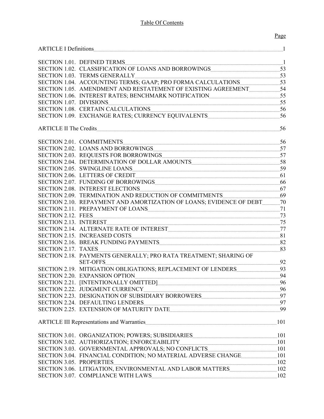 Table Of Contents Page ARTICLE I Definitions 1 SECTION 1.01. DEFINED TERMS 1 SECTION 1.02. CLASSIFICATION OF LOANS AND BORROWINGS 53 SECTION 1.03. TERMS GENERALLY 53 SECTION 1.04. ACCOUNTING TERMS; GAAP; PRO FORMA CALCULATIONS 53 SECTION 1.05. AMENDMENT AND RESTATEMENT OF EXISTING AGREEMENT 54 SECTION 1.06. INTEREST RATES; BENCHMARK NOTIFICATION 55 SECTION 1.07. DIVISIONS 55 SECTION 1.08. CERTAIN CALCULATIONS 56 SECTION 1.09. EXCHANGE RATES; CURRENCY EQUIVALENTS 56 ARTICLE II The Credits 56 SECTION 2.01. COMMITMENTS 56 SECTION 2.02. LOANS AND BORROWINGS 57 SECTION 2.03. REQUESTS FOR BORROWINGS 57 SECTION 2.04. DETERMINATION OF DOLLAR AMOUNTS 58 SECTION 2.05. SWINGLINE LOANS 59 SECTION 2.06. LETTERS OF CREDIT 61 SECTION 2.07. FUNDING OF BORROWINGS 66 SECTION 2.08. INTEREST ELECTIONS 67 SECTION 2.09. TERMINATION AND REDUCTION OF COMMITMENTS 69 SECTION 2.10. REPAYMENT AND AMORTIZATION OF LOANS; EVIDENCE OF DEBT 70 SECTION 2.11. PREPAYMENT OF LOANS 71 SECTION 2.12. FEES 73 SECTION 2.13. INTEREST 75 SECTION 2.14. ALTERNATE RATE OF INTEREST 77 SECTION 2.15. INCREASED COSTS 81 SECTION 2.16. BREAK FUNDING PAYMENTS 82 SECTION 2.17. TAXES 83 SECTION 2.18. PAYMENTS GENERALLY; PRO RATA TREATMENT; SHARING OF SET-OFFS 92 SECTION 2.19. MITIGATION OBLIGATIONS; REPLACEMENT OF LENDERS 93 SECTION 2.20. EXPANSION OPTION 94 SECTION 2.21. [INTENTIONALLY OMITTED] 96 SECTION 2.22. JUDGMENT CURRENCY 96 SECTION 2.23. DESIGNATION OF SUBSIDIARY BORROWERS 97 SECTION 2.24. DEFAULTING LENDERS 97 SECTION 2.25. EXTENSION OF MATURITY DATE 99 ARTICLE III Representations and Warranties 101 SECTION 3.01. ORGANIZATION; POWERS; SUBSIDIARIES 101 SECTION 3.02. AUTHORIZATION; ENFORCEABILITY 101 SECTION 3.03. GOVERNMENTAL APPROVALS; NO CONFLICTS 101 SECTION 3.04. FINANCIAL CONDITION; NO MATERIAL ADVERSE CHANGE 101 SECTION 3.05. PROPERTIES 102 SECTION 3.06. LITIGATION, ENVIRONMENTAL AND LABOR MATTERS 102 SECTION 3.07. COMPLIANCE WITH LAWS 102