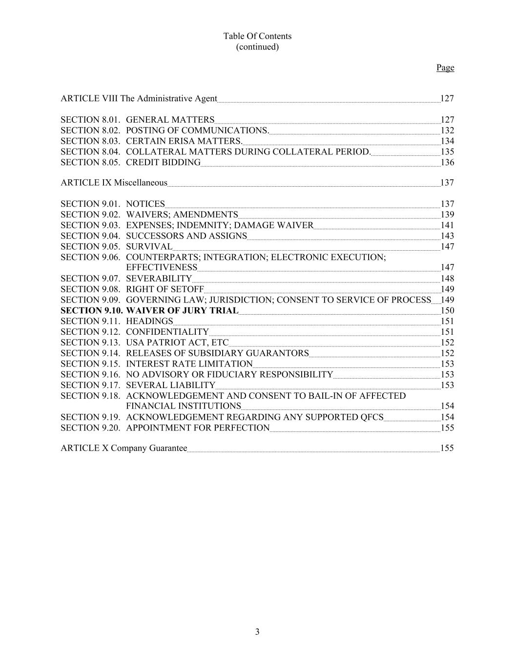 Table Of Contents (continued) Page ARTICLE VIII The Administrative Agent 127 SECTION 8.01. GENERAL MATTERS 127 SECTION 8.02. POSTING OF COMMUNICATIONS. 132 SECTION 8.03. CERTAIN ERISA MATTERS. 134 SECTION 8.04. COLLATERAL MATTERS DURING COLLATERAL PERIOD. 135 SECTION 8.05. CREDIT BIDDING 136 ARTICLE IX Miscellaneous 137 SECTION 9.01. NOTICES 137 SECTION 9.02. WAIVERS; AMENDMENTS 139 SECTION 9.03. EXPENSES; INDEMNITY; DAMAGE WAIVER 141 SECTION 9.04. SUCCESSORS AND ASSIGNS 143 SECTION 9.05. SURVIVAL 147 SECTION 9.06. COUNTERPARTS; INTEGRATION; ELECTRONIC EXECUTION; EFFECTIVENESS 147 SECTION 9.07. SEVERABILITY 148 SECTION 9.08. RIGHT OF SETOFF 149 SECTION 9.09. GOVERNING LAW; JURISDICTION; CONSENT TO SERVICE OF PROCESS 149 SECTION 9.10. WAIVER OF JURY TRIAL 150 SECTION 9.11. HEADINGS 151 SECTION 9.12. CONFIDENTIALITY 151 SECTION 9.13. USA PATRIOT ACT, ETC 152 SECTION 9.14. RELEASES OF SUBSIDIARY GUARANTORS 152 SECTION 9.15. INTEREST RATE LIMITATION 153 SECTION 9.16. NO ADVISORY OR FIDUCIARY RESPONSIBILITY 153 SECTION 9.17. SEVERAL LIABILITY 153 SECTION 9.18. ACKNOWLEDGEMENT AND CONSENT TO BAIL-IN OF AFFECTED FINANCIAL INSTITUTIONS 154 SECTION 9.19. ACKNOWLEDGEMENT REGARDING ANY SUPPORTED QFCS 154 SECTION 9.20. APPOINTMENT FOR PERFECTION 155 ARTICLE X Company Guarantee 155 3