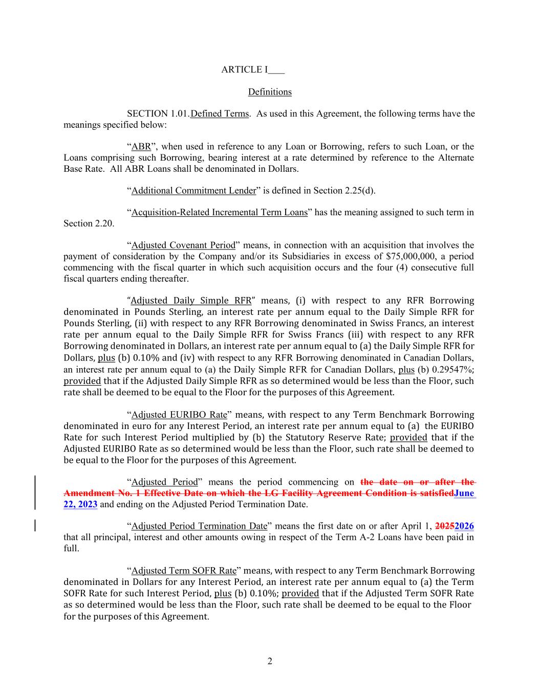 ARTICLE I Definitions SECTION 1.01.Defined Terms. As used in this Agreement, the following terms have the meanings specified below: “ABR”, when used in reference to any Loan or Borrowing, refers to such Loan, or the Loans comprising such Borrowing, bearing interest at a rate determined by reference to the Alternate Base Rate. All ABR Loans shall be denominated in Dollars. “Additional Commitment Lender” is defined in Section 2.25(d). “Acquisition-Related Incremental Term Loans” has the meaning assigned to such term in Section 2.20. “Adjusted Covenant Period” means, in connection with an acquisition that involves the payment of consideration by the Company and/or its Subsidiaries in excess of $75,000,000, a period commencing with the fiscal quarter in which such acquisition occurs and the four (4) consecutive full fiscal quarters ending thereafter.“Adjusted Daily Simple RFR” means, (i) with respect to any RFR Borrowingdenominated in Pounds Sterling, an interest rate per annum equal to the Daily Simple RFR forPounds Sterling, (ii) with respect to any RFR Borrowing denominated in Swiss Francs, an interestrate per annum equal to the Daily Simple RFR for Swiss Francs (iii) with respect to any RFRBorrowing denominated in Dollars, an interest rate per annum equal to (a) the Daily Simple RFR forDollars, plus (b) 0.10% and (iv) with respect to any RFR Borrowing denominated in Canadian Dollars, an interest rate per annum equal to (a) the Daily Simple RFR for Canadian Dollars, plus (b) 0.29547%;provided that if the Adjusted Daily Simple RFR as so determined would be less than the Floor, suchrate shall be deemed to be equal to the Floor for the purposes of this Agreement. “Adjusted EURIBO Rate” means, with respect to any Term Benchmark Borrowingdenominated in euro for any Interest Period, an interest rate per annum equal to (a) the EURIBORate for such Interest Period multiplied by (b) the Statutory Reserve Rate; provided that if theAdjusted EURIBO Rate as so determined would be less than the Floor, such rate shall be deemed tobe equal to the Floor for the purposes of this Agreement. “Adjusted Period” means the period commencing on the date on or after the Amendment No. 1 Effective Date on which the LG Facility Agreement Condition is satisfiedJune 22, 2023 and ending on the Adjusted Period Termination Date. “Adjusted Period Termination Date” means the first date on or after April 1, 20252026 that all principal, interest and other amounts owing in respect of the Term A-2 Loans have been paid in full. “Adjusted Term SOFR Rate” means, with respect to any Term Benchmark Borrowingdenominated in Dollars for any Interest Period, an interest rate per annum equal to (a) the TermSOFR Rate for such Interest Period, plus (b) 0.10%; provided that if the Adjusted Term SOFR Rateas so determined would be less than the Floor, such rate shall be deemed to be equal to the Floorfor the purposes of this Agreement. 2