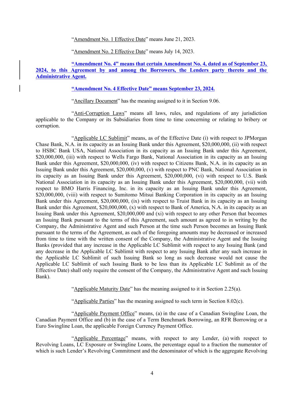 “Amendment No. 1 Effective Date” means June 21, 2023. “Amendment No. 2 Effective Date” means July 14, 2023. “Amendment No. 4” means that certain Amendment No. 4, dated as of September 23, 2024, to this Agreement by and among the Borrowers, the Lenders party thereto and the Administrative Agent. “Amendment No. 4 Effective Date” means September 23, 2024. “Ancillary Document” has the meaning assigned to it in Section 9.06. “Anti-Corruption Laws” means all laws, rules, and regulations of any jurisdiction applicable to the Company or its Subsidiaries from time to time concerning or relating to bribery or corruption. “Applicable LC Sublimit” means, as of the Effective Date (i) with respect to JPMorgan Chase Bank, N.A. in its capacity as an Issuing Bank under this Agreement, $20,000,000, (ii) with respect to HSBC Bank USA, National Association in its capacity as an Issuing Bank under this Agreement, $20,000,000, (iii) with respect to Wells Fargo Bank, National Association in its capacity as an Issuing Bank under this Agreement, $20,000,000, (iv) with respect to Citizens Bank, N.A. in its capacity as an Issuing Bank under this Agreement, $20,000,000, (v) with respect to PNC Bank, National Association in its capacity as an Issuing Bank under this Agreement, $20,000,000, (vi) with respect to U.S. Bank National Association in its capacity as an Issuing Bank under this Agreement, $20,000,000, (vii) with respect to BMO Harris Financing, Inc. in its capacity as an Issuing Bank under this Agreement, $20,000,000, (viii) with respect to Sumitomo Mitsui Banking Corporation in its capacity as an Issuing Bank under this Agreement, $20,000,000, (ix) with respect to Truist Bank in its capacity as an Issuing Bank under this Agreement, $20,000,000, (x) with respect to Bank of America, N.A. in its capacity as an Issuing Bank under this Agreement, $20,000,000 and (xi) with respect to any other Person that becomes an Issuing Bank pursuant to the terms of this Agreement, such amount as agreed to in writing by the Company, the Administrative Agent and such Person at the time such Person becomes an Issuing Bank pursuant to the terms of the Agreement, as each of the foregoing amounts may be decreased or increased from time to time with the written consent of the Company, the Administrative Agent and the Issuing Banks (provided that any increase in the Applicable LC Sublimit with respect to any Issuing Bank (and any decrease in the Applicable LC Sublimit with respect to any Issuing Bank after any such increase in the Applicable LC Sublimit of such Issuing Bank so long as such decrease would not cause the Applicable LC Sublimit of such Issuing Bank to be less than its Applicable LC Sublimit as of the Effective Date) shall only require the consent of the Company, the Administrative Agent and such Issuing Bank). “Applicable Maturity Date” has the meaning assigned to it in Section 2.25(a). “Applicable Parties” has the meaning assigned to such term in Section 8.02(c). “Applicable Payment Office” means, (a) in the case of a Canadian Swingline Loan, the Canadian Payment Office and (b) in the case of a Term Benchmark Borrowing, an RFR Borrowing or a Euro Swingline Loan, the applicable Foreign Currency Payment Office. “Applicable Percentage” means, with respect to any Lender, (a) with respect to Revolving Loans, LC Exposure or Swingline Loans, the percentage equal to a fraction the numerator of which is such Lender’s Revolving Commitment and the denominator of which is the aggregate Revolving 4