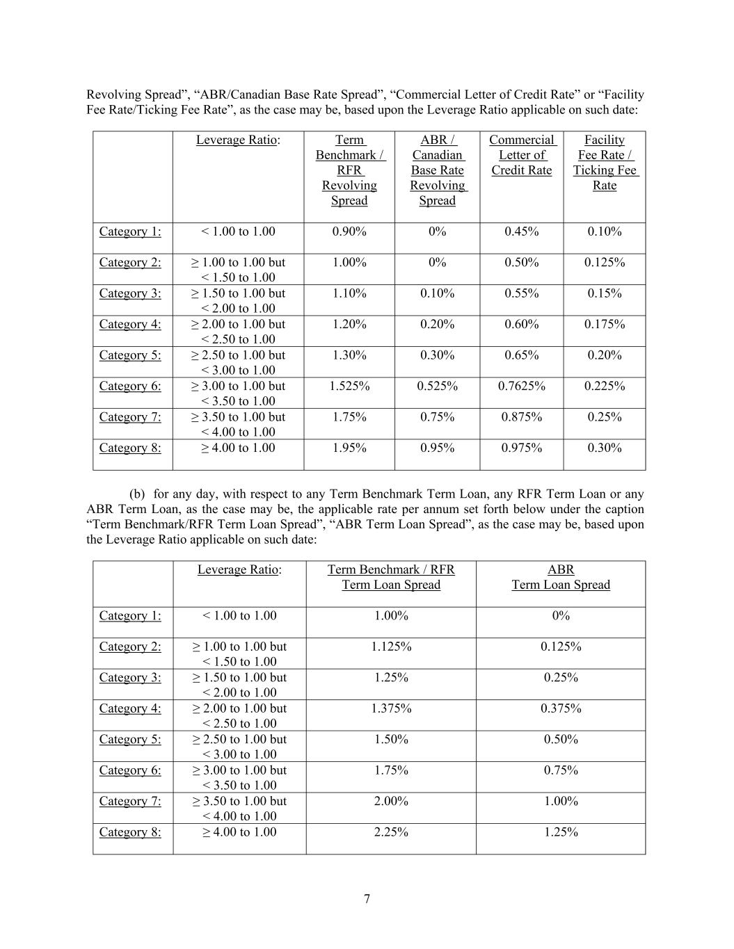7 0.75% 0.10% 0.875% 0% 0.25% 0.55% ABR / Canadian Base Rate Revolving Spread Category 8: 0.15% ≥ 4.00 to 1.00 0.45% 1.95% 0.95% 0.975% Category 4: 0.30% 0.10% (b) for any day, with respect to any Term Benchmark Term Loan, any RFR Term Loan or any ABR Term Loan, as the case may be, the applicable rate per annum set forth below under the caption “Term Benchmark/RFR Term Loan Spread”, “ABR Term Loan Spread”, as the case may be, based upon the Leverage Ratio applicable on such date: ≥ 2.00 to 1.00 but < 2.50 to 1.00 Commercial Letter of Credit Rate Leverage Ratio: 1.20% Term Benchmark / RFR Term Loan Spread ABR Term Loan Spread 0.20% Category 1: 0.60% < 1.00 to 1.00 Category 2: 1.00% 0.175% 0% Facility Fee Rate / Ticking Fee Rate Category 2: ≥ 1.00 to 1.00 but < 1.50 to 1.00 ≥ 1.00 to 1.00 but < 1.50 to 1.00 Category 5: 1.125% 0.125% ≥ 2.50 to 1.00 but < 3.00 to 1.00 1.00% Category 3: 1.30% ≥ 1.50 to 1.00 but < 2.00 to 1.00 1.25% 0.30% 0.25% 0% 0.65% Category 4: Leverage Ratio: ≥ 2.00 to 1.00 but < 2.50 to 1.00 0.20% 1.375% 0.50% 0.375% Category 1: Category 5: Category 6: ≥ 2.50 to 1.00 but < 3.00 to 1.00 0.125% 1.50% ≥ 3.00 to 1.00 but < 3.50 to 1.00 0.50% Revolving Spread”, “ABR/Canadian Base Rate Spread”, “Commercial Letter of Credit Rate” or “Facility Fee Rate/Ticking Fee Rate”, as the case may be, based upon the Leverage Ratio applicable on such date: 1.525% Category 6: ≥ 3.00 to 1.00 but < 3.50 to 1.00 0.525% 1.75% < 1.00 to 1.00 0.75% 0.7625% Category 3: Category 7: 0.225% ≥ 3.50 to 1.00 but < 4.00 to 1.00 Term Benchmark / RFR Revolving Spread 2.00% 1.00% ≥ 1.50 to 1.00 but < 2.00 to 1.00 Category 7: Category 8: 0.90% ≥ 4.00 to 1.00 ≥ 3.50 to 1.00 but < 4.00 to 1.00 2.25% 1.10% 1.25% 1.75%