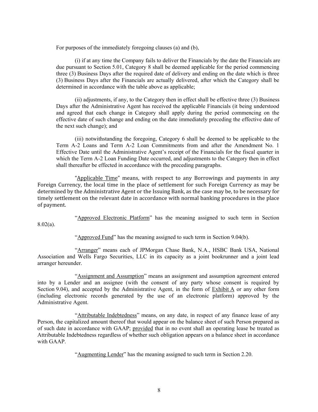 For purposes of the immediately foregoing clauses (a) and (b), (i) if at any time the Company fails to deliver the Financials by the date the Financials are due pursuant to Section 5.01, Category 8 shall be deemed applicable for the period commencing three (3) Business Days after the required date of delivery and ending on the date which is three (3) Business Days after the Financials are actually delivered, after which the Category shall be determined in accordance with the table above as applicable; (ii) adjustments, if any, to the Category then in effect shall be effective three (3) Business Days after the Administrative Agent has received the applicable Financials (it being understood and agreed that each change in Category shall apply during the period commencing on the effective date of such change and ending on the date immediately preceding the effective date of the next such change); and (iii) notwithstanding the foregoing, Category 6 shall be deemed to be applicable to the Term A-2 Loans and Term A-2 Loan Commitments from and after the Amendment No. 1 Effective Date until the Administrative Agent’s receipt of the Financials for the fiscal quarter in which the Term A-2 Loan Funding Date occurred, and adjustments to the Category then in effect shall thereafter be effected in accordance with the preceding paragraphs.“Applicable Time” means, with respect to any Borrowings and payments in anyForeign Currency, the local time in the place of settlement for such Foreign Currency as may bedetermined by the Administrative Agent or the Issuing Bank, as the case may be, to be necessary fortimely settlement on the relevant date in accordance with normal banking procedures in the placeof payment. “Approved Electronic Platform” has the meaning assigned to such term in Section 8.02(a). “Approved Fund” has the meaning assigned to such term in Section 9.04(b). “Arranger” means each of JPMorgan Chase Bank, N.A., HSBC Bank USA, National Association and Wells Fargo Securities, LLC in its capacity as a joint bookrunner and a joint lead arranger hereunder. “Assignment and Assumption” means an assignment and assumption agreement entered into by a Lender and an assignee (with the consent of any party whose consent is required by Section 9.04), and accepted by the Administrative Agent, in the form of Exhibit A or any other form (including electronic records generated by the use of an electronic platform) approved by the Administrative Agent. “Attributable Indebtedness” means, on any date, in respect of any finance lease of any Person, the capitalized amount thereof that would appear on the balance sheet of such Person prepared as of such date in accordance with GAAP; provided that in no event shall an operating lease be treated as Attributable Indebtedness regardless of whether such obligation appears on a balance sheet in accordance with GAAP. “Augmenting Lender” has the meaning assigned to such term in Section 2.20. 8