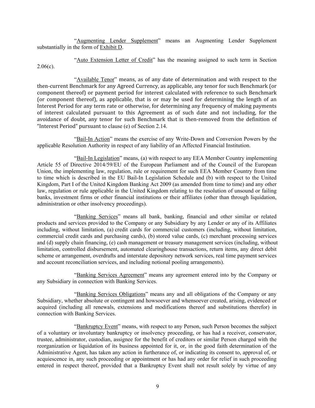 “Augmenting Lender Supplement” means an Augmenting Lender Supplement substantially in the form of Exhibit D. “Auto Extension Letter of Credit” has the meaning assigned to such term in Section 2.06(c). “Available Tenor” means, as of any date of determination and with respect to thethen-current Benchmark for any Agreed Currency, as applicable, any tenor for such Benchmark (orcomponent thereof) or payment period for interest calculated with reference to such Benchmark(or component thereof), as applicable, that is or may be used for determining the length of anInterest Period for any term rate or otherwise, for determining any frequency of making paymentsof interest calculated pursuant to this Agreement as of such date and not including, for theavoidance of doubt, any tenor for such Benchmark that is then-removed from the definition of“Interest Period” pursuant to clause (e) of Section 2.14. “Bail-In Action” means the exercise of any Write-Down and Conversion Powers by the applicable Resolution Authority in respect of any liability of an Affected Financial Institution. “Bail-In Legislation” means, (a) with respect to any EEA Member Country implementing Article 55 of Directive 2014/59/EU of the European Parliament and of the Council of the European Union, the implementing law, regulation, rule or requirement for such EEA Member Country from time to time which is described in the EU Bail-In Legislation Schedule and (b) with respect to the United Kingdom, Part I of the United Kingdom Banking Act 2009 (as amended from time to time) and any other law, regulation or rule applicable in the United Kingdom relating to the resolution of unsound or failing banks, investment firms or other financial institutions or their affiliates (other than through liquidation, administration or other insolvency proceedings). “Banking Services” means all bank, banking, financial and other similar or related products and services provided to the Company or any Subsidiary by any Lender or any of its Affiliates including, without limitation, (a) credit cards for commercial customers (including, without limitation, commercial credit cards and purchasing cards), (b) stored value cards, (c) merchant processing services and (d) supply chain financing, (e) cash management or treasury management services (including, without limitation, controlled disbursement, automated clearinghouse transactions, return items, any direct debit scheme or arrangement, overdrafts and interstate depository network services, real time payment services and account reconciliation services, and including notional pooling arrangements). “Banking Services Agreement” means any agreement entered into by the Company or any Subsidiary in connection with Banking Services. “Banking Services Obligations” means any and all obligations of the Company or any Subsidiary, whether absolute or contingent and howsoever and whensoever created, arising, evidenced or acquired (including all renewals, extensions and modifications thereof and substitutions therefor) in connection with Banking Services. “Bankruptcy Event” means, with respect to any Person, such Person becomes the subject of a voluntary or involuntary bankruptcy or insolvency proceeding, or has had a receiver, conservator, trustee, administrator, custodian, assignee for the benefit of creditors or similar Person charged with the reorganization or liquidation of its business appointed for it, or, in the good faith determination of the Administrative Agent, has taken any action in furtherance of, or indicating its consent to, approval of, or acquiescence in, any such proceeding or appointment or has had any order for relief in such proceeding entered in respect thereof, provided that a Bankruptcy Event shall not result solely by virtue of any 9