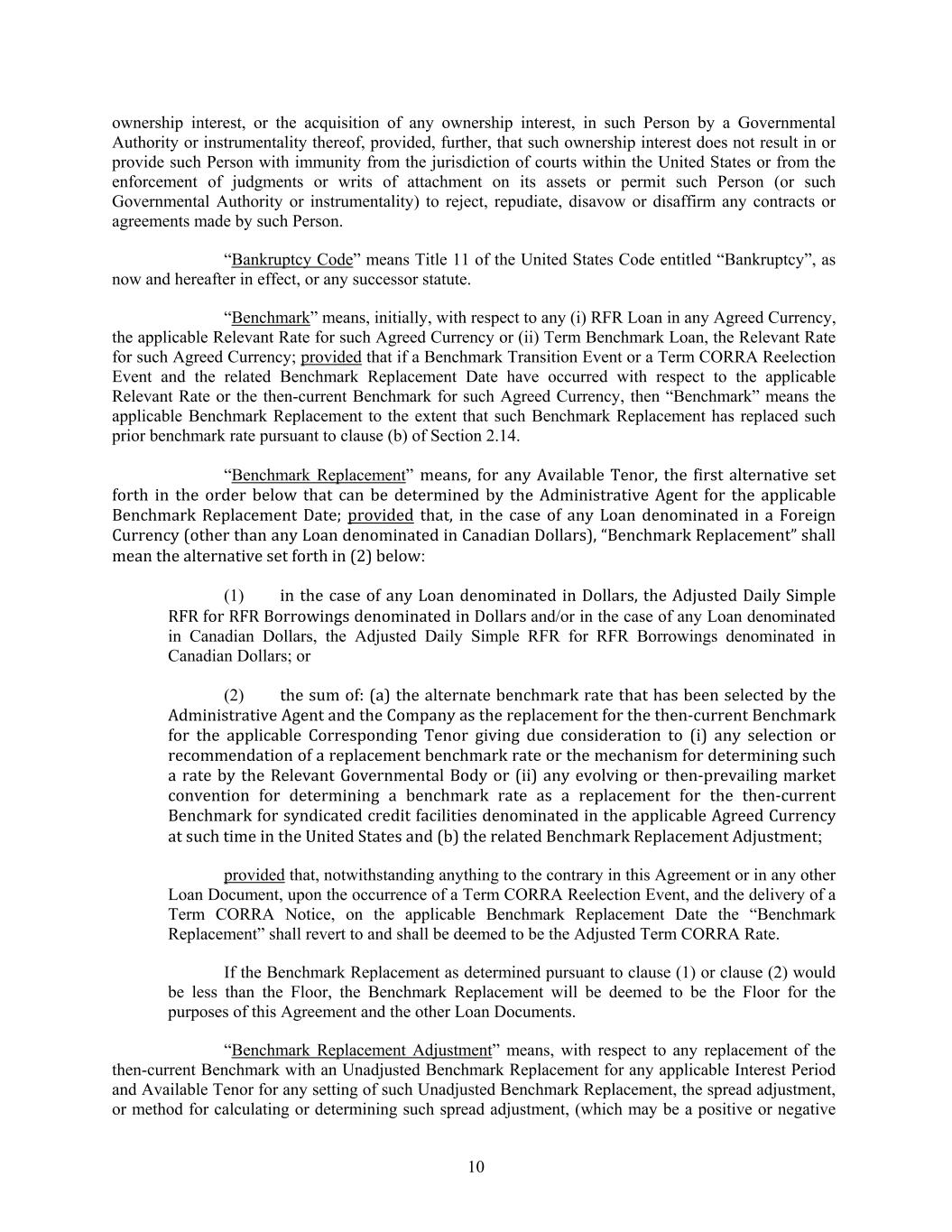 ownership interest, or the acquisition of any ownership interest, in such Person by a Governmental Authority or instrumentality thereof, provided, further, that such ownership interest does not result in or provide such Person with immunity from the jurisdiction of courts within the United States or from the enforcement of judgments or writs of attachment on its assets or permit such Person (or such Governmental Authority or instrumentality) to reject, repudiate, disavow or disaffirm any contracts or agreements made by such Person. “Bankruptcy Code” means Title 11 of the United States Code entitled “Bankruptcy”, as now and hereafter in effect, or any successor statute. “Benchmark” means, initially, with respect to any (i) RFR Loan in any Agreed Currency, the applicable Relevant Rate for such Agreed Currency or (ii) Term Benchmark Loan, the Relevant Rate for such Agreed Currency; provided that if a Benchmark Transition Event or a Term CORRA Reelection Event and the related Benchmark Replacement Date have occurred with respect to the applicable Relevant Rate or the then-current Benchmark for such Agreed Currency, then “Benchmark” means the applicable Benchmark Replacement to the extent that such Benchmark Replacement has replaced such prior benchmark rate pursuant to clause (b) of Section 2.14. “Benchmark Replacement” means, for any Available Tenor, the first alternative setforth in the order below that can be determined by the Administrative Agent for the applicableBenchmark Replacement Date; provided that, in the case of any Loan denominated in a ForeignCurrency (other than any Loan denominated in Canadian Dollars), “Benchmark Replacement” shallmean the alternative set forth in (2) below: (1) in the case of any Loan denominated in Dollars, the Adjusted Daily SimpleRFR for RFR Borrowings denominated in Dollars and/or in the case of any Loan denominated in Canadian Dollars, the Adjusted Daily Simple RFR for RFR Borrowings denominated in Canadian Dollars; or (2) the sum of: (a) the alternate benchmark rate that has been selected by theAdministrative Agent and the Company as the replacement for the then-current Benchmarkfor the applicable Corresponding Tenor giving due consideration to (i) any selection orrecommendation of a replacement benchmark rate or the mechanism for determining sucha rate by the Relevant Governmental Body or (ii) any evolving or then-prevailing marketconvention for determining a benchmark rate as a replacement for the then-currentBenchmark for syndicated credit facilities denominated in the applicable Agreed Currencyat such time in the United States and (b) the related Benchmark Replacement Adjustment; provided that, notwithstanding anything to the contrary in this Agreement or in any other Loan Document, upon the occurrence of a Term CORRA Reelection Event, and the delivery of a Term CORRA Notice, on the applicable Benchmark Replacement Date the “Benchmark Replacement” shall revert to and shall be deemed to be the Adjusted Term CORRA Rate. If the Benchmark Replacement as determined pursuant to clause (1) or clause (2) would be less than the Floor, the Benchmark Replacement will be deemed to be the Floor for the purposes of this Agreement and the other Loan Documents. “Benchmark Replacement Adjustment” means, with respect to any replacement of the then-current Benchmark with an Unadjusted Benchmark Replacement for any applicable Interest Period and Available Tenor for any setting of such Unadjusted Benchmark Replacement, the spread adjustment, or method for calculating or determining such spread adjustment, (which may be a positive or negative 10