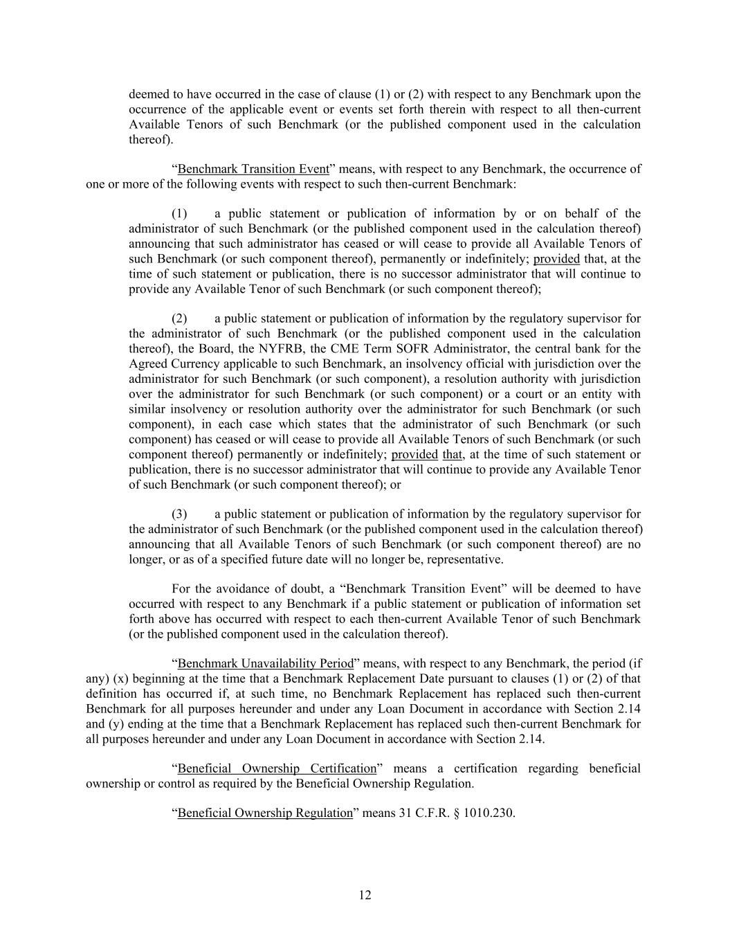 deemed to have occurred in the case of clause (1) or (2) with respect to any Benchmark upon the occurrence of the applicable event or events set forth therein with respect to all then-current Available Tenors of such Benchmark (or the published component used in the calculation thereof). “Benchmark Transition Event” means, with respect to any Benchmark, the occurrence of one or more of the following events with respect to such then-current Benchmark: (1) a public statement or publication of information by or on behalf of the administrator of such Benchmark (or the published component used in the calculation thereof) announcing that such administrator has ceased or will cease to provide all Available Tenors of such Benchmark (or such component thereof), permanently or indefinitely; provided that, at the time of such statement or publication, there is no successor administrator that will continue to provide any Available Tenor of such Benchmark (or such component thereof); (2) a public statement or publication of information by the regulatory supervisor for the administrator of such Benchmark (or the published component used in the calculation thereof), the Board, the NYFRB, the CME Term SOFR Administrator, the central bank for the Agreed Currency applicable to such Benchmark, an insolvency official with jurisdiction over the administrator for such Benchmark (or such component), a resolution authority with jurisdiction over the administrator for such Benchmark (or such component) or a court or an entity with similar insolvency or resolution authority over the administrator for such Benchmark (or such component), in each case which states that the administrator of such Benchmark (or such component) has ceased or will cease to provide all Available Tenors of such Benchmark (or such component thereof) permanently or indefinitely; provided that, at the time of such statement or publication, there is no successor administrator that will continue to provide any Available Tenor of such Benchmark (or such component thereof); or (3) a public statement or publication of information by the regulatory supervisor for the administrator of such Benchmark (or the published component used in the calculation thereof) announcing that all Available Tenors of such Benchmark (or such component thereof) are no longer, or as of a specified future date will no longer be, representative. For the avoidance of doubt, a “Benchmark Transition Event” will be deemed to have occurred with respect to any Benchmark if a public statement or publication of information set forth above has occurred with respect to each then-current Available Tenor of such Benchmark (or the published component used in the calculation thereof). “Benchmark Unavailability Period” means, with respect to any Benchmark, the period (if any) (x) beginning at the time that a Benchmark Replacement Date pursuant to clauses (1) or (2) of that definition has occurred if, at such time, no Benchmark Replacement has replaced such then-current Benchmark for all purposes hereunder and under any Loan Document in accordance with Section 2.14 and (y) ending at the time that a Benchmark Replacement has replaced such then-current Benchmark for all purposes hereunder and under any Loan Document in accordance with Section 2.14. “Beneficial Ownership Certification” means a certification regarding beneficial ownership or control as required by the Beneficial Ownership Regulation. “Beneficial Ownership Regulation” means 31 C.F.R. § 1010.230. 12
