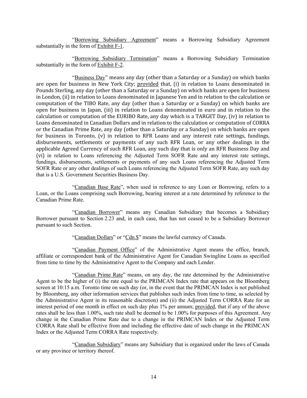 “Borrowing Subsidiary Agreement” means a Borrowing Subsidiary Agreement substantially in the form of Exhibit F-1. “Borrowing Subsidiary Termination” means a Borrowing Subsidiary Termination substantially in the form of Exhibit F-2. “Business Day” means any day (other than a Saturday or a Sunday) on which banksare open for business in New York City; provided that, (i) in relation to Loans denominated inPounds Sterling, any day (other than a Saturday or a Sunday) on which banks are open for businessin London, (ii) in relation to Loans denominated in Japanese Yen and in relation to the calculation orcomputation of the TIBO Rate, any day (other than a Saturday or a Sunday) on which banks areopen for business in Japan, (iii) in relation to Loans denominated in euro and in relation to thecalculation or computation of the EURIBO Rate, any day which is a TARGET Day, (iv) in relation toLoans denominated in Canadian Dollars and in relation to the calculation or computation of CORRAor the Canadian Prime Rate, any day (other than a Saturday or a Sunday) on which banks are openfor business in Toronto, (v) in relation to RFR Loans and any interest rate settings, fundings,disbursements, settlements or payments of any such RFR Loan, or any other dealings in theapplicable Agreed Currency of such RFR Loan, any such day that is only an RFR Business Day and(vi) in relation to Loans referencing the Adjusted Term SOFR Rate and any interest rate settings, fundings, disbursements, settlements or payments of any such Loans referencing the Adjusted Term SOFR Rate or any other dealings of such Loans referencing the Adjusted Term SOFR Rate, any such day that is a U.S. Government Securities Business Day. “Canadian Base Rate”, when used in reference to any Loan or Borrowing, refers to a Loan, or the Loans comprising such Borrowing, bearing interest at a rate determined by reference to the Canadian Prime Rate. “Canadian Borrower” means any Canadian Subsidiary that becomes a Subsidiary Borrower pursuant to Section 2.23 and, in each case, that has not ceased to be a Subsidiary Borrower pursuant to such Section. “Canadian Dollars” or “Cdn.$” means the lawful currency of Canada. “Canadian Payment Office” of the Administrative Agent means the office, branch, affiliate or correspondent bank of the Administrative Agent for Canadian Swingline Loans as specified from time to time by the Administrative Agent to the Company and each Lender. “Canadian Prime Rate” means, on any day, the rate determined by the Administrative Agent to be the higher of (i) the rate equal to the PRIMCAN Index rate that appears on the Bloomberg screen at 10:15 a.m. Toronto time on such day (or, in the event that the PRIMCAN Index is not published by Bloomberg, any other information services that publishes such index from time to time, as selected by the Administrative Agent in its reasonable discretion) and (ii) the Adjusted Term CORRA Rate for an interest period of one month in effect on such day plus 1% per annum; provided, that if any of the above rates shall be less than 1.00%, such rate shall be deemed to be 1.00% for purposes of this Agreement. Any change in the Canadian Prime Rate due to a change in the PRIMCAN Index or the Adjusted Term CORRA Rate shall be effective from and including the effective date of such change in the PRIMCAN Index or the Adjusted Term CORRA Rate respectively. “Canadian Subsidiary” means any Subsidiary that is organized under the laws of Canada or any province or territory thereof. 14