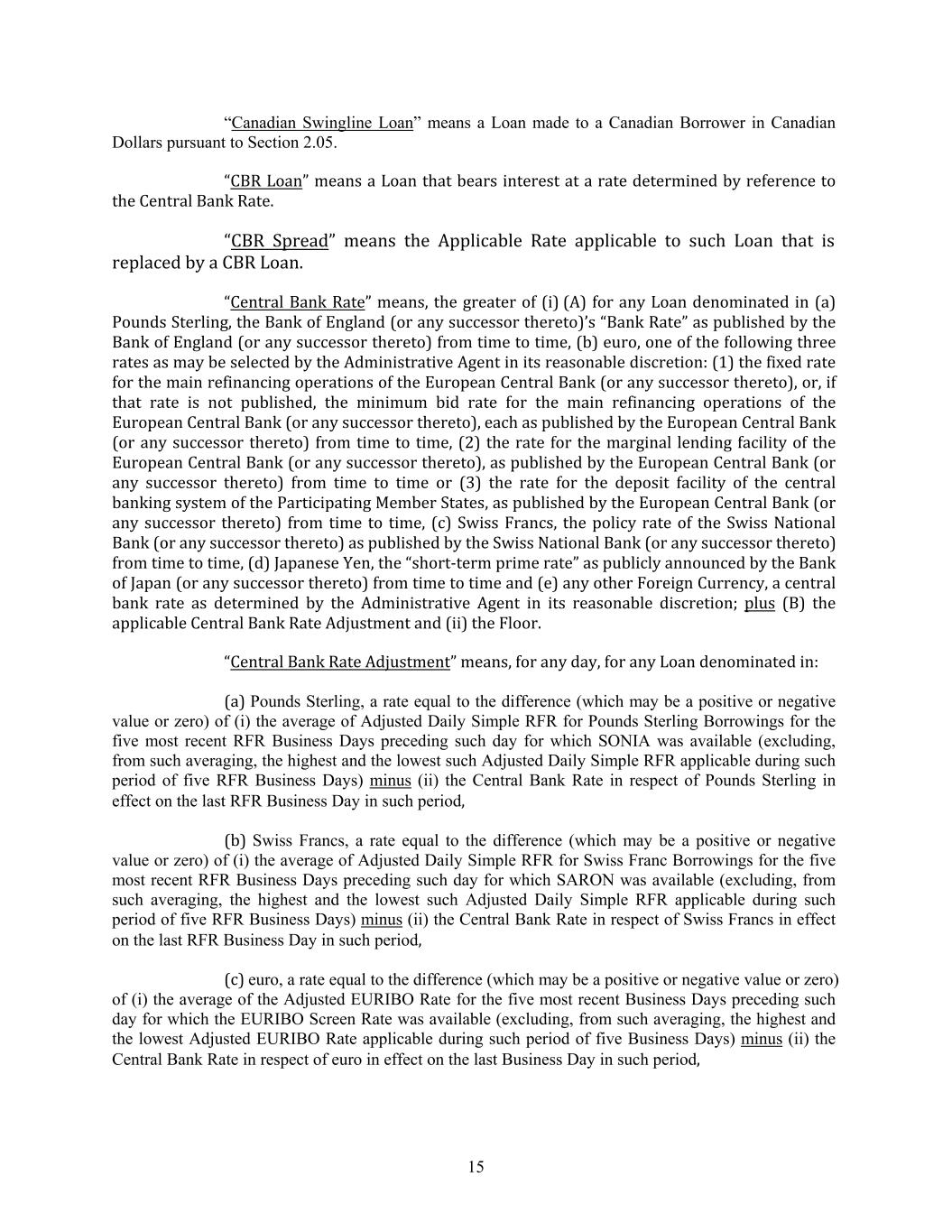 “Canadian Swingline Loan” means a Loan made to a Canadian Borrower in Canadian Dollars pursuant to Section 2.05.“CBR Loan” means a Loan that bears interest at a rate determined by reference tothe Central Bank Rate.“CBR Spread” means the Applicable Rate applicable to such Loan that isreplaced by a CBR Loan.“Central Bank Rate” means, the greater of (i) (A) for any Loan denominated in (a)Pounds Sterling, the Bank of England (or any successor thereto)’s “Bank Rate” as published by theBank of England (or any successor thereto) from time to time, (b) euro, one of the following threerates as may be selected by the Administrative Agent in its reasonable discretion: (1) the fixed ratefor the main refinancing operations of the European Central Bank (or any successor thereto), or, ifthat rate is not published, the minimum bid rate for the main refinancing operations of theEuropean Central Bank (or any successor thereto), each as published by the European Central Bank(or any successor thereto) from time to time, (2) the rate for the marginal lending facility of theEuropean Central Bank (or any successor thereto), as published by the European Central Bank (orany successor thereto) from time to time or (3) the rate for the deposit facility of the centralbanking system of the Participating Member States, as published by the European Central Bank (orany successor thereto) from time to time, (c) Swiss Francs, the policy rate of the Swiss NationalBank (or any successor thereto) as published by the Swiss National Bank (or any successor thereto)from time to time, (d) Japanese Yen, the “short-term prime rate” as publicly announced by the Bankof Japan (or any successor thereto) from time to time and (e) any other Foreign Currency, a centralbank rate as determined by the Administrative Agent in its reasonable discretion; plus (B) theapplicable Central Bank Rate Adjustment and (ii) the Floor.“Central Bank Rate Adjustment” means, for any day, for any Loan denominated in:(a) Pounds Sterling, a rate equal to the difference (which may be a positive or negative value or zero) of (i) the average of Adjusted Daily Simple RFR for Pounds Sterling Borrowings for the five most recent RFR Business Days preceding such day for which SONIA was available (excluding, from such averaging, the highest and the lowest such Adjusted Daily Simple RFR applicable during such period of five RFR Business Days) minus (ii) the Central Bank Rate in respect of Pounds Sterling in effect on the last RFR Business Day in such period,(b) Swiss Francs, a rate equal to the difference (which may be a positive or negative value or zero) of (i) the average of Adjusted Daily Simple RFR for Swiss Franc Borrowings for the five most recent RFR Business Days preceding such day for which SARON was available (excluding, from such averaging, the highest and the lowest such Adjusted Daily Simple RFR applicable during such period of five RFR Business Days) minus (ii) the Central Bank Rate in respect of Swiss Francs in effect on the last RFR Business Day in such period,(c) euro, a rate equal to the difference (which may be a positive or negative value or zero) of (i) the average of the Adjusted EURIBO Rate for the five most recent Business Days preceding such day for which the EURIBO Screen Rate was available (excluding, from such averaging, the highest and the lowest Adjusted EURIBO Rate applicable during such period of five Business Days) minus (ii) the Central Bank Rate in respect of euro in effect on the last Business Day in such period, 15