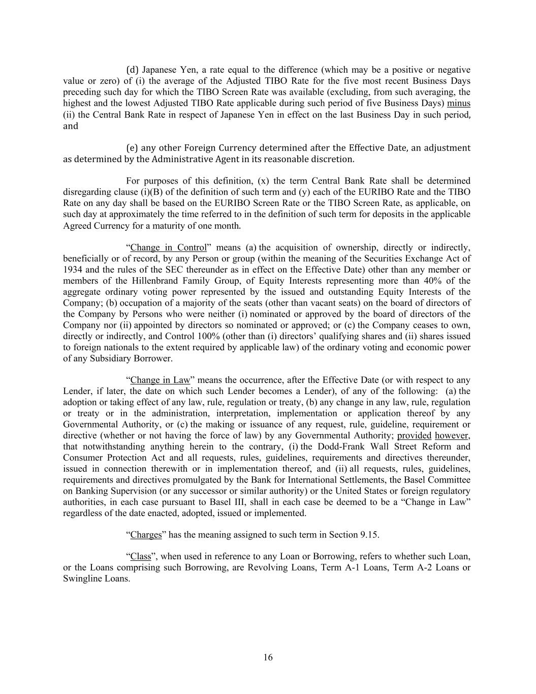 (d) Japanese Yen, a rate equal to the difference (which may be a positive or negative value or zero) of (i) the average of the Adjusted TIBO Rate for the five most recent Business Days preceding such day for which the TIBO Screen Rate was available (excluding, from such averaging, the highest and the lowest Adjusted TIBO Rate applicable during such period of five Business Days) minus (ii) the Central Bank Rate in respect of Japanese Yen in effect on the last Business Day in such period,and (e) any other Foreign Currency determined after the Effective Date, an adjustmentas determined by the Administrative Agent in its reasonable discretion. For purposes of this definition, (x) the term Central Bank Rate shall be determined disregarding clause (i)(B) of the definition of such term and (y) each of the EURIBO Rate and the TIBO Rate on any day shall be based on the EURIBO Screen Rate or the TIBO Screen Rate, as applicable, on such day at approximately the time referred to in the definition of such term for deposits in the applicable Agreed Currency for a maturity of one month. “Change in Control” means (a) the acquisition of ownership, directly or indirectly, beneficially or of record, by any Person or group (within the meaning of the Securities Exchange Act of 1934 and the rules of the SEC thereunder as in effect on the Effective Date) other than any member or members of the Hillenbrand Family Group, of Equity Interests representing more than 40% of the aggregate ordinary voting power represented by the issued and outstanding Equity Interests of the Company; (b) occupation of a majority of the seats (other than vacant seats) on the board of directors of the Company by Persons who were neither (i) nominated or approved by the board of directors of the Company nor (ii) appointed by directors so nominated or approved; or (c) the Company ceases to own, directly or indirectly, and Control 100% (other than (i) directors’ qualifying shares and (ii) shares issued to foreign nationals to the extent required by applicable law) of the ordinary voting and economic power of any Subsidiary Borrower. “Change in Law” means the occurrence, after the Effective Date (or with respect to any Lender, if later, the date on which such Lender becomes a Lender), of any of the following: (a) the adoption or taking effect of any law, rule, regulation or treaty, (b) any change in any law, rule, regulation or treaty or in the administration, interpretation, implementation or application thereof by any Governmental Authority, or (c) the making or issuance of any request, rule, guideline, requirement or directive (whether or not having the force of law) by any Governmental Authority; provided however, that notwithstanding anything herein to the contrary, (i) the Dodd-Frank Wall Street Reform and Consumer Protection Act and all requests, rules, guidelines, requirements and directives thereunder, issued in connection therewith or in implementation thereof, and (ii) all requests, rules, guidelines, requirements and directives promulgated by the Bank for International Settlements, the Basel Committee on Banking Supervision (or any successor or similar authority) or the United States or foreign regulatory authorities, in each case pursuant to Basel III, shall in each case be deemed to be a “Change in Law” regardless of the date enacted, adopted, issued or implemented. “Charges” has the meaning assigned to such term in Section 9.15. “Class”, when used in reference to any Loan or Borrowing, refers to whether such Loan, or the Loans comprising such Borrowing, are Revolving Loans, Term A-1 Loans, Term A-2 Loans or Swingline Loans. 16