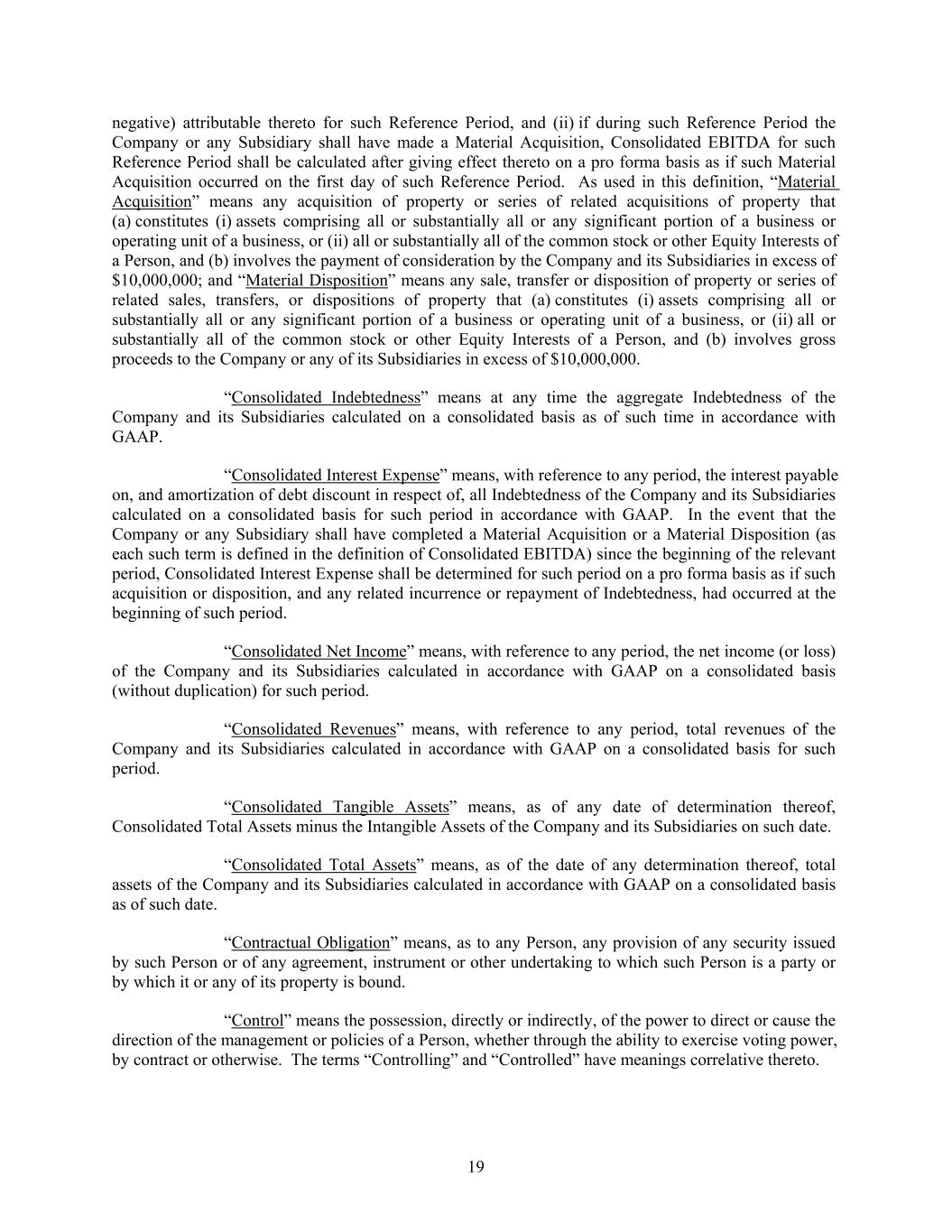 negative) attributable thereto for such Reference Period, and (ii) if during such Reference Period the Company or any Subsidiary shall have made a Material Acquisition, Consolidated EBITDA for such Reference Period shall be calculated after giving effect thereto on a pro forma basis as if such Material Acquisition occurred on the first day of such Reference Period. As used in this definition, “Material Acquisition” means any acquisition of property or series of related acquisitions of property that (a) constitutes (i) assets comprising all or substantially all or any significant portion of a business or operating unit of a business, or (ii) all or substantially all of the common stock or other Equity Interests of a Person, and (b) involves the payment of consideration by the Company and its Subsidiaries in excess of $10,000,000; and “Material Disposition” means any sale, transfer or disposition of property or series of related sales, transfers, or dispositions of property that (a) constitutes (i) assets comprising all or substantially all or any significant portion of a business or operating unit of a business, or (ii) all or substantially all of the common stock or other Equity Interests of a Person, and (b) involves gross proceeds to the Company or any of its Subsidiaries in excess of $10,000,000. “Consolidated Indebtedness” means at any time the aggregate Indebtedness of the Company and its Subsidiaries calculated on a consolidated basis as of such time in accordance with GAAP. “Consolidated Interest Expense” means, with reference to any period, the interest payable on, and amortization of debt discount in respect of, all Indebtedness of the Company and its Subsidiaries calculated on a consolidated basis for such period in accordance with GAAP. In the event that the Company or any Subsidiary shall have completed a Material Acquisition or a Material Disposition (as each such term is defined in the definition of Consolidated EBITDA) since the beginning of the relevant period, Consolidated Interest Expense shall be determined for such period on a pro forma basis as if such acquisition or disposition, and any related incurrence or repayment of Indebtedness, had occurred at the beginning of such period. “Consolidated Net Income” means, with reference to any period, the net income (or loss) of the Company and its Subsidiaries calculated in accordance with GAAP on a consolidated basis (without duplication) for such period. “Consolidated Revenues” means, with reference to any period, total revenues of the Company and its Subsidiaries calculated in accordance with GAAP on a consolidated basis for such period. “Consolidated Tangible Assets” means, as of any date of determination thereof, Consolidated Total Assets minus the Intangible Assets of the Company and its Subsidiaries on such date. “Consolidated Total Assets” means, as of the date of any determination thereof, total assets of the Company and its Subsidiaries calculated in accordance with GAAP on a consolidated basis as of such date. “Contractual Obligation” means, as to any Person, any provision of any security issued by such Person or of any agreement, instrument or other undertaking to which such Person is a party or by which it or any of its property is bound. “Control” means the possession, directly or indirectly, of the power to direct or cause the direction of the management or policies of a Person, whether through the ability to exercise voting power, by contract or otherwise. The terms “Controlling” and “Controlled” have meanings correlative thereto. 19
