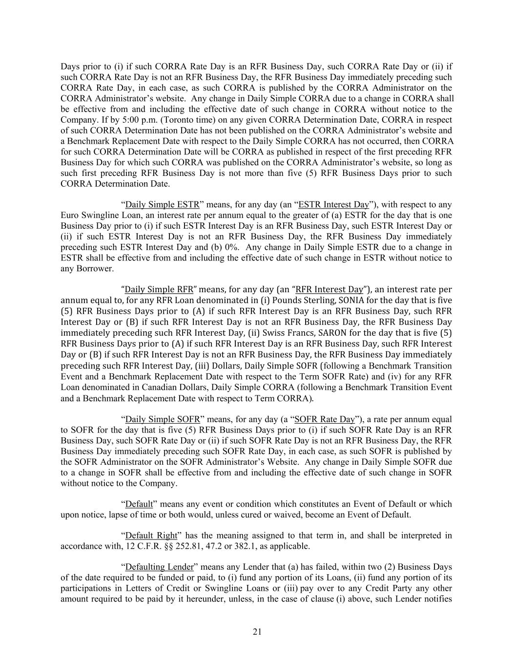 Days prior to (i) if such CORRA Rate Day is an RFR Business Day, such CORRA Rate Day or (ii) if such CORRA Rate Day is not an RFR Business Day, the RFR Business Day immediately preceding such CORRA Rate Day, in each case, as such CORRA is published by the CORRA Administrator on the CORRA Administrator’s website. Any change in Daily Simple CORRA due to a change in CORRA shall be effective from and including the effective date of such change in CORRA without notice to the Company. If by 5:00 p.m. (Toronto time) on any given CORRA Determination Date, CORRA in respect of such CORRA Determination Date has not been published on the CORRA Administrator’s website and a Benchmark Replacement Date with respect to the Daily Simple CORRA has not occurred, then CORRA for such CORRA Determination Date will be CORRA as published in respect of the first preceding RFR Business Day for which such CORRA was published on the CORRA Administrator’s website, so long as such first preceding RFR Business Day is not more than five (5) RFR Business Days prior to such CORRA Determination Date. “Daily Simple ESTR” means, for any day (an “ESTR Interest Day”), with respect to any Euro Swingline Loan, an interest rate per annum equal to the greater of (a) ESTR for the day that is one Business Day prior to (i) if such ESTR Interest Day is an RFR Business Day, such ESTR Interest Day or (ii) if such ESTR Interest Day is not an RFR Business Day, the RFR Business Day immediately preceding such ESTR Interest Day and (b) 0%. Any change in Daily Simple ESTR due to a change in ESTR shall be effective from and including the effective date of such change in ESTR without notice to any Borrower. “Daily Simple RFR” means, for any day (an “RFR Interest Day”), an interest rate perannum equal to, for any RFR Loan denominated in (i) Pounds Sterling, SONIA for the day that is five(5) RFR Business Days prior to (A) if such RFR Interest Day is an RFR Business Day, such RFRInterest Day or (B) if such RFR Interest Day is not an RFR Business Day, the RFR Business Dayimmediately preceding such RFR Interest Day, (ii) Swiss Francs, SARON for the day that is five (5)RFR Business Days prior to (A) if such RFR Interest Day is an RFR Business Day, such RFR InterestDay or (B) if such RFR Interest Day is not an RFR Business Day, the RFR Business Day immediatelypreceding such RFR Interest Day, (iii) Dollars, Daily Simple SOFR (following a Benchmark Transition Event and a Benchmark Replacement Date with respect to the Term SOFR Rate) and (iv) for any RFR Loan denominated in Canadian Dollars, Daily Simple CORRA (following a Benchmark Transition Event and a Benchmark Replacement Date with respect to Term CORRA). “Daily Simple SOFR” means, for any day (a “SOFR Rate Day”), a rate per annum equal to SOFR for the day that is five (5) RFR Business Days prior to (i) if such SOFR Rate Day is an RFR Business Day, such SOFR Rate Day or (ii) if such SOFR Rate Day is not an RFR Business Day, the RFR Business Day immediately preceding such SOFR Rate Day, in each case, as such SOFR is published by the SOFR Administrator on the SOFR Administrator’s Website. Any change in Daily Simple SOFR due to a change in SOFR shall be effective from and including the effective date of such change in SOFR without notice to the Company. “Default” means any event or condition which constitutes an Event of Default or which upon notice, lapse of time or both would, unless cured or waived, become an Event of Default. “Default Right” has the meaning assigned to that term in, and shall be interpreted in accordance with, 12 C.F.R. §§ 252.81, 47.2 or 382.1, as applicable. “Defaulting Lender” means any Lender that (a) has failed, within two (2) Business Days of the date required to be funded or paid, to (i) fund any portion of its Loans, (ii) fund any portion of its participations in Letters of Credit or Swingline Loans or (iii) pay over to any Credit Party any other amount required to be paid by it hereunder, unless, in the case of clause (i) above, such Lender notifies 21