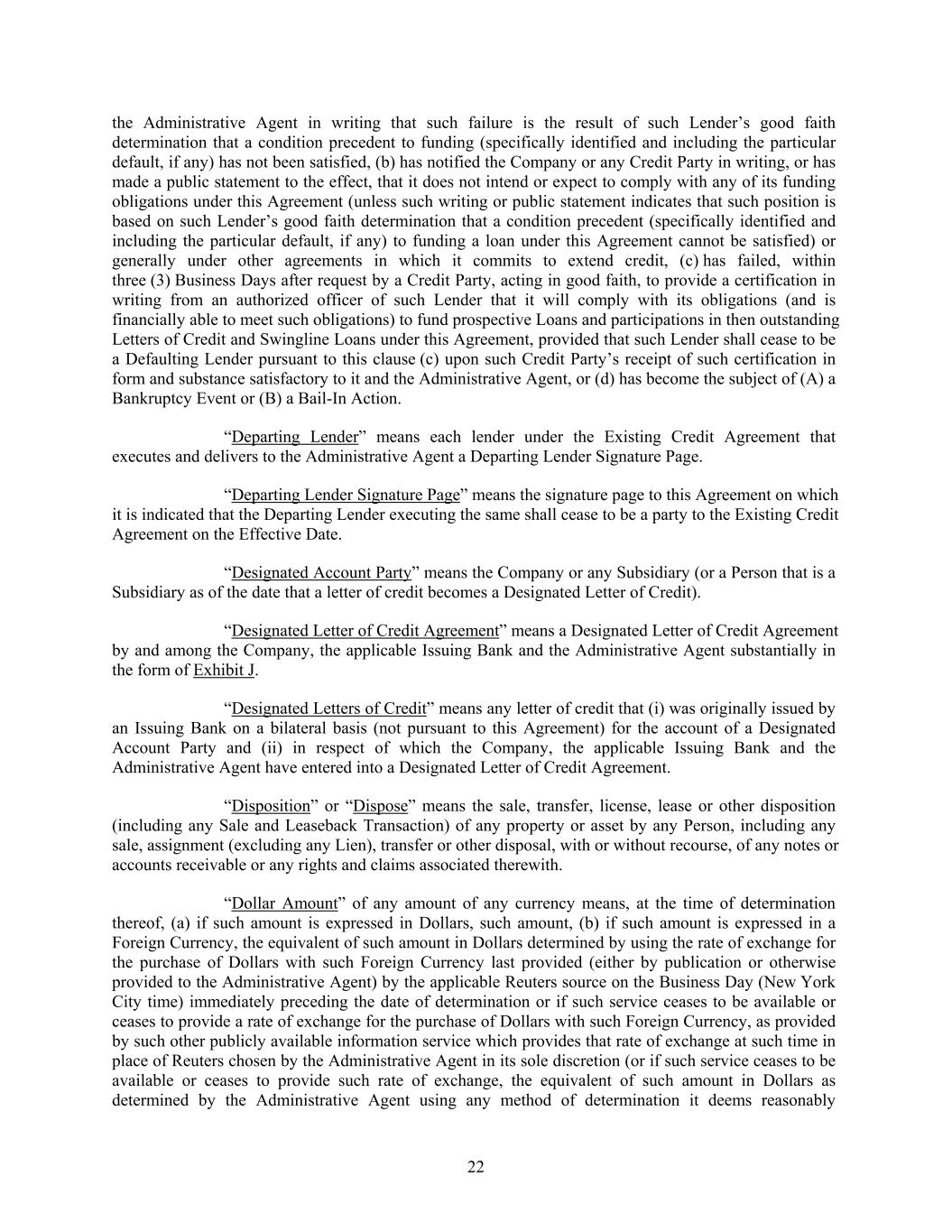 the Administrative Agent in writing that such failure is the result of such Lender’s good faith determination that a condition precedent to funding (specifically identified and including the particular default, if any) has not been satisfied, (b) has notified the Company or any Credit Party in writing, or has made a public statement to the effect, that it does not intend or expect to comply with any of its funding obligations under this Agreement (unless such writing or public statement indicates that such position is based on such Lender’s good faith determination that a condition precedent (specifically identified and including the particular default, if any) to funding a loan under this Agreement cannot be satisfied) or generally under other agreements in which it commits to extend credit, (c) has failed, within three (3) Business Days after request by a Credit Party, acting in good faith, to provide a certification in writing from an authorized officer of such Lender that it will comply with its obligations (and is financially able to meet such obligations) to fund prospective Loans and participations in then outstanding Letters of Credit and Swingline Loans under this Agreement, provided that such Lender shall cease to be a Defaulting Lender pursuant to this clause (c) upon such Credit Party’s receipt of such certification in form and substance satisfactory to it and the Administrative Agent, or (d) has become the subject of (A) a Bankruptcy Event or (B) a Bail-In Action. “Departing Lender” means each lender under the Existing Credit Agreement that executes and delivers to the Administrative Agent a Departing Lender Signature Page. “Departing Lender Signature Page” means the signature page to this Agreement on which it is indicated that the Departing Lender executing the same shall cease to be a party to the Existing Credit Agreement on the Effective Date. “Designated Account Party” means the Company or any Subsidiary (or a Person that is a Subsidiary as of the date that a letter of credit becomes a Designated Letter of Credit). “Designated Letter of Credit Agreement” means a Designated Letter of Credit Agreement by and among the Company, the applicable Issuing Bank and the Administrative Agent substantially in the form of Exhibit J. “Designated Letters of Credit” means any letter of credit that (i) was originally issued by an Issuing Bank on a bilateral basis (not pursuant to this Agreement) for the account of a Designated Account Party and (ii) in respect of which the Company, the applicable Issuing Bank and the Administrative Agent have entered into a Designated Letter of Credit Agreement. “Disposition” or “Dispose” means the sale, transfer, license, lease or other disposition (including any Sale and Leaseback Transaction) of any property or asset by any Person, including any sale, assignment (excluding any Lien), transfer or other disposal, with or without recourse, of any notes or accounts receivable or any rights and claims associated therewith. “Dollar Amount” of any amount of any currency means, at the time of determination thereof, (a) if such amount is expressed in Dollars, such amount, (b) if such amount is expressed in a Foreign Currency, the equivalent of such amount in Dollars determined by using the rate of exchange for the purchase of Dollars with such Foreign Currency last provided (either by publication or otherwise provided to the Administrative Agent) by the applicable Reuters source on the Business Day (New York City time) immediately preceding the date of determination or if such service ceases to be available or ceases to provide a rate of exchange for the purchase of Dollars with such Foreign Currency, as provided by such other publicly available information service which provides that rate of exchange at such time in place of Reuters chosen by the Administrative Agent in its sole discretion (or if such service ceases to be available or ceases to provide such rate of exchange, the equivalent of such amount in Dollars as determined by the Administrative Agent using any method of determination it deems reasonably 22