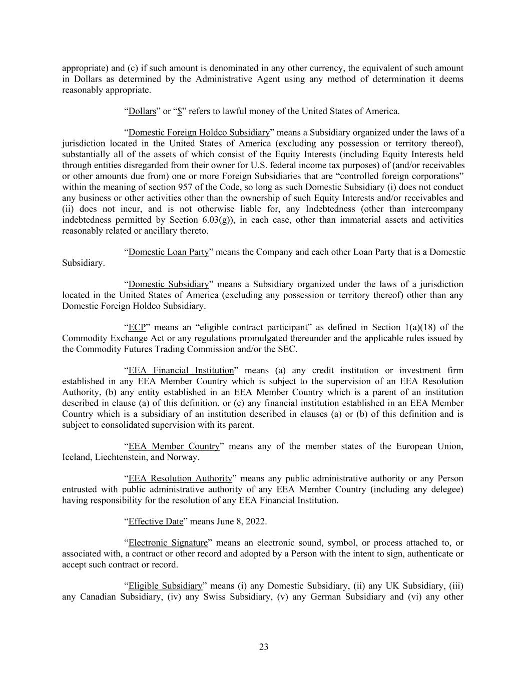 appropriate) and (c) if such amount is denominated in any other currency, the equivalent of such amount in Dollars as determined by the Administrative Agent using any method of determination it deems reasonably appropriate. “Dollars” or “$” refers to lawful money of the United States of America. “Domestic Foreign Holdco Subsidiary” means a Subsidiary organized under the laws of a jurisdiction located in the United States of America (excluding any possession or territory thereof), substantially all of the assets of which consist of the Equity Interests (including Equity Interests held through entities disregarded from their owner for U.S. federal income tax purposes) of (and/or receivables or other amounts due from) one or more Foreign Subsidiaries that are “controlled foreign corporations” within the meaning of section 957 of the Code, so long as such Domestic Subsidiary (i) does not conduct any business or other activities other than the ownership of such Equity Interests and/or receivables and (ii) does not incur, and is not otherwise liable for, any Indebtedness (other than intercompany indebtedness permitted by Section 6.03(g)), in each case, other than immaterial assets and activities reasonably related or ancillary thereto. “Domestic Loan Party” means the Company and each other Loan Party that is a Domestic Subsidiary. “Domestic Subsidiary” means a Subsidiary organized under the laws of a jurisdiction located in the United States of America (excluding any possession or territory thereof) other than any Domestic Foreign Holdco Subsidiary. “ECP” means an “eligible contract participant” as defined in Section 1(a)(18) of the Commodity Exchange Act or any regulations promulgated thereunder and the applicable rules issued by the Commodity Futures Trading Commission and/or the SEC. “EEA Financial Institution” means (a) any credit institution or investment firm established in any EEA Member Country which is subject to the supervision of an EEA Resolution Authority, (b) any entity established in an EEA Member Country which is a parent of an institution described in clause (a) of this definition, or (c) any financial institution established in an EEA Member Country which is a subsidiary of an institution described in clauses (a) or (b) of this definition and is subject to consolidated supervision with its parent. “EEA Member Country” means any of the member states of the European Union, Iceland, Liechtenstein, and Norway. “EEA Resolution Authority” means any public administrative authority or any Person entrusted with public administrative authority of any EEA Member Country (including any delegee) having responsibility for the resolution of any EEA Financial Institution. “Effective Date” means June 8, 2022. “Electronic Signature” means an electronic sound, symbol, or process attached to, or associated with, a contract or other record and adopted by a Person with the intent to sign, authenticate or accept such contract or record. “Eligible Subsidiary” means (i) any Domestic Subsidiary, (ii) any UK Subsidiary, (iii) any Canadian Subsidiary, (iv) any Swiss Subsidiary, (v) any German Subsidiary and (vi) any other 23