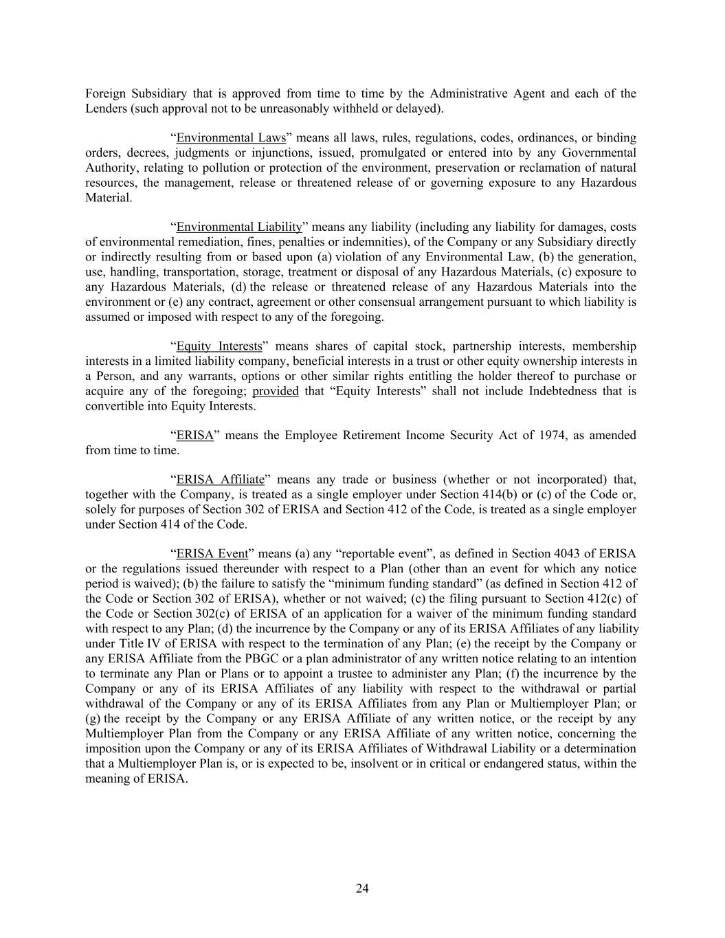 Foreign Subsidiary that is approved from time to time by the Administrative Agent and each of the Lenders (such approval not to be unreasonably withheld or delayed). “Environmental Laws” means all laws, rules, regulations, codes, ordinances, or binding orders, decrees, judgments or injunctions, issued, promulgated or entered into by any Governmental Authority, relating to pollution or protection of the environment, preservation or reclamation of natural resources, the management, release or threatened release of or governing exposure to any Hazardous Material. “Environmental Liability” means any liability (including any liability for damages, costs of environmental remediation, fines, penalties or indemnities), of the Company or any Subsidiary directly or indirectly resulting from or based upon (a) violation of any Environmental Law, (b) the generation, use, handling, transportation, storage, treatment or disposal of any Hazardous Materials, (c) exposure to any Hazardous Materials, (d) the release or threatened release of any Hazardous Materials into the environment or (e) any contract, agreement or other consensual arrangement pursuant to which liability is assumed or imposed with respect to any of the foregoing. “Equity Interests” means shares of capital stock, partnership interests, membership interests in a limited liability company, beneficial interests in a trust or other equity ownership interests in a Person, and any warrants, options or other similar rights entitling the holder thereof to purchase or acquire any of the foregoing; provided that “Equity Interests” shall not include Indebtedness that is convertible into Equity Interests. “ERISA” means the Employee Retirement Income Security Act of 1974, as amended from time to time. “ERISA Affiliate” means any trade or business (whether or not incorporated) that, together with the Company, is treated as a single employer under Section 414(b) or (c) of the Code or, solely for purposes of Section 302 of ERISA and Section 412 of the Code, is treated as a single employer under Section 414 of the Code. “ERISA Event” means (a) any “reportable event”, as defined in Section 4043 of ERISA or the regulations issued thereunder with respect to a Plan (other than an event for which any notice period is waived); (b) the failure to satisfy the “minimum funding standard” (as defined in Section 412 of the Code or Section 302 of ERISA), whether or not waived; (c) the filing pursuant to Section 412(c) of the Code or Section 302(c) of ERISA of an application for a waiver of the minimum funding standard with respect to any Plan; (d) the incurrence by the Company or any of its ERISA Affiliates of any liability under Title IV of ERISA with respect to the termination of any Plan; (e) the receipt by the Company or any ERISA Affiliate from the PBGC or a plan administrator of any written notice relating to an intention to terminate any Plan or Plans or to appoint a trustee to administer any Plan; (f) the incurrence by the Company or any of its ERISA Affiliates of any liability with respect to the withdrawal or partial withdrawal of the Company or any of its ERISA Affiliates from any Plan or Multiemployer Plan; or (g) the receipt by the Company or any ERISA Affiliate of any written notice, or the receipt by any Multiemployer Plan from the Company or any ERISA Affiliate of any written notice, concerning the imposition upon the Company or any of its ERISA Affiliates of Withdrawal Liability or a determination that a Multiemployer Plan is, or is expected to be, insolvent or in critical or endangered status, within the meaning of ERISA. 24