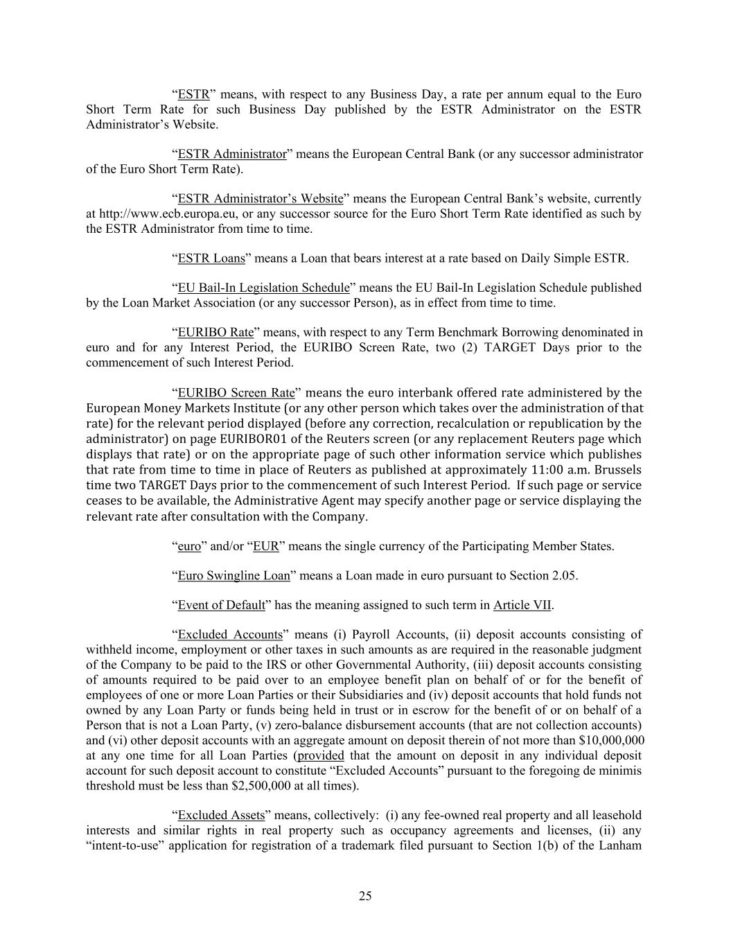“ESTR” means, with respect to any Business Day, a rate per annum equal to the Euro Short Term Rate for such Business Day published by the ESTR Administrator on the ESTR Administrator’s Website. “ESTR Administrator” means the European Central Bank (or any successor administrator of the Euro Short Term Rate). “ESTR Administrator’s Website” means the European Central Bank’s website, currently at http://www.ecb.europa.eu, or any successor source for the Euro Short Term Rate identified as such by the ESTR Administrator from time to time. “ESTR Loans” means a Loan that bears interest at a rate based on Daily Simple ESTR. “EU Bail-In Legislation Schedule” means the EU Bail-In Legislation Schedule published by the Loan Market Association (or any successor Person), as in effect from time to time. “EURIBO Rate” means, with respect to any Term Benchmark Borrowing denominated in euro and for any Interest Period, the EURIBO Screen Rate, two (2) TARGET Days prior to the commencement of such Interest Period. “EURIBO Screen Rate” means the euro interbank offered rate administered by theEuropean Money Markets Institute (or any other person which takes over the administration of thatrate) for the relevant period displayed (before any correction, recalculation or republication by theadministrator) on page EURIBOR01 of the Reuters screen (or any replacement Reuters page whichdisplays that rate) or on the appropriate page of such other information service which publishesthat rate from time to time in place of Reuters as published at approximately 11:00 a.m. Brusselstime two TARGET Days prior to the commencement of such Interest Period. If such page or serviceceases to be available, the Administrative Agent may specify another page or service displaying therelevant rate after consultation with the Company. “euro” and/or “EUR” means the single currency of the Participating Member States. “Euro Swingline Loan” means a Loan made in euro pursuant to Section 2.05. “Event of Default” has the meaning assigned to such term in Article VII. “Excluded Accounts” means (i) Payroll Accounts, (ii) deposit accounts consisting of withheld income, employment or other taxes in such amounts as are required in the reasonable judgment of the Company to be paid to the IRS or other Governmental Authority, (iii) deposit accounts consisting of amounts required to be paid over to an employee benefit plan on behalf of or for the benefit of employees of one or more Loan Parties or their Subsidiaries and (iv) deposit accounts that hold funds not owned by any Loan Party or funds being held in trust or in escrow for the benefit of or on behalf of a Person that is not a Loan Party, (v) zero-balance disbursement accounts (that are not collection accounts) and (vi) other deposit accounts with an aggregate amount on deposit therein of not more than $10,000,000 at any one time for all Loan Parties (provided that the amount on deposit in any individual deposit account for such deposit account to constitute “Excluded Accounts” pursuant to the foregoing de minimis threshold must be less than $2,500,000 at all times). “Excluded Assets” means, collectively: (i) any fee-owned real property and all leasehold interests and similar rights in real property such as occupancy agreements and licenses, (ii) any “intent-to-use” application for registration of a trademark filed pursuant to Section 1(b) of the Lanham 25