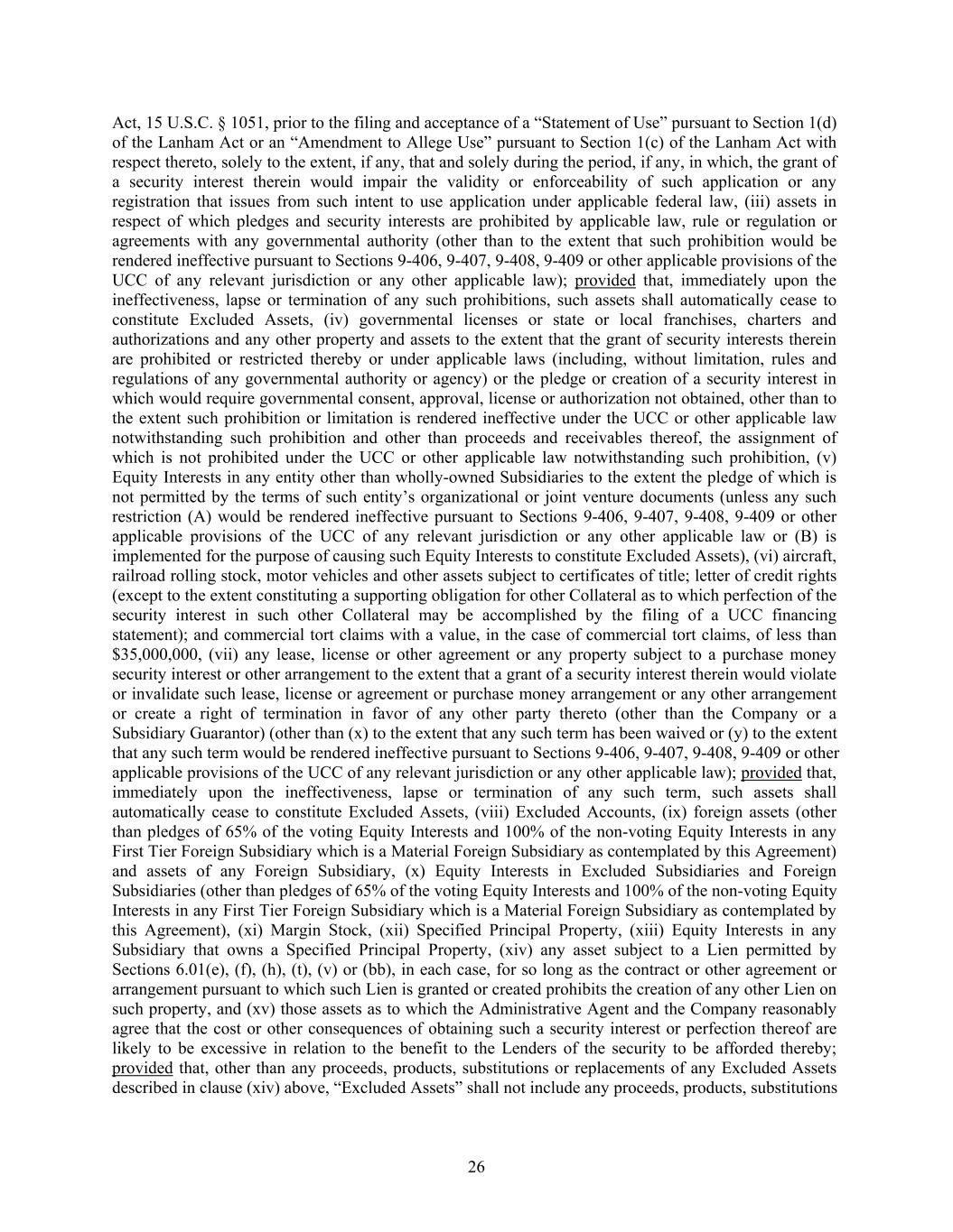 Act, 15 U.S.C. § 1051, prior to the filing and acceptance of a “Statement of Use” pursuant to Section 1(d) of the Lanham Act or an “Amendment to Allege Use” pursuant to Section 1(c) of the Lanham Act with respect thereto, solely to the extent, if any, that and solely during the period, if any, in which, the grant of a security interest therein would impair the validity or enforceability of such application or any registration that issues from such intent to use application under applicable federal law, (iii) assets in respect of which pledges and security interests are prohibited by applicable law, rule or regulation or agreements with any governmental authority (other than to the extent that such prohibition would be rendered ineffective pursuant to Sections 9-406, 9-407, 9-408, 9-409 or other applicable provisions of the UCC of any relevant jurisdiction or any other applicable law); provided that, immediately upon the ineffectiveness, lapse or termination of any such prohibitions, such assets shall automatically cease to constitute Excluded Assets, (iv) governmental licenses or state or local franchises, charters and authorizations and any other property and assets to the extent that the grant of security interests therein are prohibited or restricted thereby or under applicable laws (including, without limitation, rules and regulations of any governmental authority or agency) or the pledge or creation of a security interest in which would require governmental consent, approval, license or authorization not obtained, other than to the extent such prohibition or limitation is rendered ineffective under the UCC or other applicable law notwithstanding such prohibition and other than proceeds and receivables thereof, the assignment of which is not prohibited under the UCC or other applicable law notwithstanding such prohibition, (v) Equity Interests in any entity other than wholly-owned Subsidiaries to the extent the pledge of which is not permitted by the terms of such entity’s organizational or joint venture documents (unless any such restriction (A) would be rendered ineffective pursuant to Sections 9-406, 9-407, 9-408, 9-409 or other applicable provisions of the UCC of any relevant jurisdiction or any other applicable law or (B) is implemented for the purpose of causing such Equity Interests to constitute Excluded Assets), (vi) aircraft, railroad rolling stock, motor vehicles and other assets subject to certificates of title; letter of credit rights (except to the extent constituting a supporting obligation for other Collateral as to which perfection of the security interest in such other Collateral may be accomplished by the filing of a UCC financing statement); and commercial tort claims with a value, in the case of commercial tort claims, of less than $35,000,000, (vii) any lease, license or other agreement or any property subject to a purchase money security interest or other arrangement to the extent that a grant of a security interest therein would violate or invalidate such lease, license or agreement or purchase money arrangement or any other arrangement or create a right of termination in favor of any other party thereto (other than the Company or a Subsidiary Guarantor) (other than (x) to the extent that any such term has been waived or (y) to the extent that any such term would be rendered ineffective pursuant to Sections 9-406, 9-407, 9-408, 9-409 or other applicable provisions of the UCC of any relevant jurisdiction or any other applicable law); provided that, immediately upon the ineffectiveness, lapse or termination of any such term, such assets shall automatically cease to constitute Excluded Assets, (viii) Excluded Accounts, (ix) foreign assets (other than pledges of 65% of the voting Equity Interests and 100% of the non-voting Equity Interests in any First Tier Foreign Subsidiary which is a Material Foreign Subsidiary as contemplated by this Agreement) and assets of any Foreign Subsidiary, (x) Equity Interests in Excluded Subsidiaries and Foreign Subsidiaries (other than pledges of 65% of the voting Equity Interests and 100% of the non-voting Equity Interests in any First Tier Foreign Subsidiary which is a Material Foreign Subsidiary as contemplated by this Agreement), (xi) Margin Stock, (xii) Specified Principal Property, (xiii) Equity Interests in any Subsidiary that owns a Specified Principal Property, (xiv) any asset subject to a Lien permitted by Sections 6.01(e), (f), (h), (t), (v) or (bb), in each case, for so long as the contract or other agreement or arrangement pursuant to which such Lien is granted or created prohibits the creation of any other Lien on such property, and (xv) those assets as to which the Administrative Agent and the Company reasonably agree that the cost or other consequences of obtaining such a security interest or perfection thereof are likely to be excessive in relation to the benefit to the Lenders of the security to be afforded thereby; provided that, other than any proceeds, products, substitutions or replacements of any Excluded Assets described in clause (xiv) above, “Excluded Assets” shall not include any proceeds, products, substitutions 26