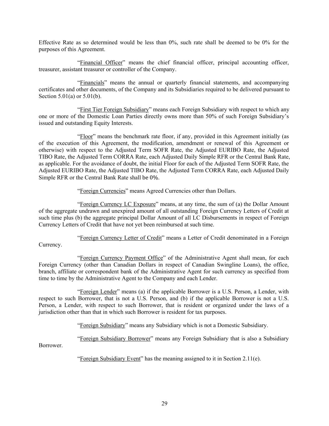 Effective Rate as so determined would be less than 0%, such rate shall be deemed to be 0% for the purposes of this Agreement. “Financial Officer” means the chief financial officer, principal accounting officer, treasurer, assistant treasurer or controller of the Company. “Financials” means the annual or quarterly financial statements, and accompanying certificates and other documents, of the Company and its Subsidiaries required to be delivered pursuant to Section 5.01(a) or 5.01(b). “First Tier Foreign Subsidiary” means each Foreign Subsidiary with respect to which any one or more of the Domestic Loan Parties directly owns more than 50% of such Foreign Subsidiary’s issued and outstanding Equity Interests. “Floor” means the benchmark rate floor, if any, provided in this Agreement initially (as of the execution of this Agreement, the modification, amendment or renewal of this Agreement or otherwise) with respect to the Adjusted Term SOFR Rate, the Adjusted EURIBO Rate, the Adjusted TIBO Rate, the Adjusted Term CORRA Rate, each Adjusted Daily Simple RFR or the Central Bank Rate, as applicable. For the avoidance of doubt, the initial Floor for each of the Adjusted Term SOFR Rate, the Adjusted EURIBO Rate, the Adjusted TIBO Rate, the Adjusted Term CORRA Rate, each Adjusted Daily Simple RFR or the Central Bank Rate shall be 0%. “Foreign Currencies” means Agreed Currencies other than Dollars. “Foreign Currency LC Exposure” means, at any time, the sum of (a) the Dollar Amount of the aggregate undrawn and unexpired amount of all outstanding Foreign Currency Letters of Credit at such time plus (b) the aggregate principal Dollar Amount of all LC Disbursements in respect of Foreign Currency Letters of Credit that have not yet been reimbursed at such time. “Foreign Currency Letter of Credit” means a Letter of Credit denominated in a Foreign Currency. “Foreign Currency Payment Office” of the Administrative Agent shall mean, for each Foreign Currency (other than Canadian Dollars in respect of Canadian Swingline Loans), the office, branch, affiliate or correspondent bank of the Administrative Agent for such currency as specified from time to time by the Administrative Agent to the Company and each Lender. “Foreign Lender” means (a) if the applicable Borrower is a U.S. Person, a Lender, with respect to such Borrower, that is not a U.S. Person, and (b) if the applicable Borrower is not a U.S. Person, a Lender, with respect to such Borrower, that is resident or organized under the laws of a jurisdiction other than that in which such Borrower is resident for tax purposes. “Foreign Subsidiary” means any Subsidiary which is not a Domestic Subsidiary. “Foreign Subsidiary Borrower” means any Foreign Subsidiary that is also a Subsidiary Borrower. “Foreign Subsidiary Event” has the meaning assigned to it in Section 2.11(e). 29