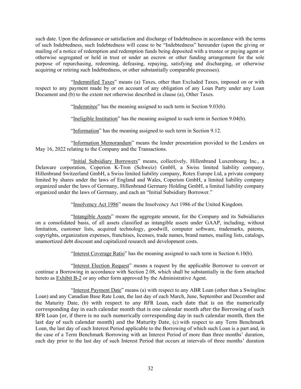 such date. Upon the defeasance or satisfaction and discharge of Indebtedness in accordance with the terms of such Indebtedness, such Indebtedness will cease to be “Indebtedness” hereunder (upon the giving or mailing of a notice of redemption and redemption funds being deposited with a trustee or paying agent or otherwise segregated or held in trust or under an escrow or other funding arrangement for the sole purpose of repurchasing, redeeming, defeasing, repaying, satisfying and discharging, or otherwise acquiring or retiring such Indebtedness, or other substantially comparable processes). “Indemnified Taxes” means (a) Taxes, other than Excluded Taxes, imposed on or with respect to any payment made by or on account of any obligation of any Loan Party under any Loan Document and (b) to the extent not otherwise described in clause (a), Other Taxes. “Indemnitee” has the meaning assigned to such term in Section 9.03(b). “Ineligible Institution” has the meaning assigned to such term in Section 9.04(b). “Information” has the meaning assigned to such term in Section 9.12. “Information Memorandum” means the lender presentation provided to the Lenders on May 16, 2022 relating to the Company and the Transactions. “Initial Subsidiary Borrowers” means, collectively, Hillenbrand Luxembourg Inc., a Delaware corporation, Coperion K-Tron (Schweiz) GmbH, a Swiss limited liability company, Hillenbrand Switzerland GmbH, a Swiss limited liability company, Rotex Europe Ltd, a private company limited by shares under the laws of England and Wales, Coperion GmbH, a limited liability company organized under the laws of Germany, Hillenbrand Germany Holding GmbH, a limited liability company organized under the laws of Germany, and each an “Initial Subsidiary Borrower.” “Insolvency Act 1986” means the Insolvency Act 1986 of the United Kingdom. “Intangible Assets” means the aggregate amount, for the Company and its Subsidiaries on a consolidated basis, of all assets classified as intangible assets under GAAP, including, without limitation, customer lists, acquired technology, goodwill, computer software, trademarks, patents, copyrights, organization expenses, franchises, licenses, trade names, brand names, mailing lists, catalogs, unamortized debt discount and capitalized research and development costs. “Interest Coverage Ratio” has the meaning assigned to such term in Section 6.10(b). “Interest Election Request” means a request by the applicable Borrower to convert or continue a Borrowing in accordance with Section 2.08, which shall be substantially in the form attached hereto as Exhibit B-2 or any other form approved by the Administrative Agent. “Interest Payment Date” means (a) with respect to any ABR Loan (other than a Swingline Loan) and any Canadian Base Rate Loan, the last day of each March, June, September and December and the Maturity Date, (b) with respect to any RFR Loan, each date that is on the numericallycorresponding day in each calendar month that is one calendar month after the Borrowing of suchRFR Loan (or, if there is no such numerically corresponding day in such calendar month, then thelast day of such calendar month) and the Maturity Date, (c) with respect to any Term Benchmark Loan, the last day of each Interest Period applicable to the Borrowing of which such Loan is a part and, in the case of a Term Benchmark Borrowing with an Interest Period of more than three months’ duration, each day prior to the last day of such Interest Period that occurs at intervals of three months’ duration 32