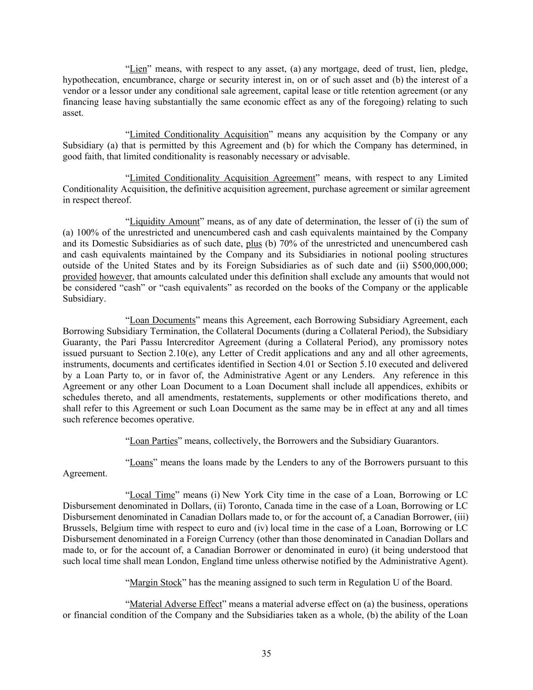 “Lien” means, with respect to any asset, (a) any mortgage, deed of trust, lien, pledge, hypothecation, encumbrance, charge or security interest in, on or of such asset and (b) the interest of a vendor or a lessor under any conditional sale agreement, capital lease or title retention agreement (or any financing lease having substantially the same economic effect as any of the foregoing) relating to such asset. “Limited Conditionality Acquisition” means any acquisition by the Company or any Subsidiary (a) that is permitted by this Agreement and (b) for which the Company has determined, in good faith, that limited conditionality is reasonably necessary or advisable. “Limited Conditionality Acquisition Agreement” means, with respect to any Limited Conditionality Acquisition, the definitive acquisition agreement, purchase agreement or similar agreement in respect thereof. “Liquidity Amount” means, as of any date of determination, the lesser of (i) the sum of (a) 100% of the unrestricted and unencumbered cash and cash equivalents maintained by the Company and its Domestic Subsidiaries as of such date, plus (b) 70% of the unrestricted and unencumbered cash and cash equivalents maintained by the Company and its Subsidiaries in notional pooling structures outside of the United States and by its Foreign Subsidiaries as of such date and (ii) $500,000,000; provided however, that amounts calculated under this definition shall exclude any amounts that would not be considered “cash” or “cash equivalents” as recorded on the books of the Company or the applicable Subsidiary. “Loan Documents” means this Agreement, each Borrowing Subsidiary Agreement, each Borrowing Subsidiary Termination, the Collateral Documents (during a Collateral Period), the Subsidiary Guaranty, the Pari Passu Intercreditor Agreement (during a Collateral Period), any promissory notes issued pursuant to Section 2.10(e), any Letter of Credit applications and any and all other agreements, instruments, documents and certificates identified in Section 4.01 or Section 5.10 executed and delivered by a Loan Party to, or in favor of, the Administrative Agent or any Lenders. Any reference in this Agreement or any other Loan Document to a Loan Document shall include all appendices, exhibits or schedules thereto, and all amendments, restatements, supplements or other modifications thereto, and shall refer to this Agreement or such Loan Document as the same may be in effect at any and all times such reference becomes operative. “Loan Parties” means, collectively, the Borrowers and the Subsidiary Guarantors. “Loans” means the loans made by the Lenders to any of the Borrowers pursuant to this Agreement. “Local Time” means (i) New York City time in the case of a Loan, Borrowing or LC Disbursement denominated in Dollars, (ii) Toronto, Canada time in the case of a Loan, Borrowing or LC Disbursement denominated in Canadian Dollars made to, or for the account of, a Canadian Borrower, (iii) Brussels, Belgium time with respect to euro and (iv) local time in the case of a Loan, Borrowing or LC Disbursement denominated in a Foreign Currency (other than those denominated in Canadian Dollars and made to, or for the account of, a Canadian Borrower or denominated in euro) (it being understood that such local time shall mean London, England time unless otherwise notified by the Administrative Agent). “Margin Stock” has the meaning assigned to such term in Regulation U of the Board. “Material Adverse Effect” means a material adverse effect on (a) the business, operations or financial condition of the Company and the Subsidiaries taken as a whole, (b) the ability of the Loan 35