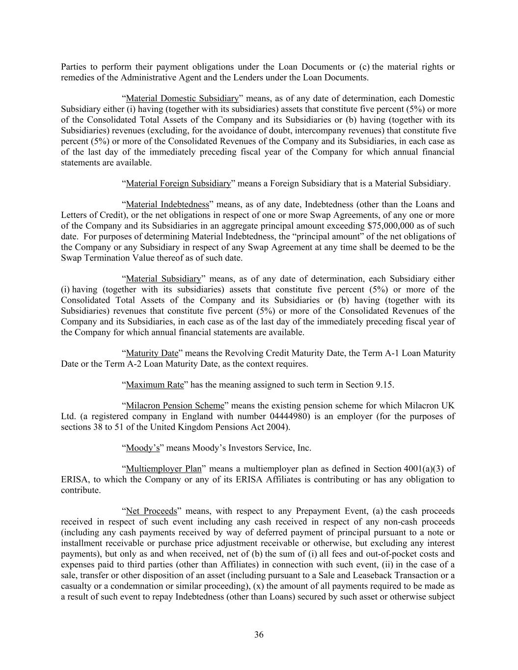 Parties to perform their payment obligations under the Loan Documents or (c) the material rights or remedies of the Administrative Agent and the Lenders under the Loan Documents. “Material Domestic Subsidiary” means, as of any date of determination, each Domestic Subsidiary either (i) having (together with its subsidiaries) assets that constitute five percent (5%) or more of the Consolidated Total Assets of the Company and its Subsidiaries or (b) having (together with its Subsidiaries) revenues (excluding, for the avoidance of doubt, intercompany revenues) that constitute five percent (5%) or more of the Consolidated Revenues of the Company and its Subsidiaries, in each case as of the last day of the immediately preceding fiscal year of the Company for which annual financial statements are available. “Material Foreign Subsidiary” means a Foreign Subsidiary that is a Material Subsidiary. “Material Indebtedness” means, as of any date, Indebtedness (other than the Loans and Letters of Credit), or the net obligations in respect of one or more Swap Agreements, of any one or more of the Company and its Subsidiaries in an aggregate principal amount exceeding $75,000,000 as of such date. For purposes of determining Material Indebtedness, the “principal amount” of the net obligations of the Company or any Subsidiary in respect of any Swap Agreement at any time shall be deemed to be the Swap Termination Value thereof as of such date. “Material Subsidiary” means, as of any date of determination, each Subsidiary either (i) having (together with its subsidiaries) assets that constitute five percent (5%) or more of the Consolidated Total Assets of the Company and its Subsidiaries or (b) having (together with its Subsidiaries) revenues that constitute five percent (5%) or more of the Consolidated Revenues of the Company and its Subsidiaries, in each case as of the last day of the immediately preceding fiscal year of the Company for which annual financial statements are available. “Maturity Date” means the Revolving Credit Maturity Date, the Term A-1 Loan Maturity Date or the Term A-2 Loan Maturity Date, as the context requires. “Maximum Rate” has the meaning assigned to such term in Section 9.15. “Milacron Pension Scheme” means the existing pension scheme for which Milacron UK Ltd. (a registered company in England with number 04444980) is an employer (for the purposes of sections 38 to 51 of the United Kingdom Pensions Act 2004). “Moody’s” means Moody’s Investors Service, Inc. “Multiemployer Plan” means a multiemployer plan as defined in Section 4001(a)(3) of ERISA, to which the Company or any of its ERISA Affiliates is contributing or has any obligation to contribute. “Net Proceeds” means, with respect to any Prepayment Event, (a) the cash proceeds received in respect of such event including any cash received in respect of any non-cash proceeds (including any cash payments received by way of deferred payment of principal pursuant to a note or installment receivable or purchase price adjustment receivable or otherwise, but excluding any interest payments), but only as and when received, net of (b) the sum of (i) all fees and out-of-pocket costs and expenses paid to third parties (other than Affiliates) in connection with such event, (ii) in the case of a sale, transfer or other disposition of an asset (including pursuant to a Sale and Leaseback Transaction or a casualty or a condemnation or similar proceeding), (x) the amount of all payments required to be made as a result of such event to repay Indebtedness (other than Loans) secured by such asset or otherwise subject 36
