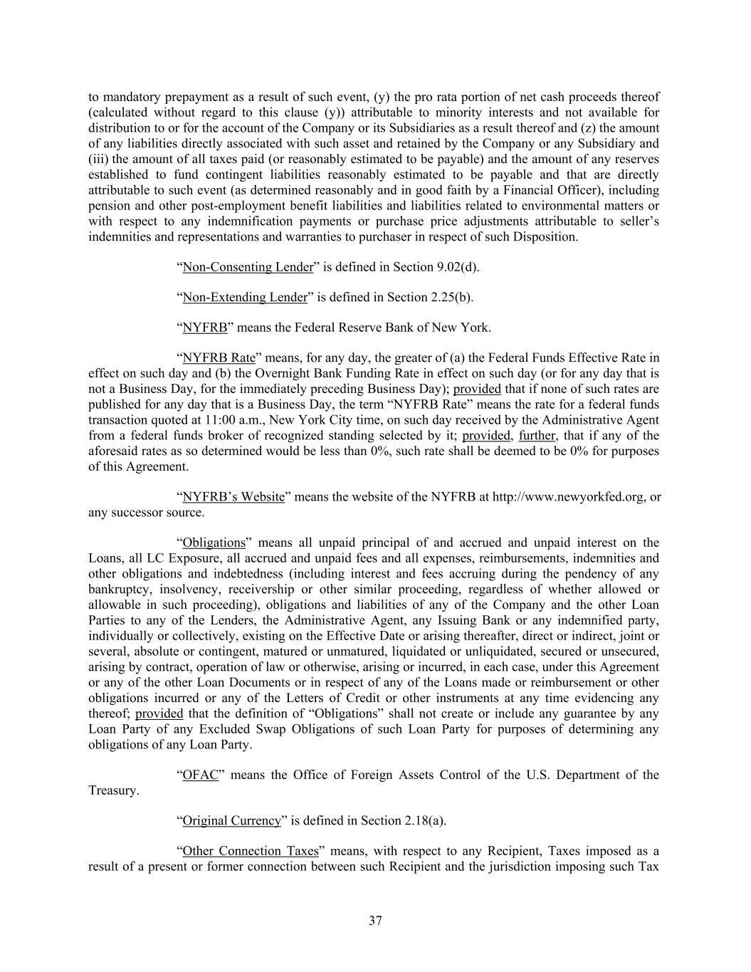 to mandatory prepayment as a result of such event, (y) the pro rata portion of net cash proceeds thereof (calculated without regard to this clause (y)) attributable to minority interests and not available for distribution to or for the account of the Company or its Subsidiaries as a result thereof and (z) the amount of any liabilities directly associated with such asset and retained by the Company or any Subsidiary and (iii) the amount of all taxes paid (or reasonably estimated to be payable) and the amount of any reserves established to fund contingent liabilities reasonably estimated to be payable and that are directly attributable to such event (as determined reasonably and in good faith by a Financial Officer), including pension and other post-employment benefit liabilities and liabilities related to environmental matters or with respect to any indemnification payments or purchase price adjustments attributable to seller’s indemnities and representations and warranties to purchaser in respect of such Disposition. “Non-Consenting Lender” is defined in Section 9.02(d). “Non-Extending Lender” is defined in Section 2.25(b). “NYFRB” means the Federal Reserve Bank of New York. “NYFRB Rate” means, for any day, the greater of (a) the Federal Funds Effective Rate in effect on such day and (b) the Overnight Bank Funding Rate in effect on such day (or for any day that is not a Business Day, for the immediately preceding Business Day); provided that if none of such rates are published for any day that is a Business Day, the term “NYFRB Rate” means the rate for a federal funds transaction quoted at 11:00 a.m., New York City time, on such day received by the Administrative Agent from a federal funds broker of recognized standing selected by it; provided, further, that if any of the aforesaid rates as so determined would be less than 0%, such rate shall be deemed to be 0% for purposes of this Agreement. “NYFRB’s Website” means the website of the NYFRB at http://www.newyorkfed.org, or any successor source. “Obligations” means all unpaid principal of and accrued and unpaid interest on the Loans, all LC Exposure, all accrued and unpaid fees and all expenses, reimbursements, indemnities and other obligations and indebtedness (including interest and fees accruing during the pendency of any bankruptcy, insolvency, receivership or other similar proceeding, regardless of whether allowed or allowable in such proceeding), obligations and liabilities of any of the Company and the other Loan Parties to any of the Lenders, the Administrative Agent, any Issuing Bank or any indemnified party, individually or collectively, existing on the Effective Date or arising thereafter, direct or indirect, joint or several, absolute or contingent, matured or unmatured, liquidated or unliquidated, secured or unsecured, arising by contract, operation of law or otherwise, arising or incurred, in each case, under this Agreement or any of the other Loan Documents or in respect of any of the Loans made or reimbursement or other obligations incurred or any of the Letters of Credit or other instruments at any time evidencing any thereof; provided that the definition of “Obligations” shall not create or include any guarantee by any Loan Party of any Excluded Swap Obligations of such Loan Party for purposes of determining any obligations of any Loan Party. “OFAC” means the Office of Foreign Assets Control of the U.S. Department of the Treasury. “Original Currency” is defined in Section 2.18(a). “Other Connection Taxes” means, with respect to any Recipient, Taxes imposed as a result of a present or former connection between such Recipient and the jurisdiction imposing such Tax 37