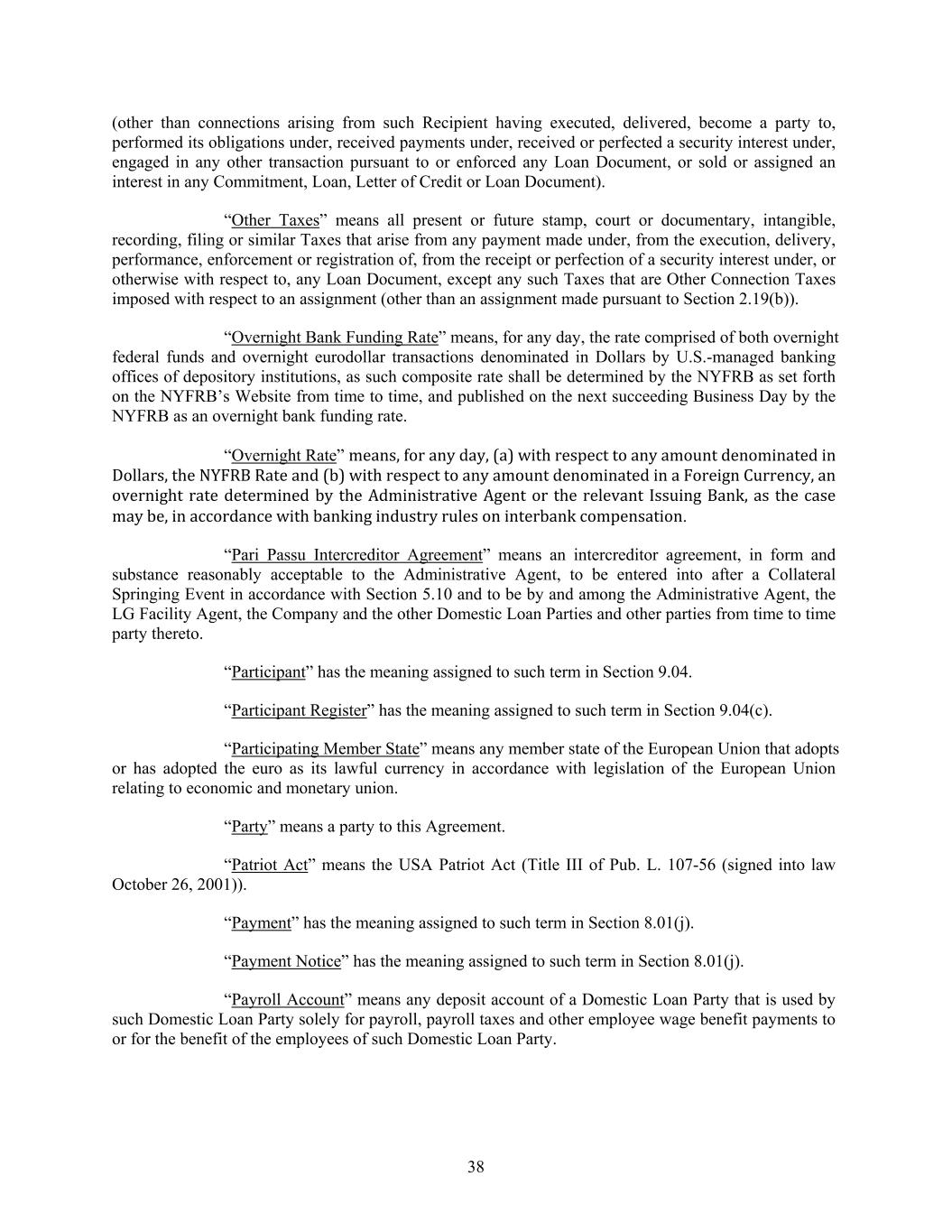 (other than connections arising from such Recipient having executed, delivered, become a party to, performed its obligations under, received payments under, received or perfected a security interest under, engaged in any other transaction pursuant to or enforced any Loan Document, or sold or assigned an interest in any Commitment, Loan, Letter of Credit or Loan Document). “Other Taxes” means all present or future stamp, court or documentary, intangible, recording, filing or similar Taxes that arise from any payment made under, from the execution, delivery, performance, enforcement or registration of, from the receipt or perfection of a security interest under, or otherwise with respect to, any Loan Document, except any such Taxes that are Other Connection Taxes imposed with respect to an assignment (other than an assignment made pursuant to Section 2.19(b)). “Overnight Bank Funding Rate” means, for any day, the rate comprised of both overnight federal funds and overnight eurodollar transactions denominated in Dollars by U.S.-managed banking offices of depository institutions, as such composite rate shall be determined by the NYFRB as set forth on the NYFRB’s Website from time to time, and published on the next succeeding Business Day by the NYFRB as an overnight bank funding rate. “Overnight Rate” means, for any day, (a) with respect to any amount denominated inDollars, the NYFRB Rate and (b) with respect to any amount denominated in a Foreign Currency, anovernight rate determined by the Administrative Agent or the relevant Issuing Bank, as the casemay be, in accordance with banking industry rules on interbank compensation. “Pari Passu Intercreditor Agreement” means an intercreditor agreement, in form and substance reasonably acceptable to the Administrative Agent, to be entered into after a Collateral Springing Event in accordance with Section 5.10 and to be by and among the Administrative Agent, the LG Facility Agent, the Company and the other Domestic Loan Parties and other parties from time to time party thereto. “Participant” has the meaning assigned to such term in Section 9.04. “Participant Register” has the meaning assigned to such term in Section 9.04(c). “Participating Member State” means any member state of the European Union that adopts or has adopted the euro as its lawful currency in accordance with legislation of the European Union relating to economic and monetary union. “Party” means a party to this Agreement. “Patriot Act” means the USA Patriot Act (Title III of Pub. L. 107-56 (signed into law October 26, 2001)). “Payment” has the meaning assigned to such term in Section 8.01(j). “Payment Notice” has the meaning assigned to such term in Section 8.01(j). “Payroll Account” means any deposit account of a Domestic Loan Party that is used by such Domestic Loan Party solely for payroll, payroll taxes and other employee wage benefit payments to or for the benefit of the employees of such Domestic Loan Party. 38